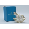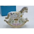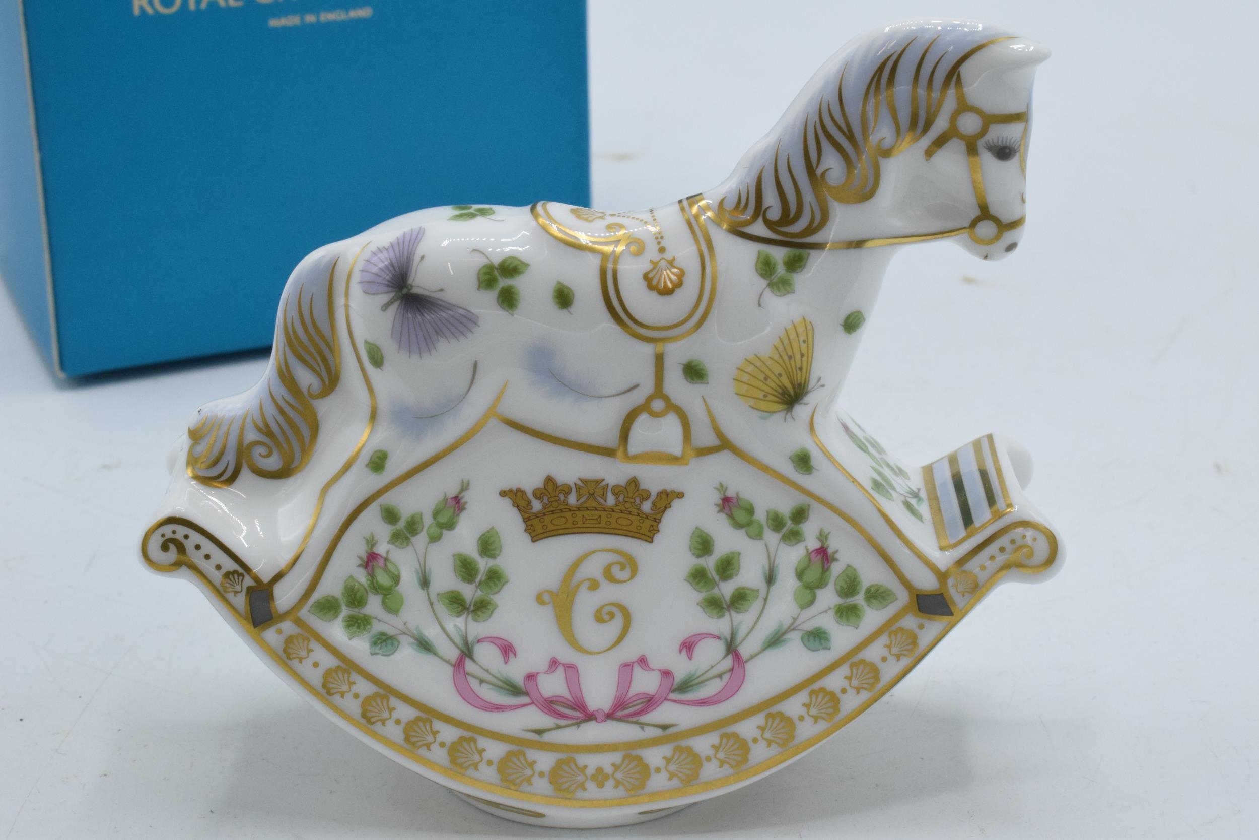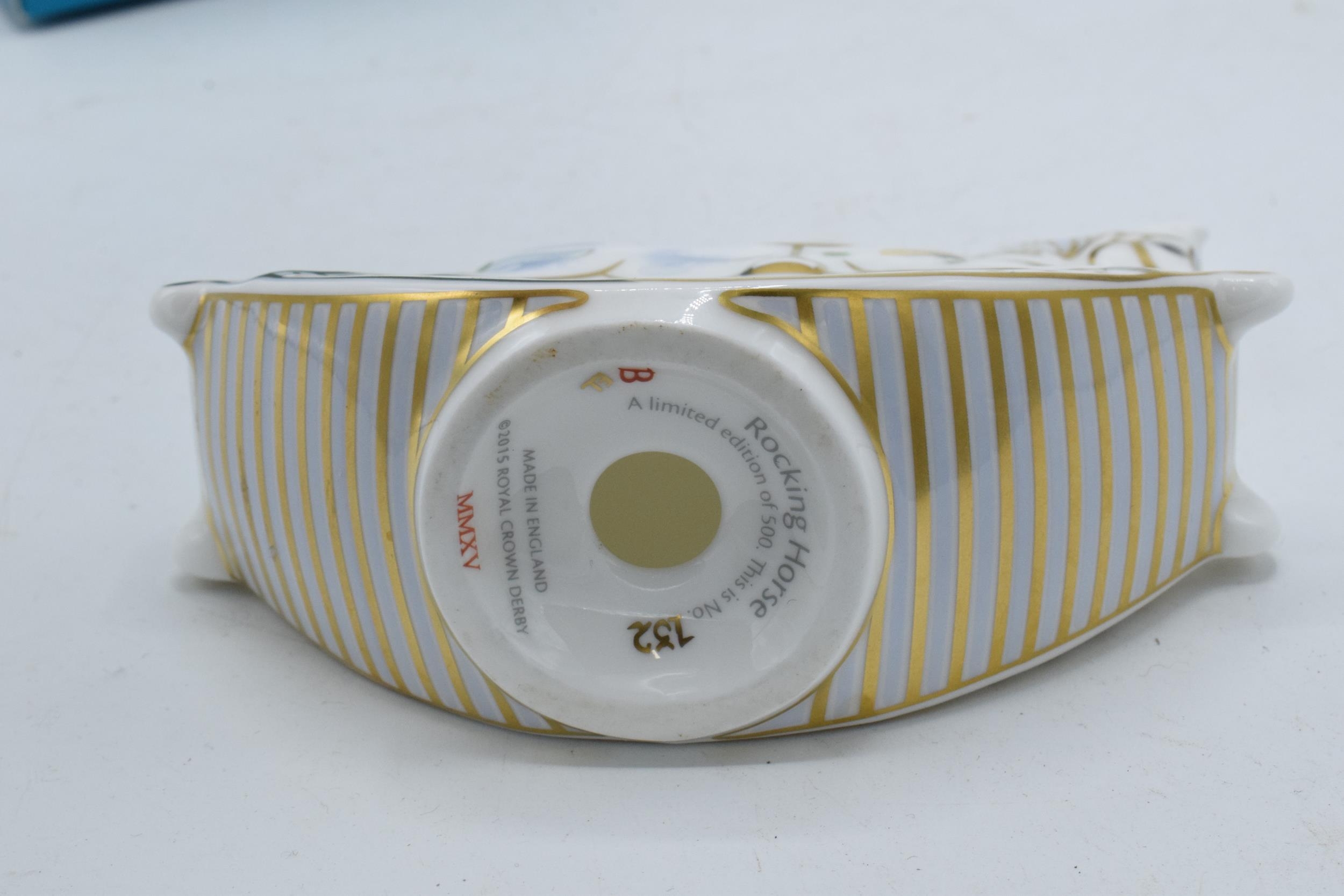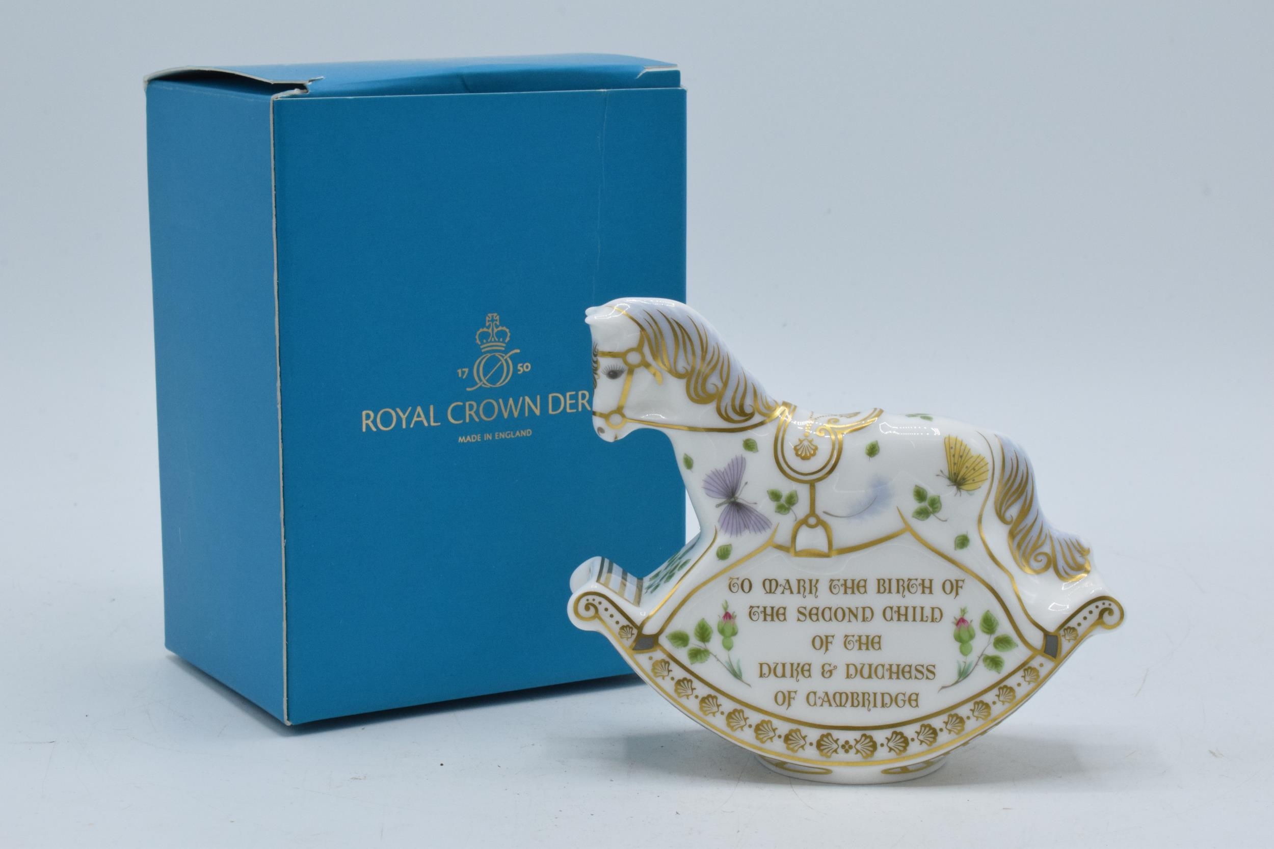 Boxed Royal Crown Derby miniature paperweight, Royal Baby Rocking Horse, 10cm high, this is number 132 of a limited edition of 500 to celebrate the birth of HRH Princess Charlotte of Cambridge, 2nd May 2015, grey printed marks on the base, certificate, boxed.