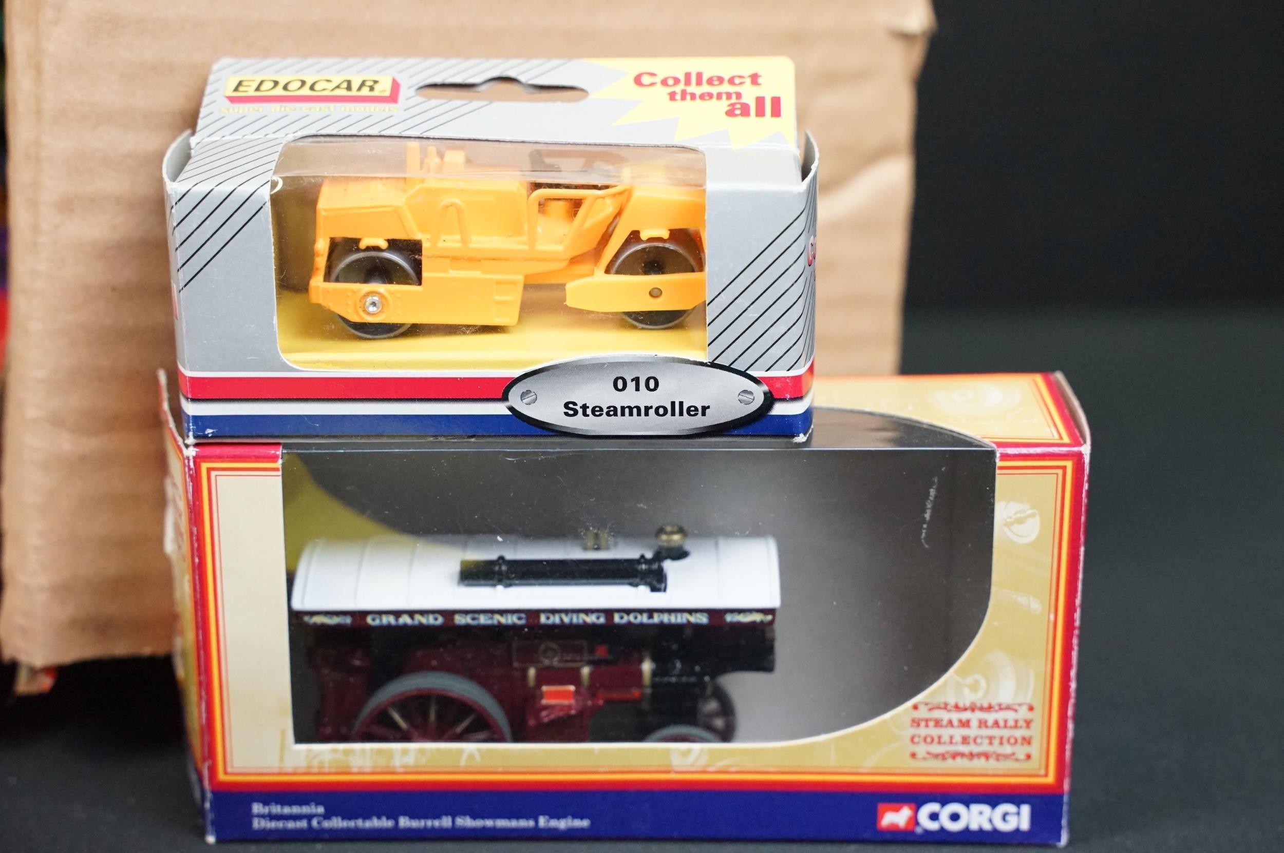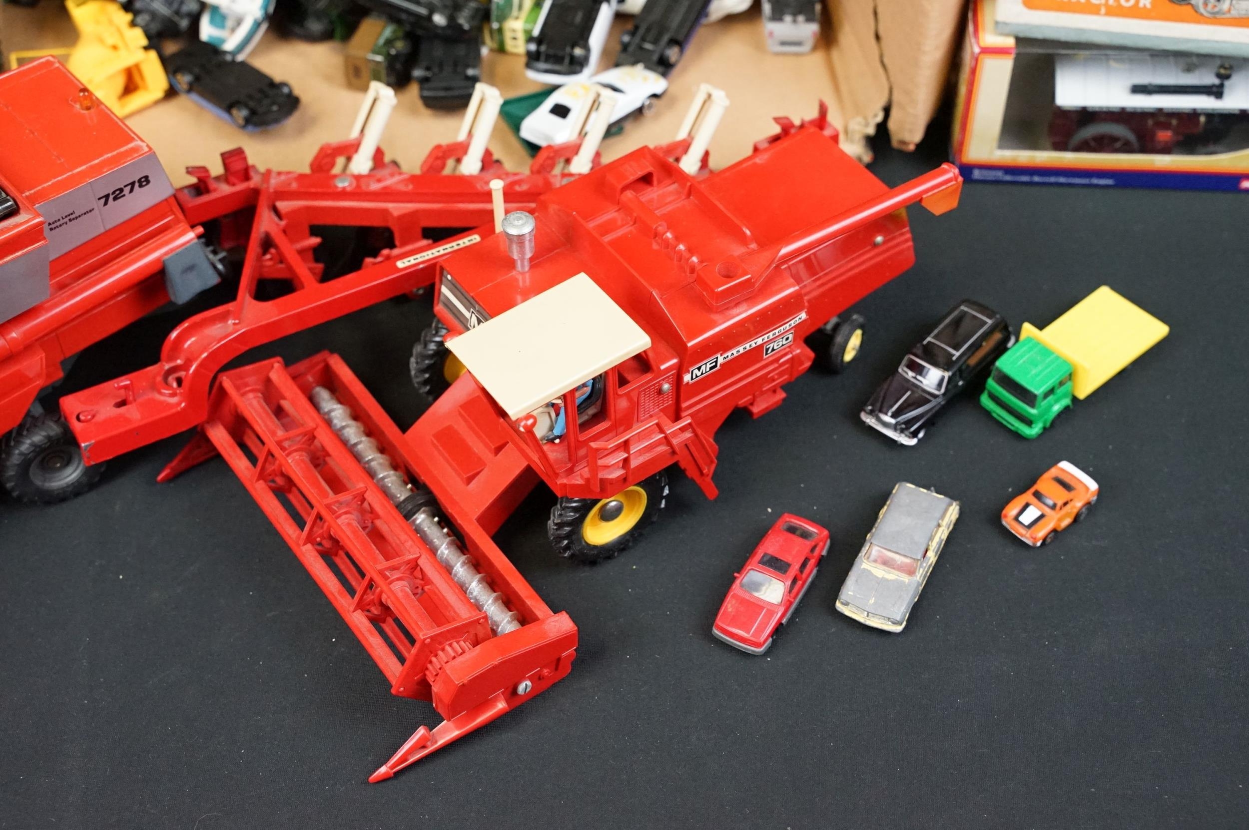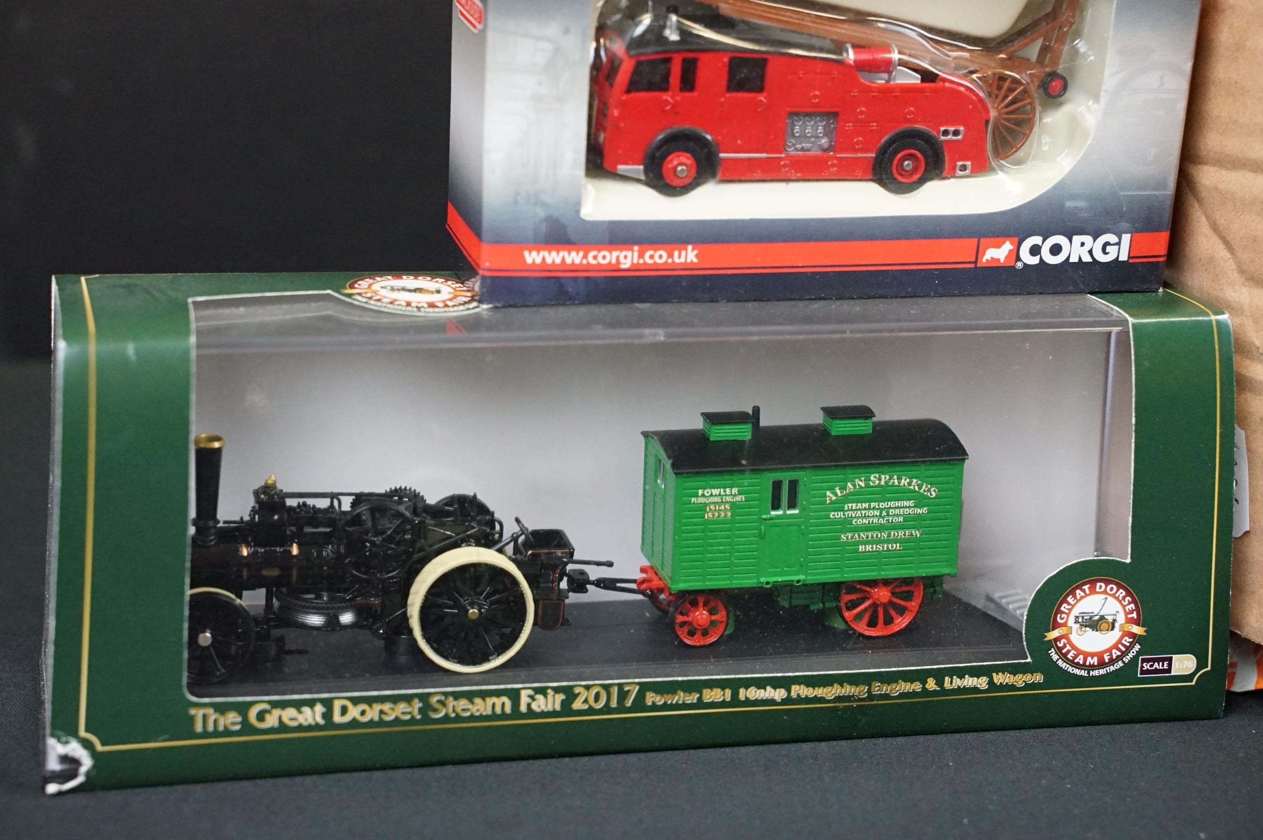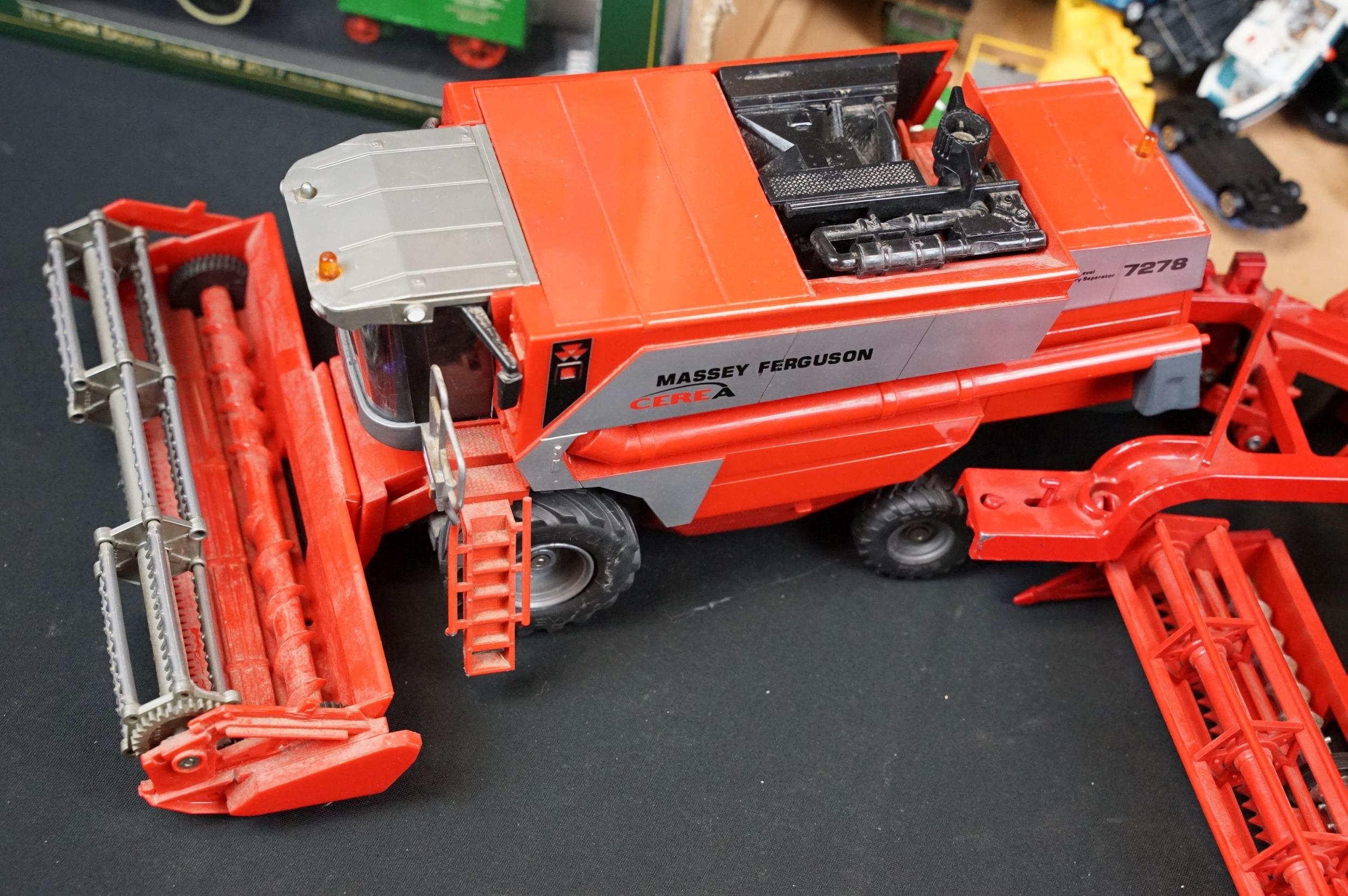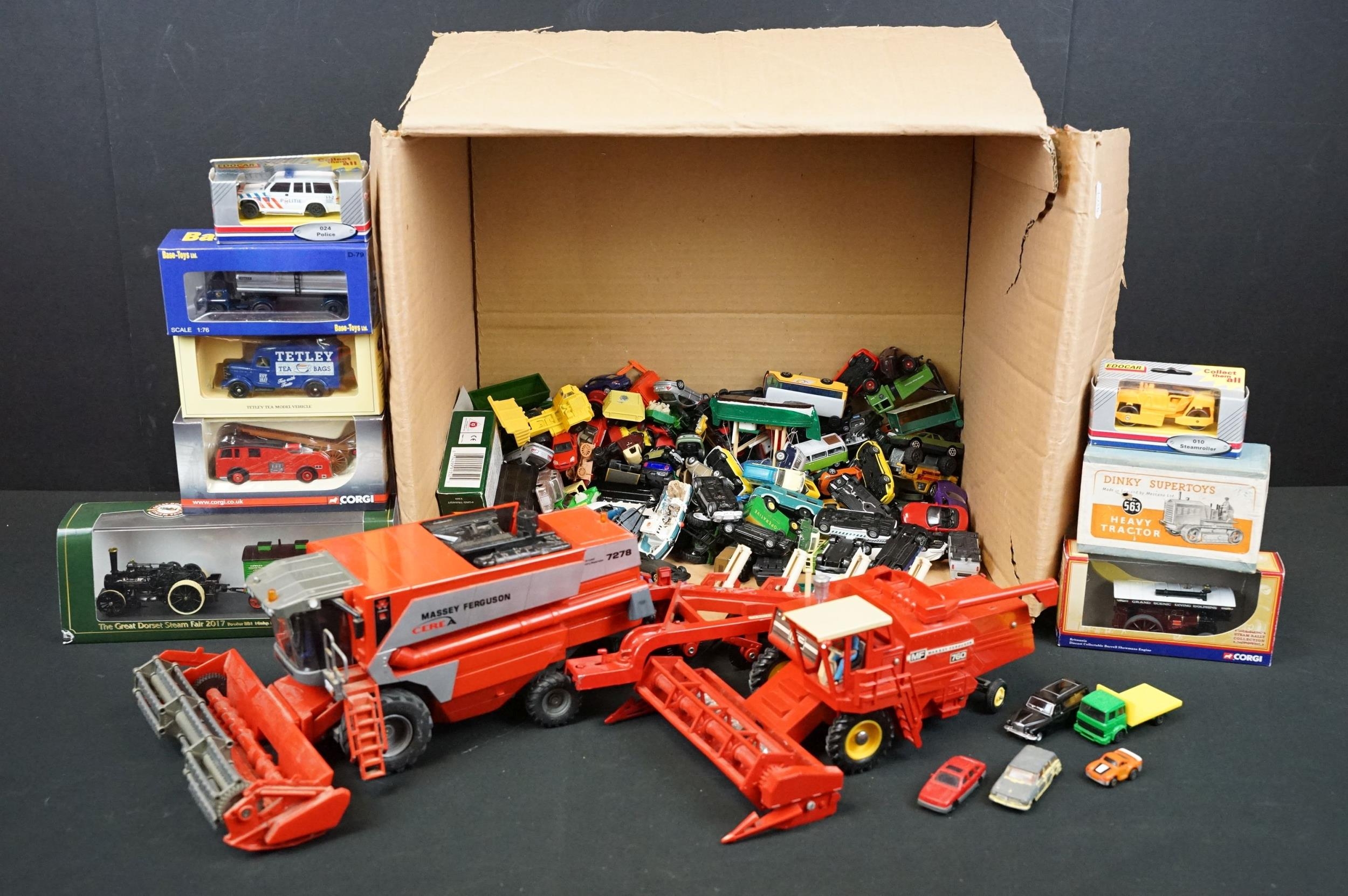 Quantity of boxed and unboxed diecast models to include Oxford Diecast Great Dorset Steam Fair model, Base Toys, Corgi Trackside, original Dinky 563 Heavy Tractor in orange and green with inner packaging, Siku Massey Ferguson, Britains Massey Ferguson Combine Harvester, etc, diecast mostly vg overall