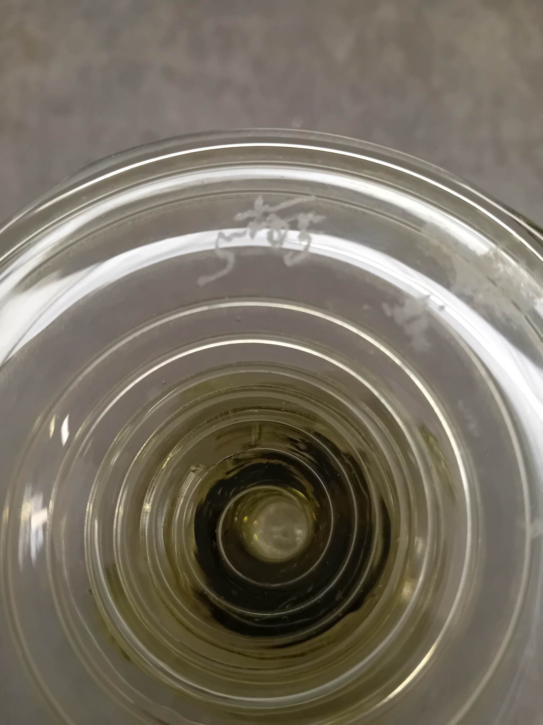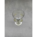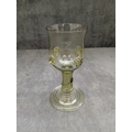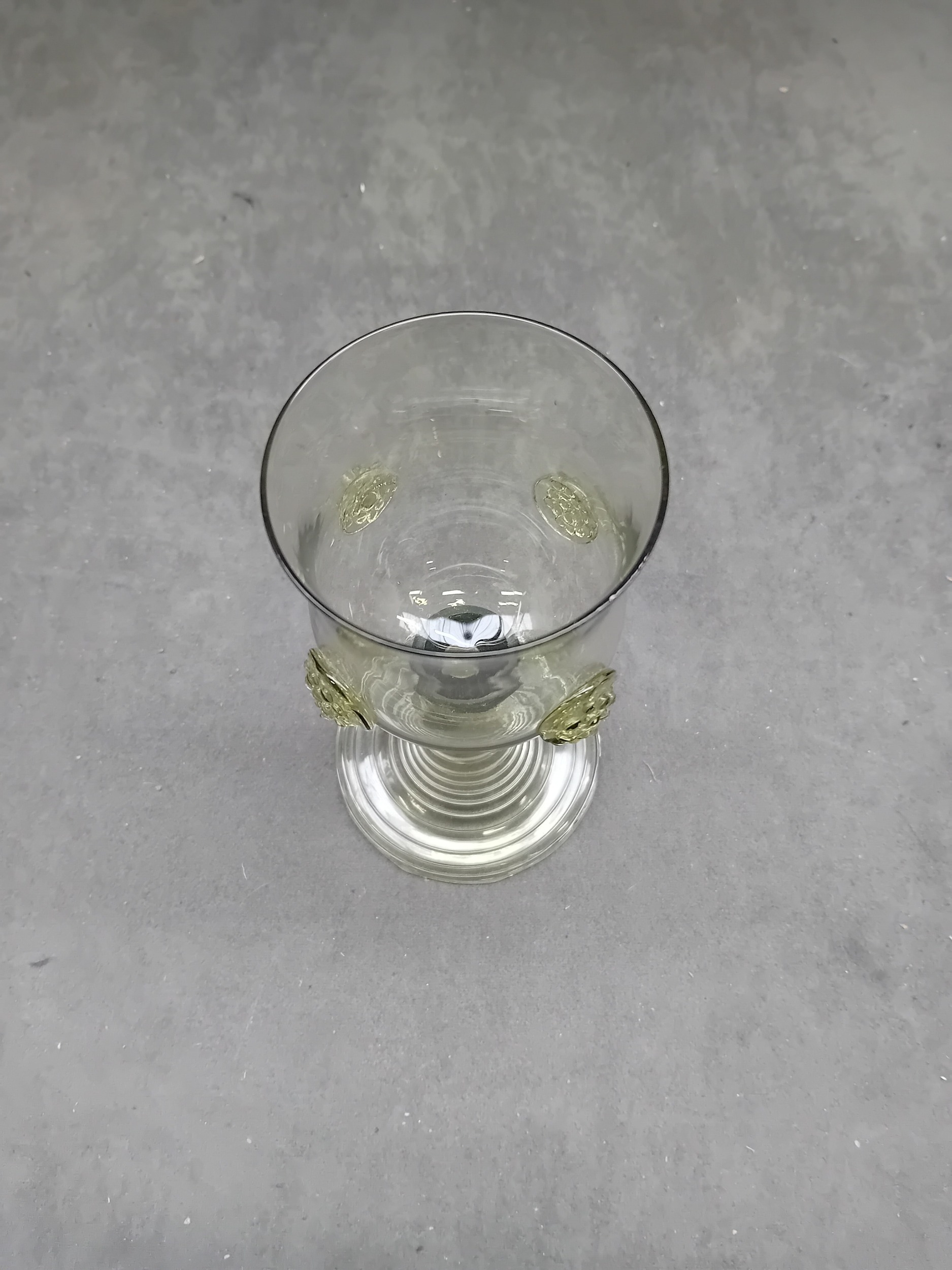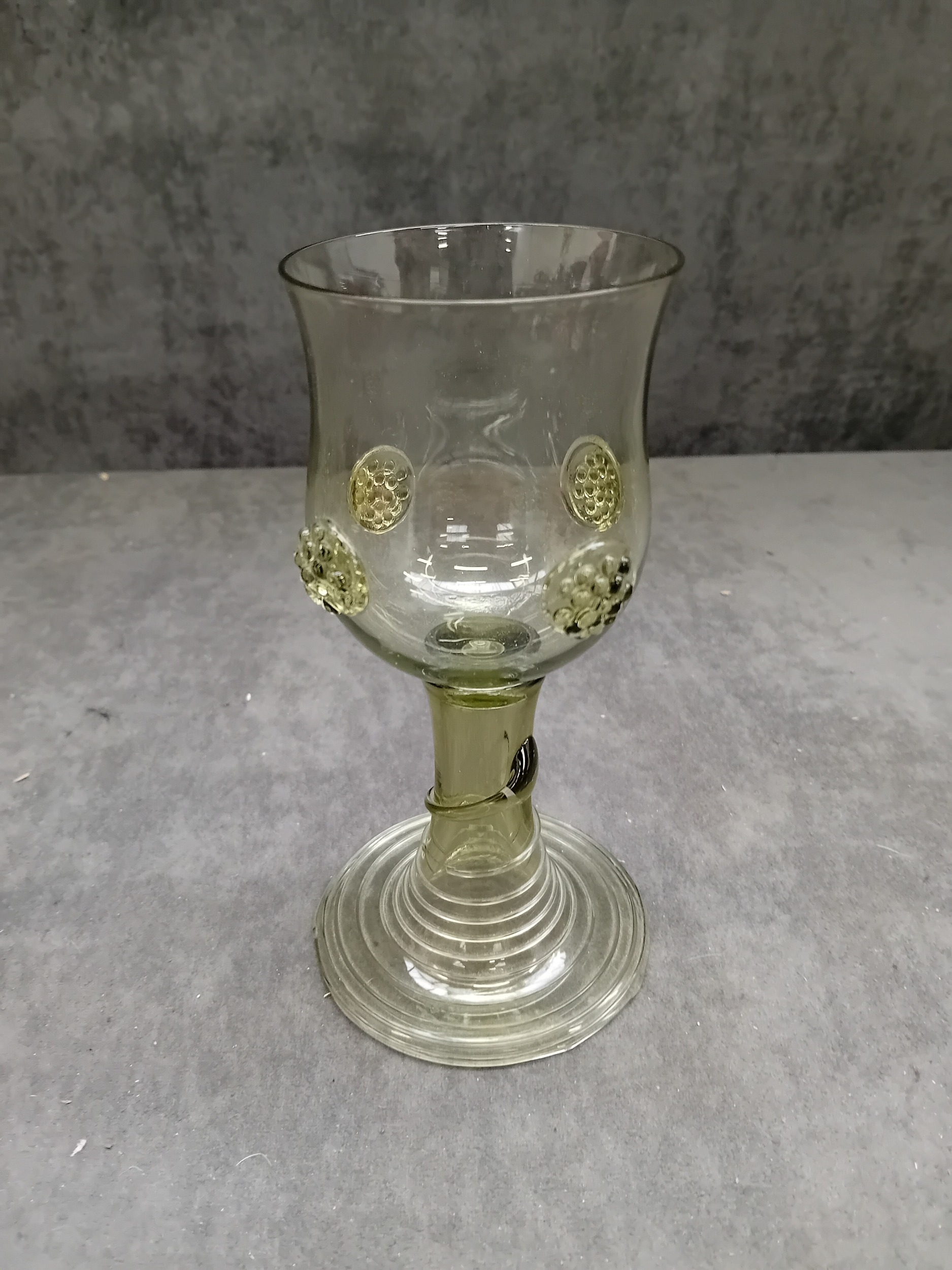 Possibly A 17th Century Dutch Roemer Wine Glass, crafted from light greenish-tinted glass. The vessel features a wide bowl adorned with a band of applied prunts or raspberry bosses, a short cylindrical stem, and a broad, ribbed circular foot. A faint, largely illegible cursive etched signature is visible on the underside of the foot. A small, indistinct black tag is wrapped around the stem.