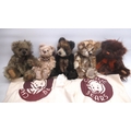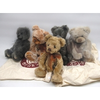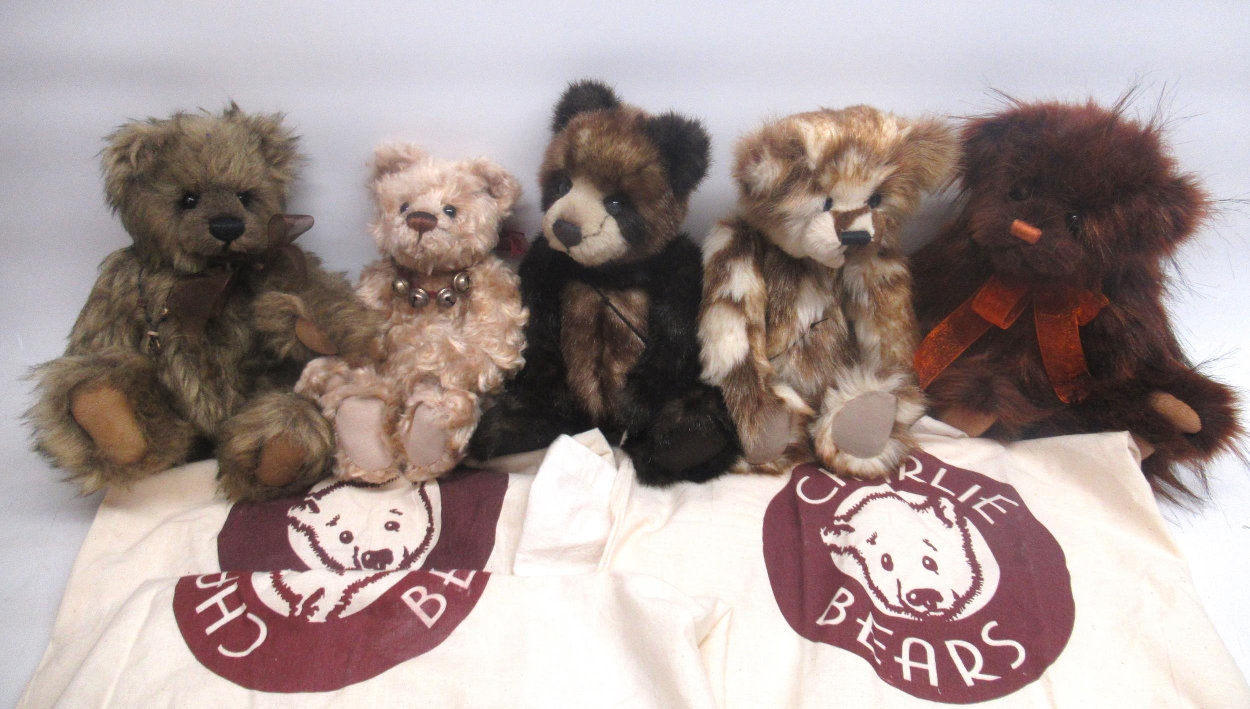 Five Charlie Bears "Sparrow", CB 131352, "Tatty" CB 647007O, "Tickle", CB 630310D, "Joy" CB094081A, "Adele" CB 0104649 with five Charlie Bears tote bags