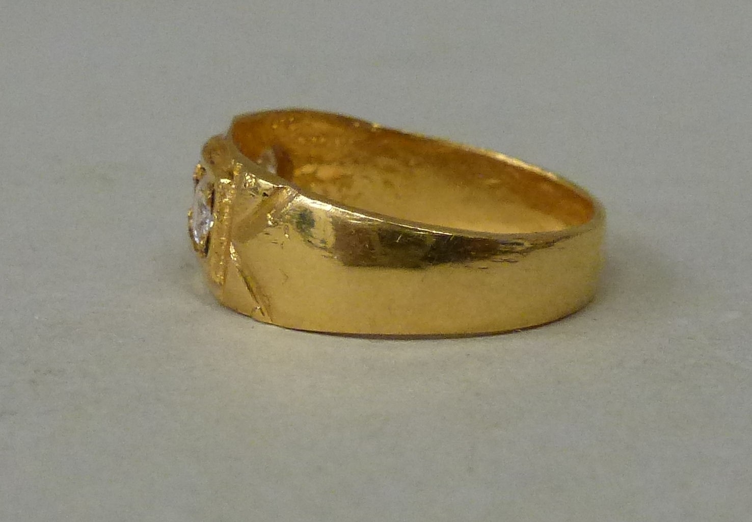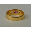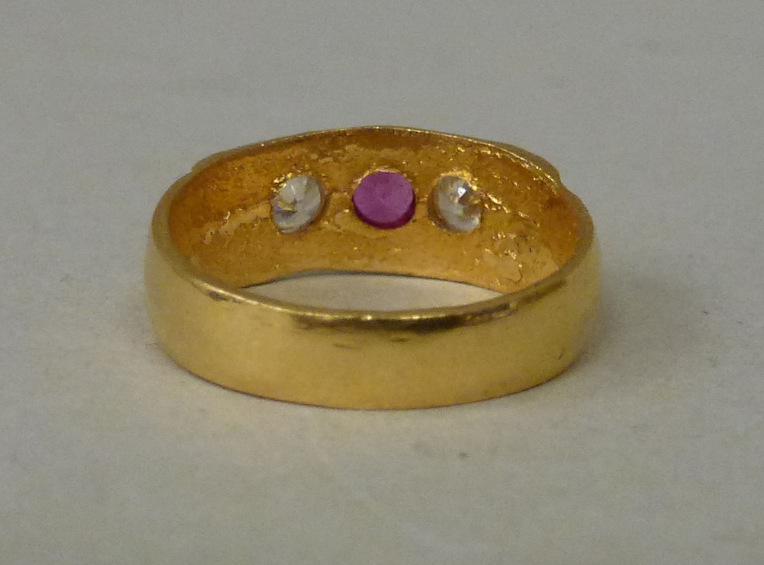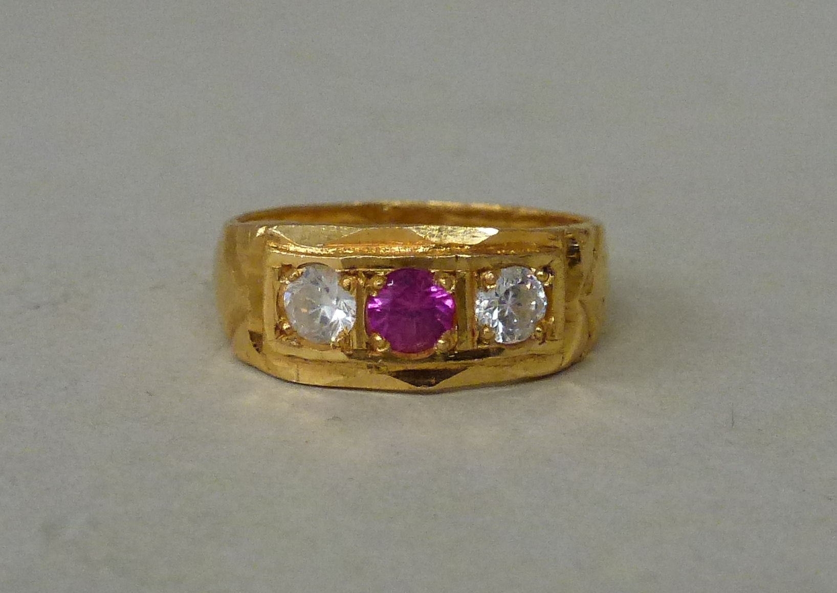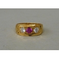 A 22ct gold ring, set with a central ruby, flanked by two white stones (approx. 5.2grms)