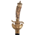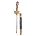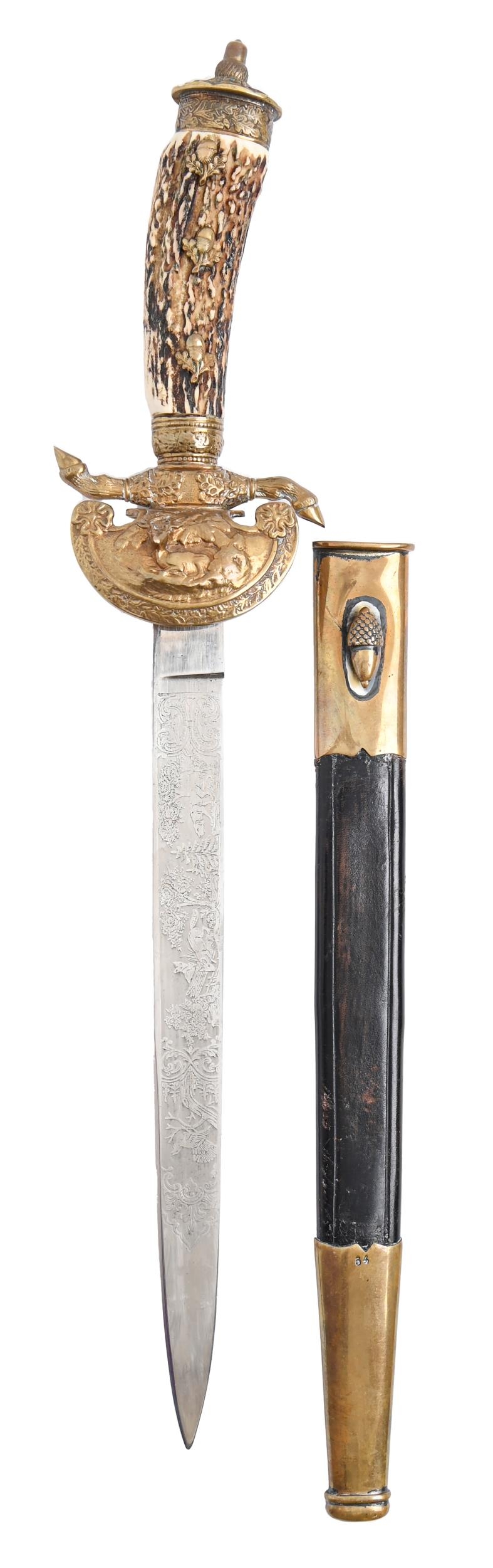 A German hunting hanger and sheath, early 20th c, the blade etched with animals in the forest and at the fort, maker's monogram PW Solingen, the 17th c style cast brass hilt with cloven hoof quillons and stag antler grip, brass mounted black leather sheath with acorn button, blade 32cm l