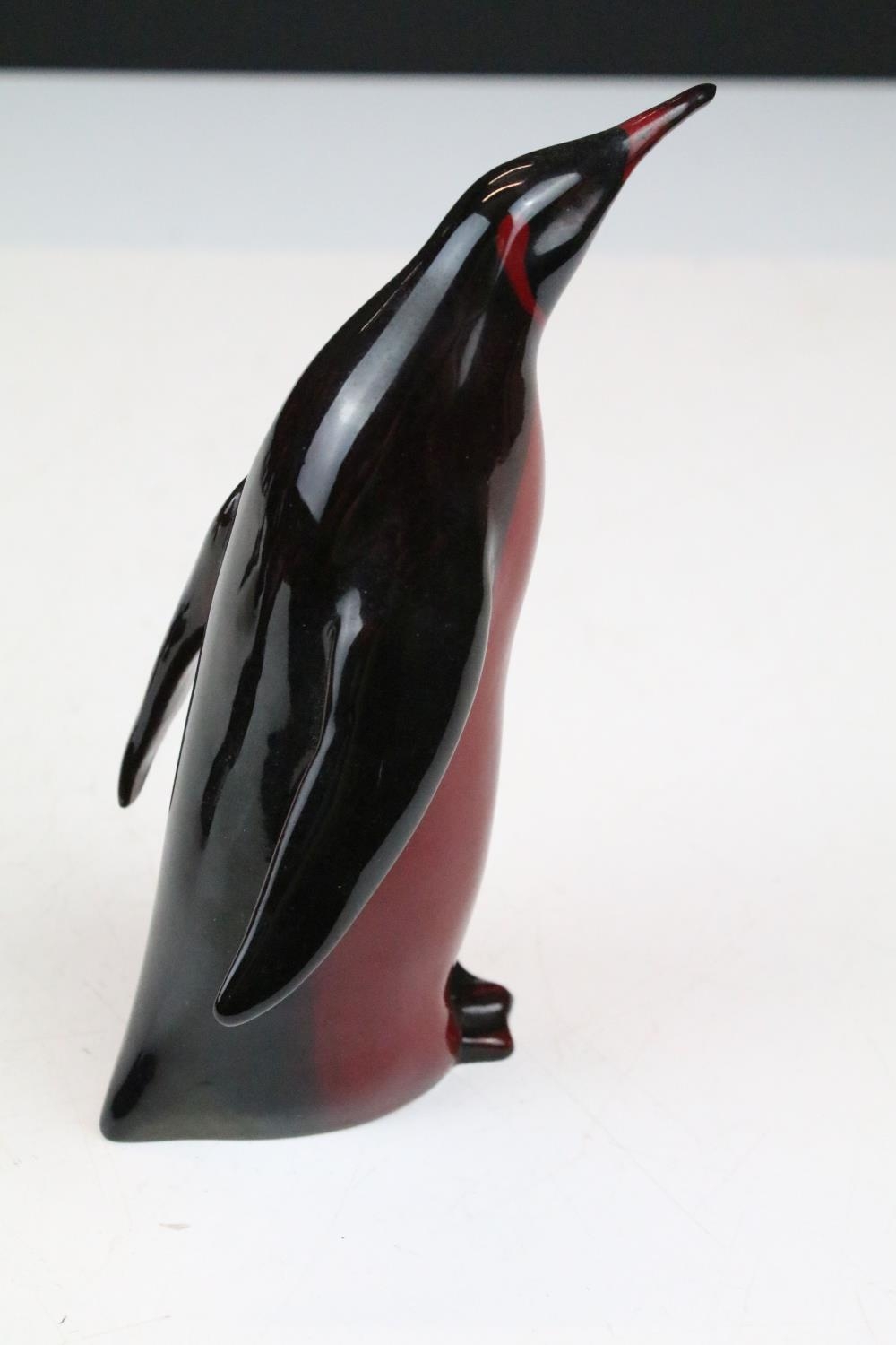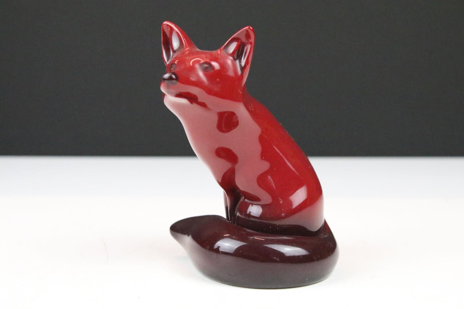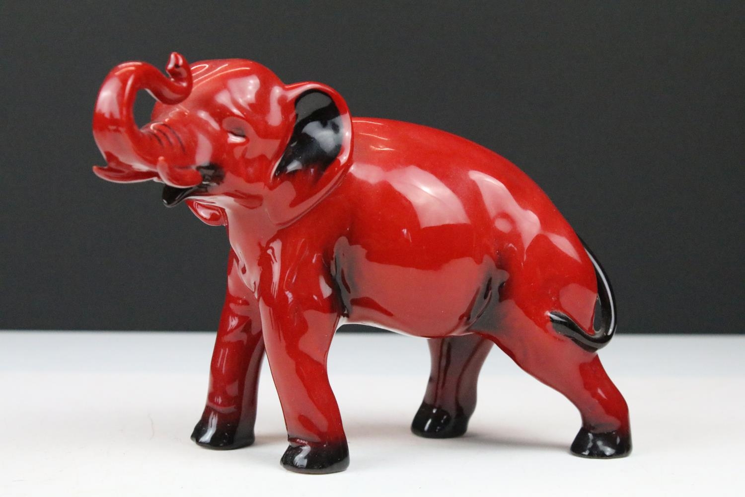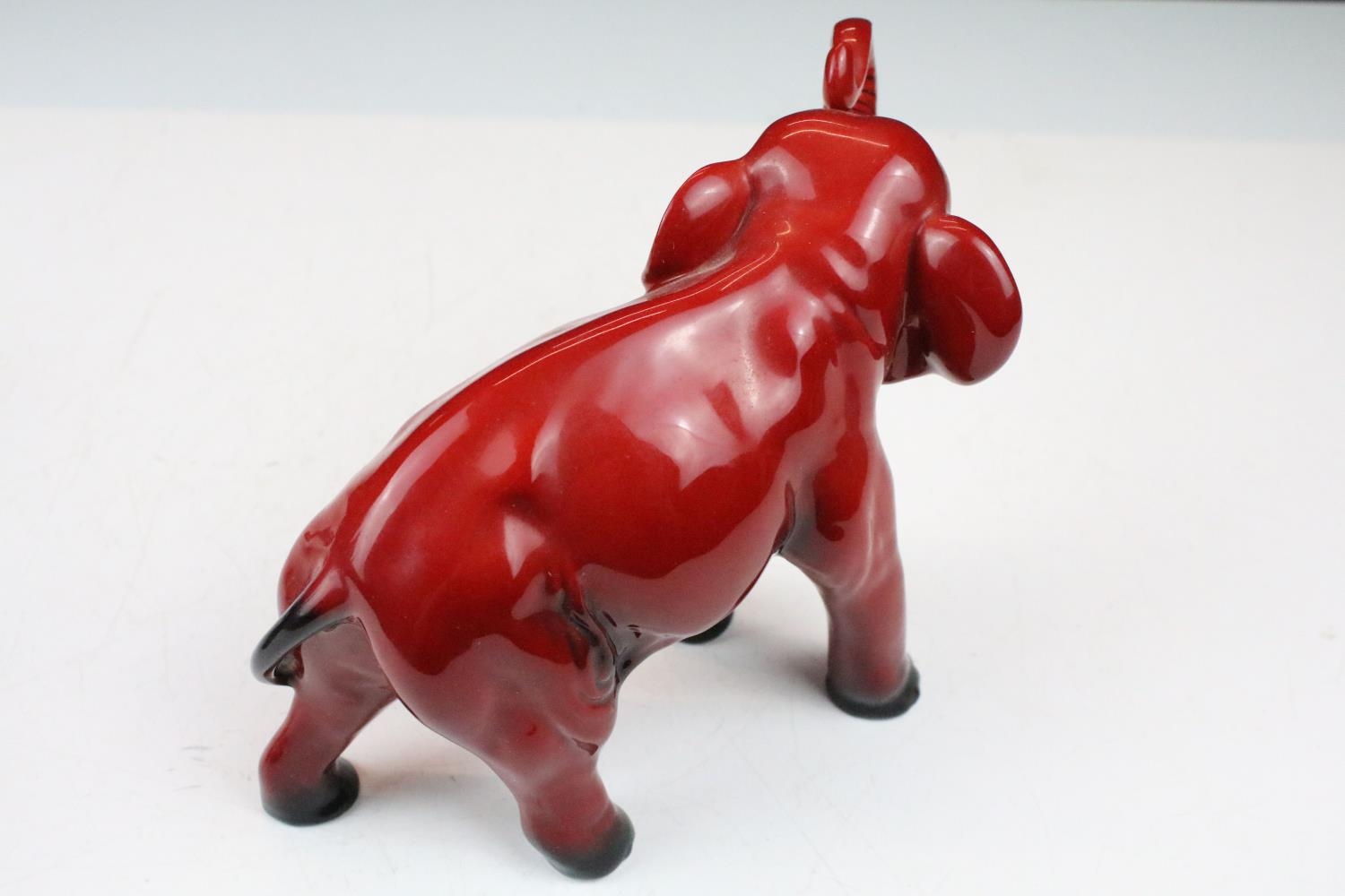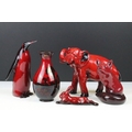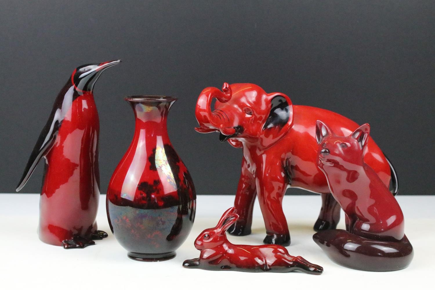 Group of Royal Doulton flambé, five pieces, to include baluster vase, penguin, elephant, fox & hare. Tallest approx 15cm