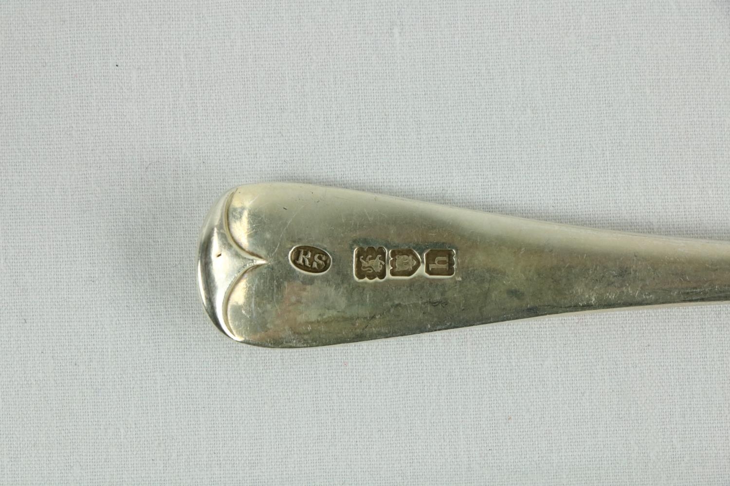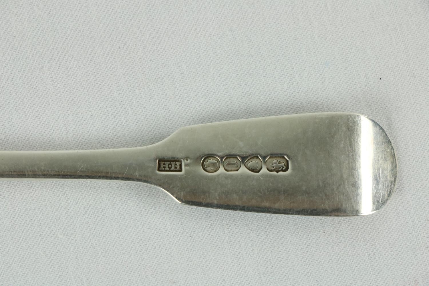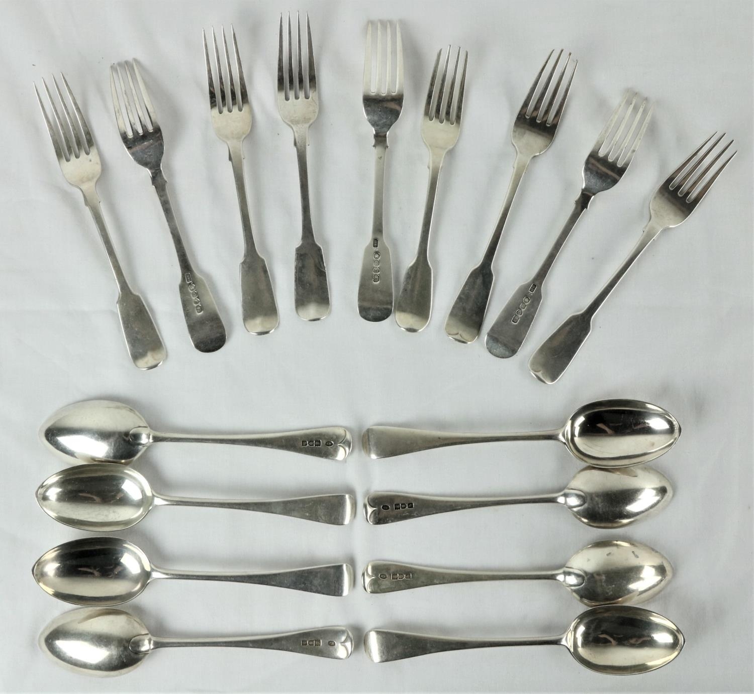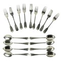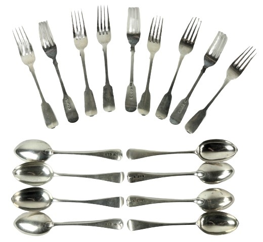 A set of 8 silver Dessert Spoons, London 1903, 404 grams, together with a set of 6 fiddle pattern Supper Forks, London 1859 by Hyam Hyams, 294 grams and three other crested Supper Forks, 147 grams. (17)