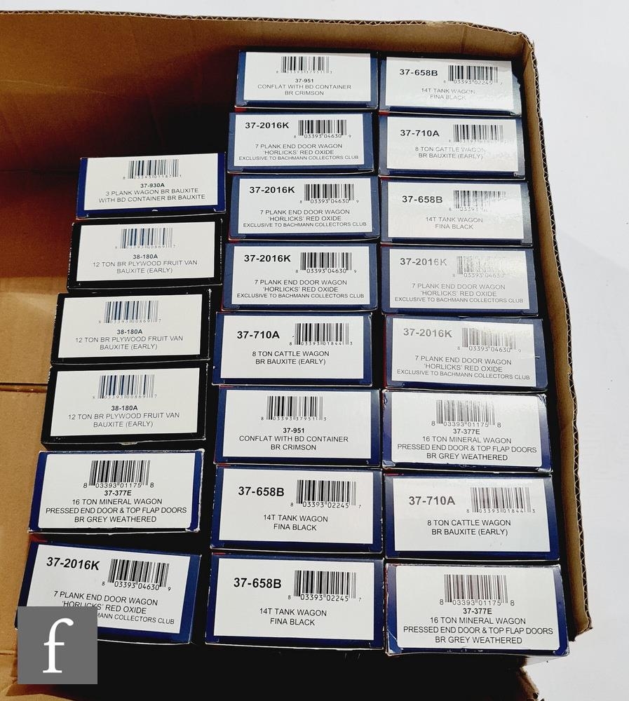 Twenty two OO gauge Bachmann items of rolling stock, to include Cattle Wagons, Plank Wagons, Mineral Wagons, Fruit Vans, etc., to include 38-180A, 37-658B, 37-2106K, etc., some duplicates, all boxed. (22)