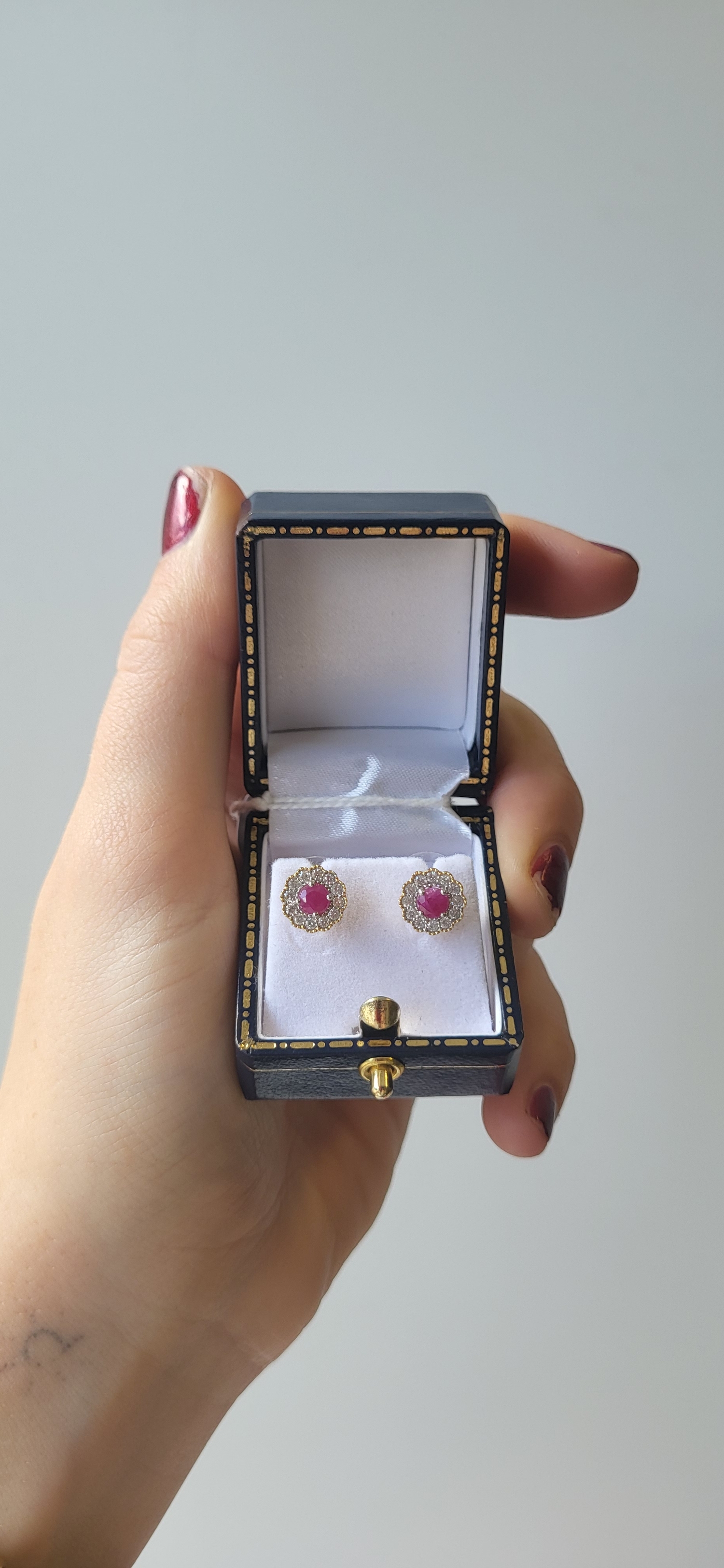 A PAIR OF RUBY AND DIAMOND CLUSTER EARRINGS, the round rubies to diamond surrounds, mounted in 9ct yellow gold. Estimated: weight of diamonds: 0.16 ct, (earring backs not gold)