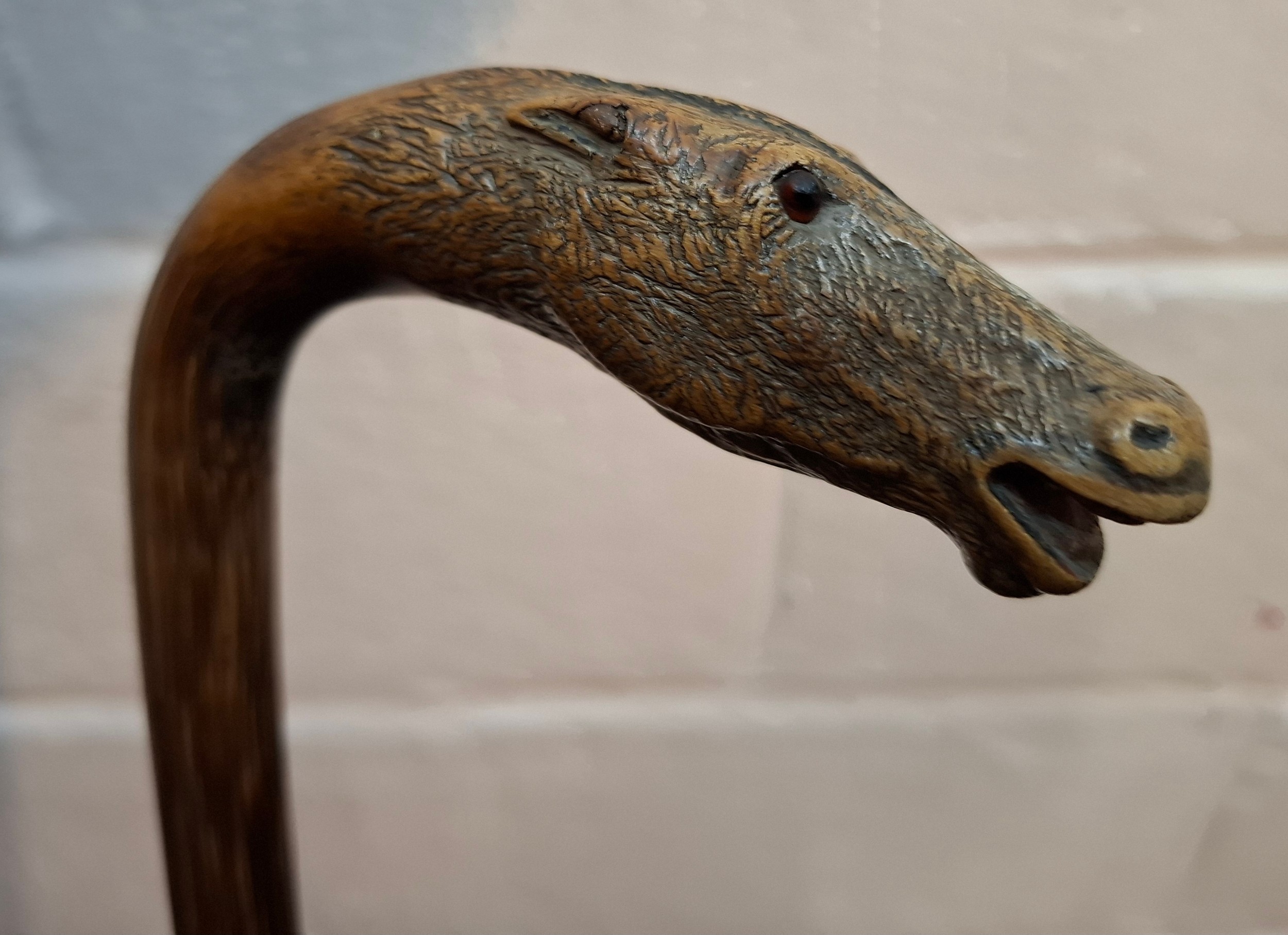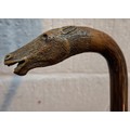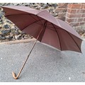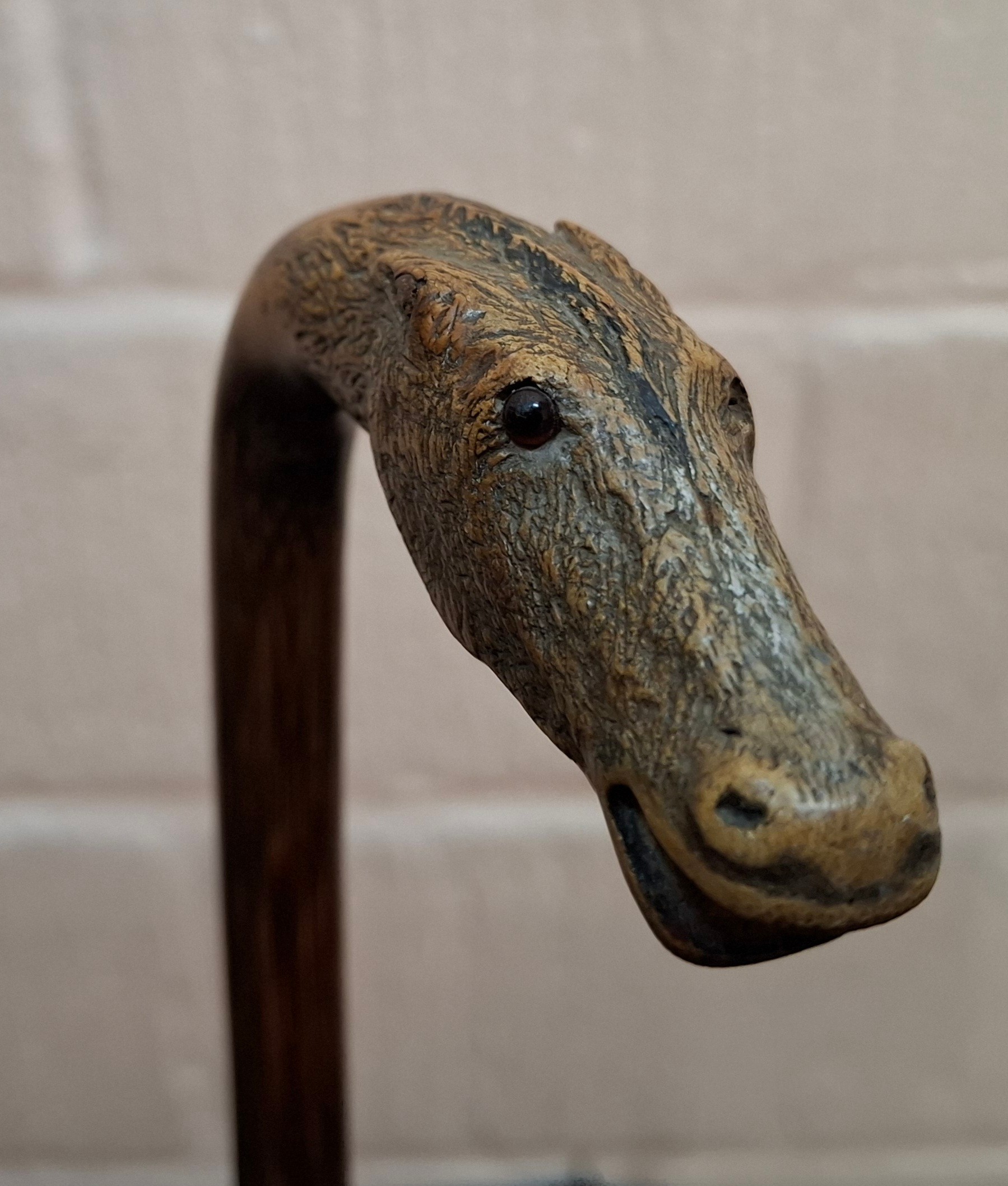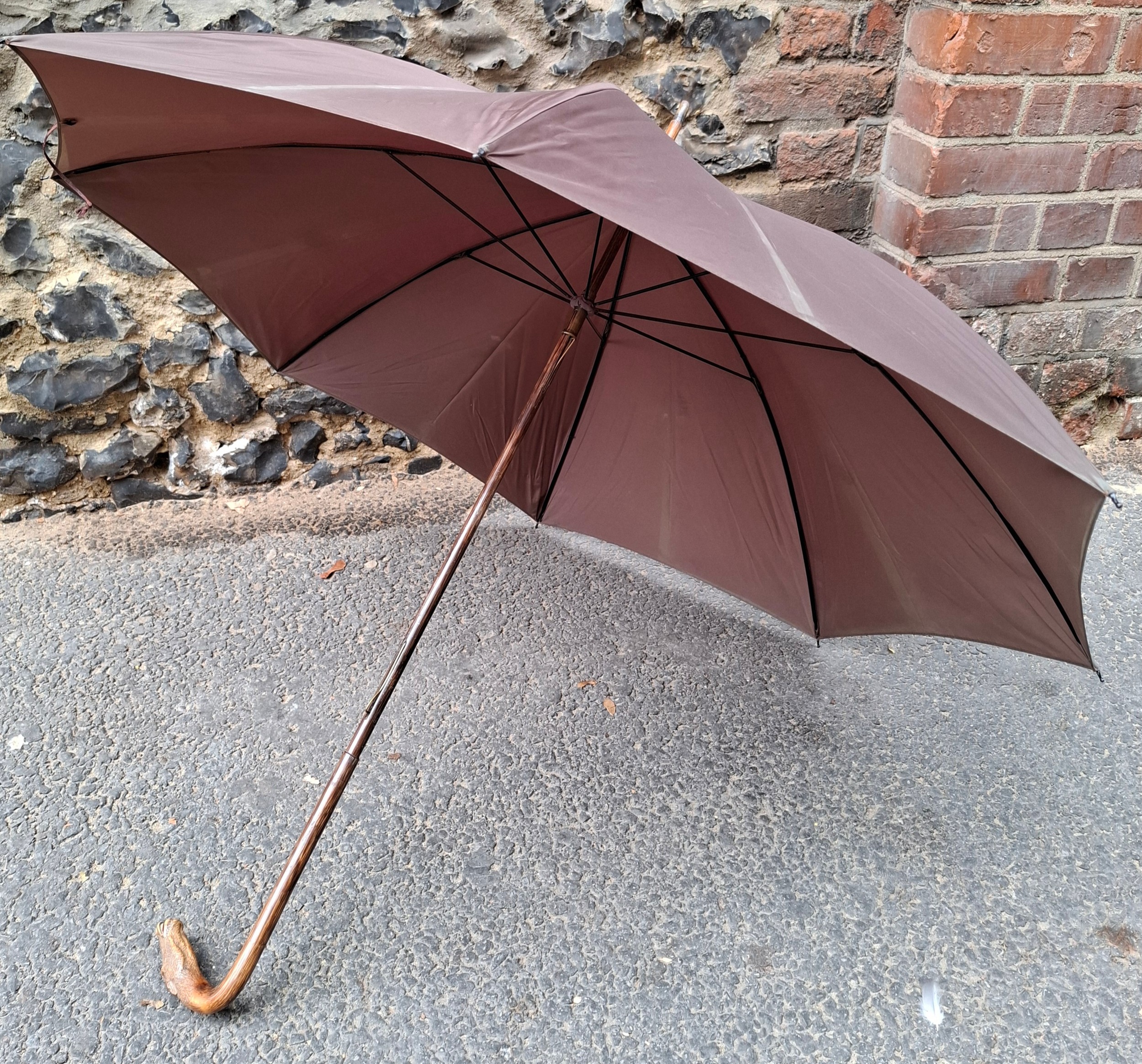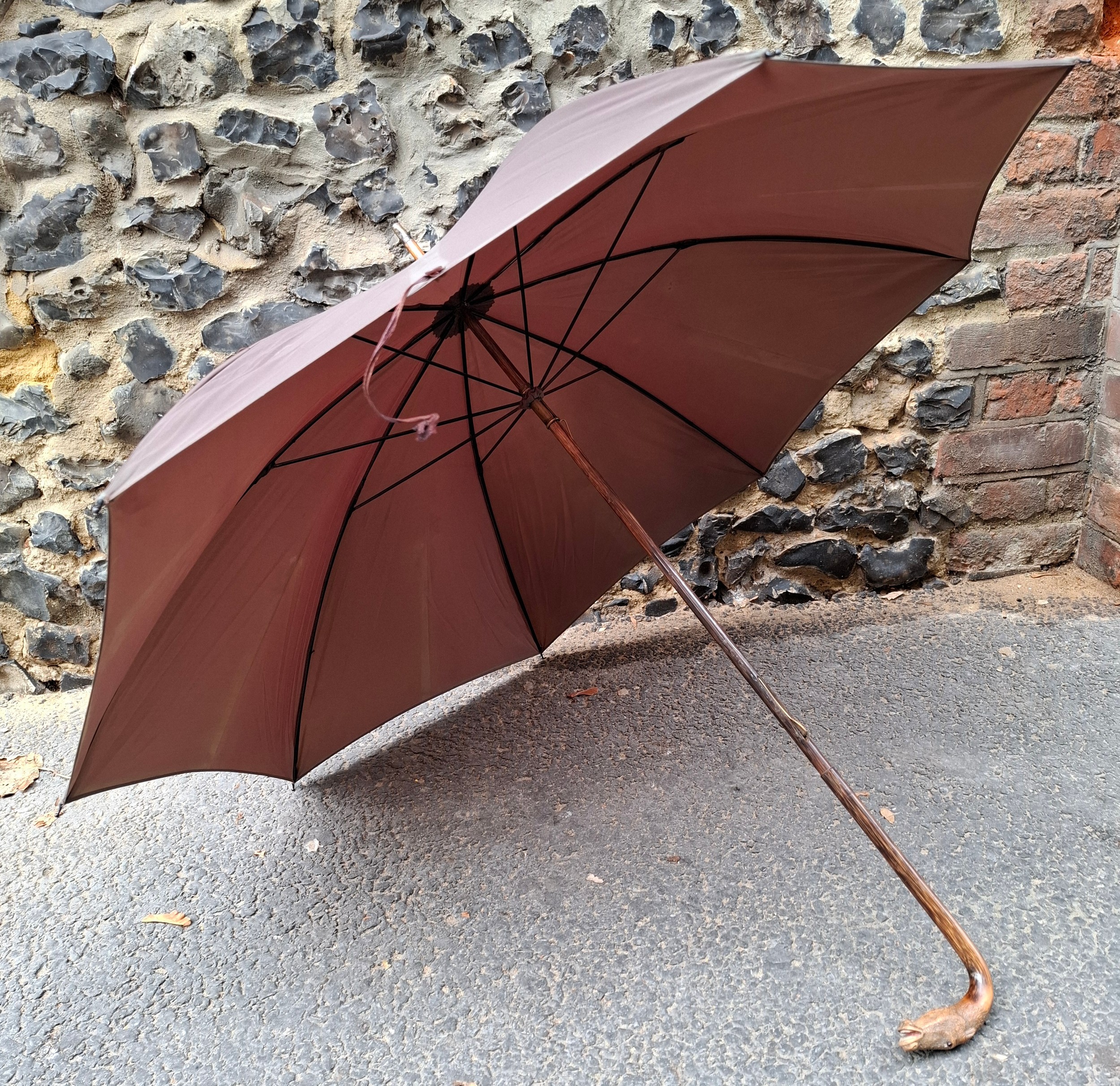 A vintage S.Fox & Co Paragon Laurus brown umbrella having a treen cane effect handle terminating in a carved head of a donkey with one glass eyes. Location:BWR