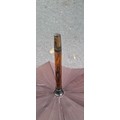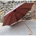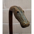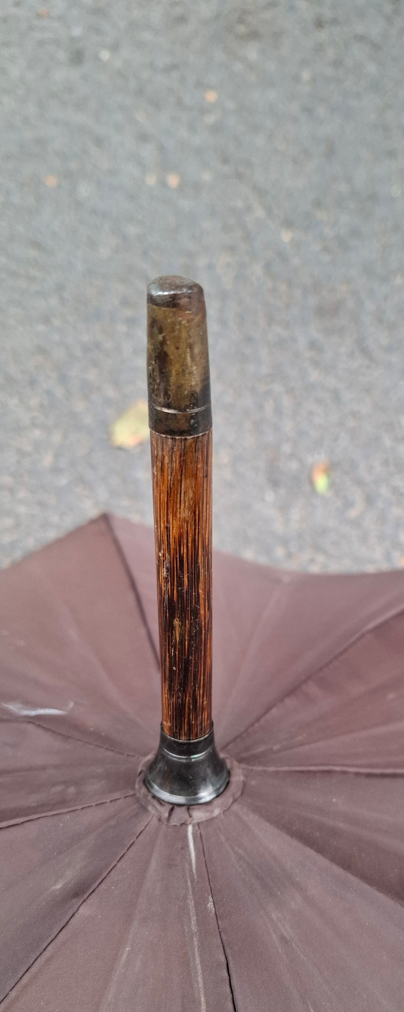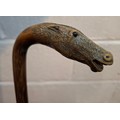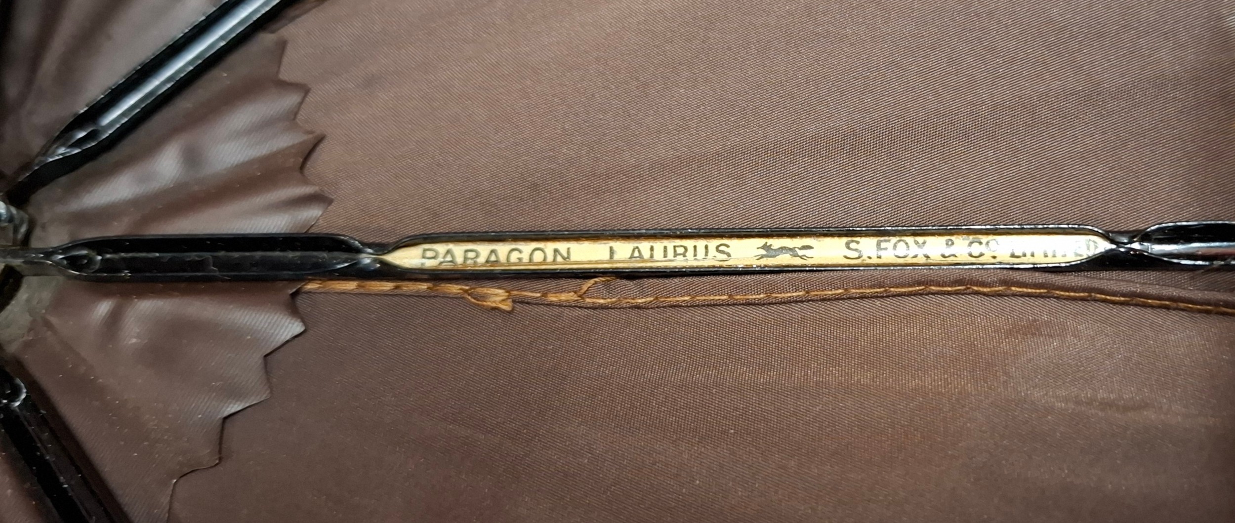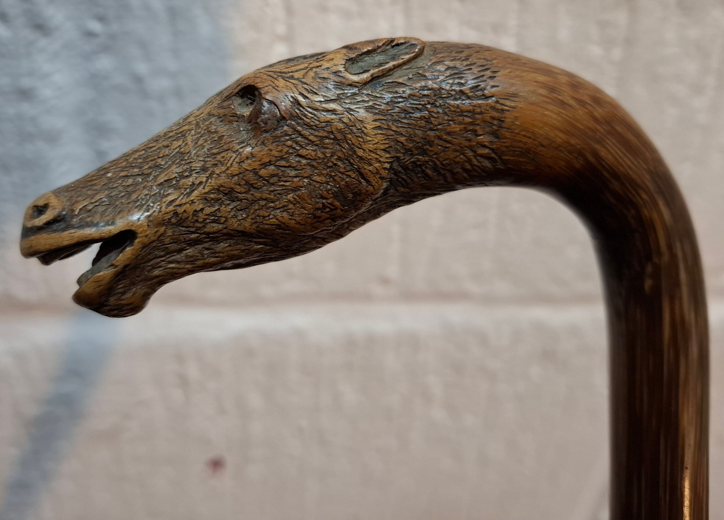 A vintage S.Fox & Co Paragon Laurus brown umbrella having a treen cane effect handle terminating in a carved head of a donkey with one glass eyes. Location:BWR
