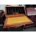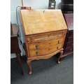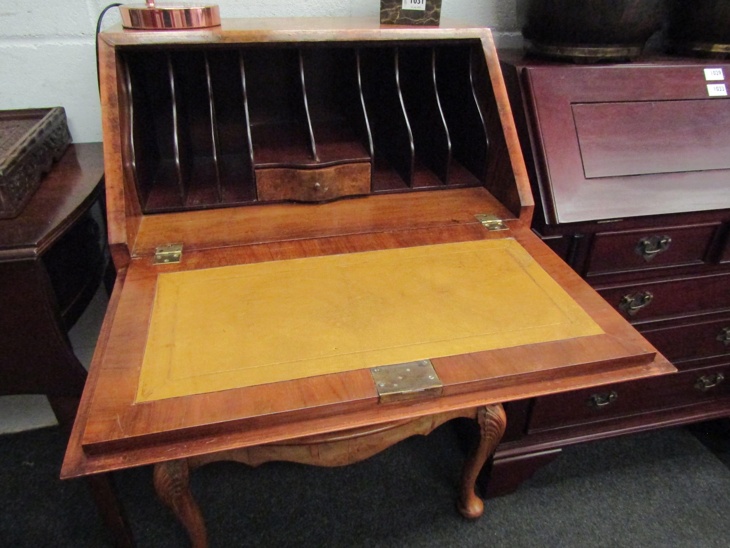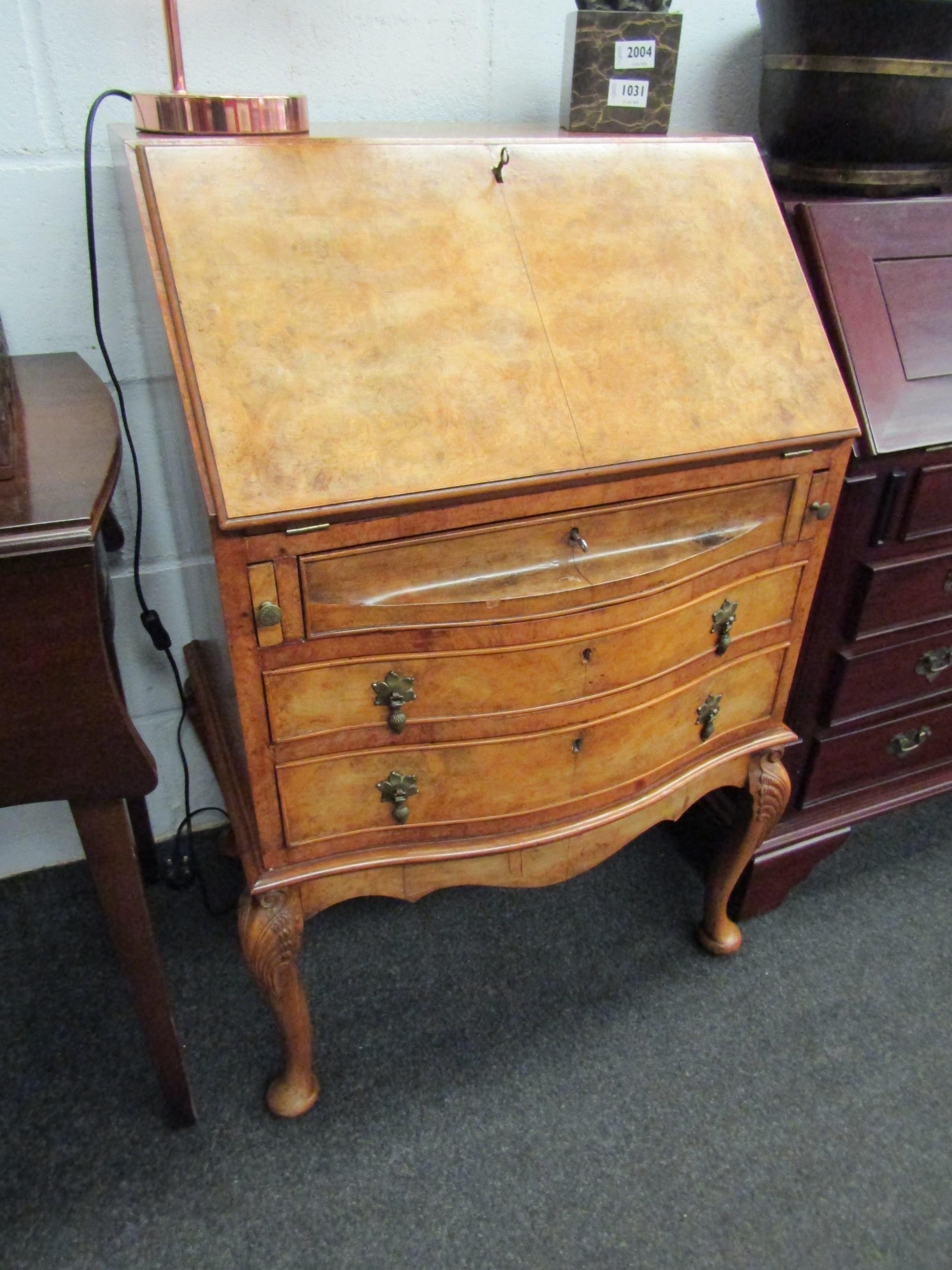 An early 20th Century burr walnut veneer Victorian style three drawer bureau, fitted section interior, serpentine front, cabriole legs with acanthus detail (two keys) 95cm high x 64cm wide x 47cm deep