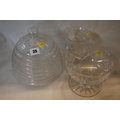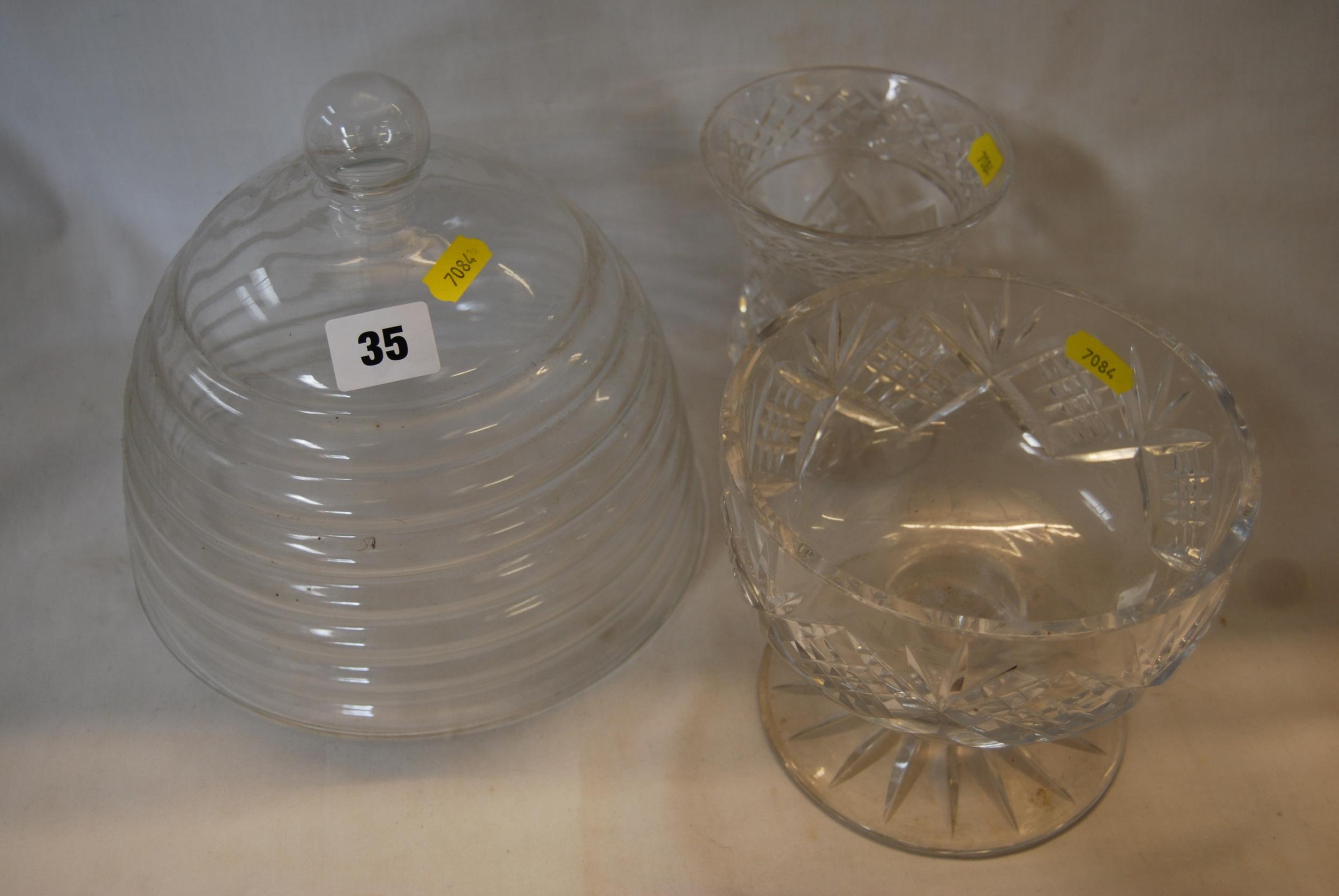 CUT GLASS PEDESTAL FRUIT BOWL, STUART CRYSTAL VASE & CAKE COVER