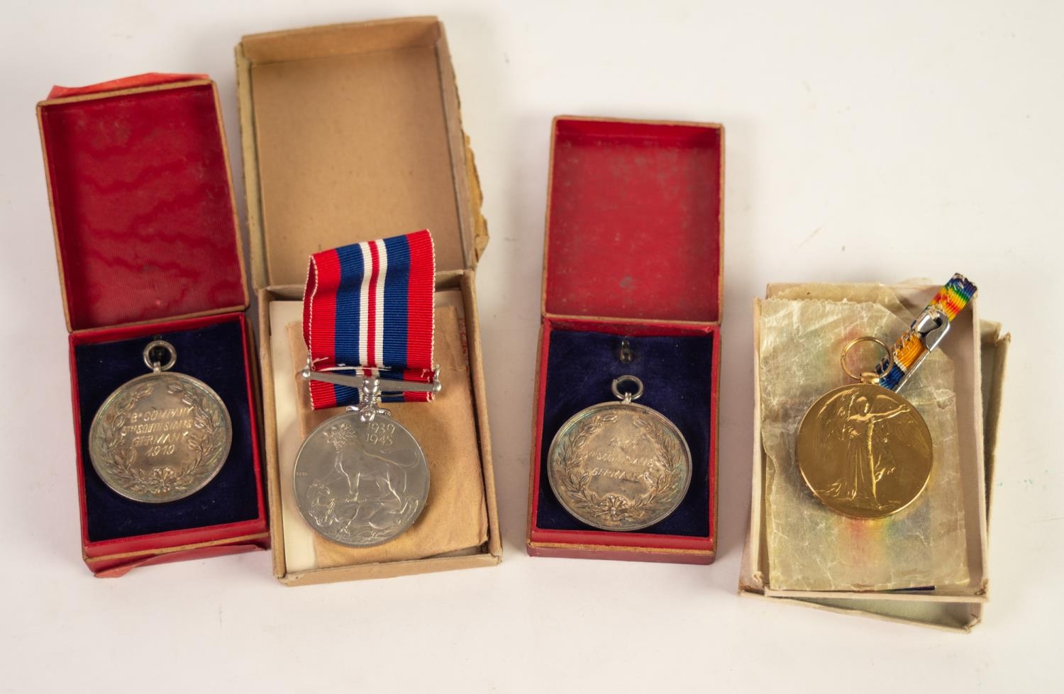 TWO SILVER MILITARY SPORTS MEDALLIONS FOR BATTALION 100 YARDS RACE AND RELAY RACE, inscribed B Company 5th South Staffs, Germany, both in Fattorini, Bradford, boxes together with 1914 - 19 GILT VICTORY MEDAL awarded to 5278 Pte F Emerson Midd'x R. in MEDAL POSTAGE BOX with RIBBON AND BROOCH and a 1939/45 WAR MEDAL in medals postage box, with ribbon and medals lis to I.H. Appleby, Whitefield near Manchester (5)