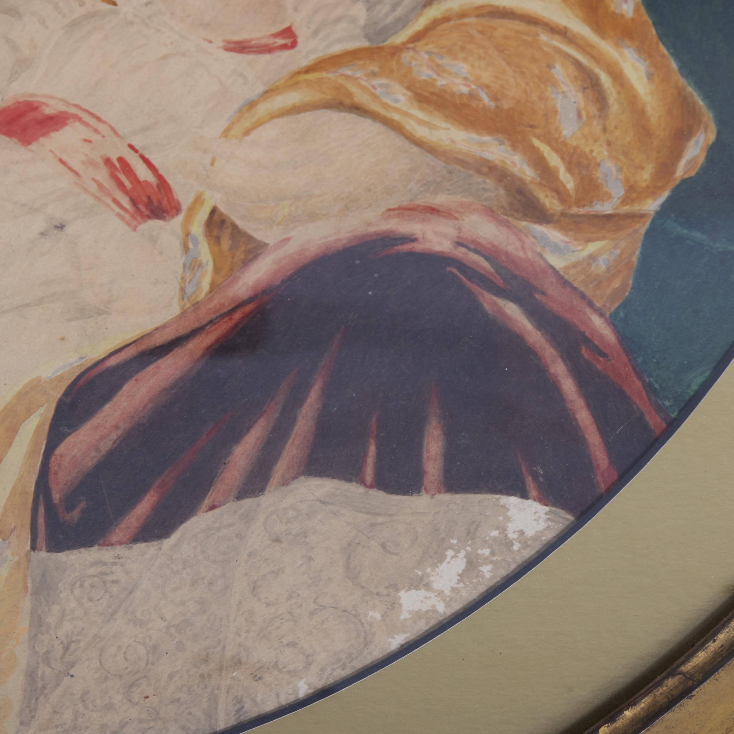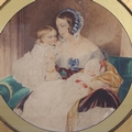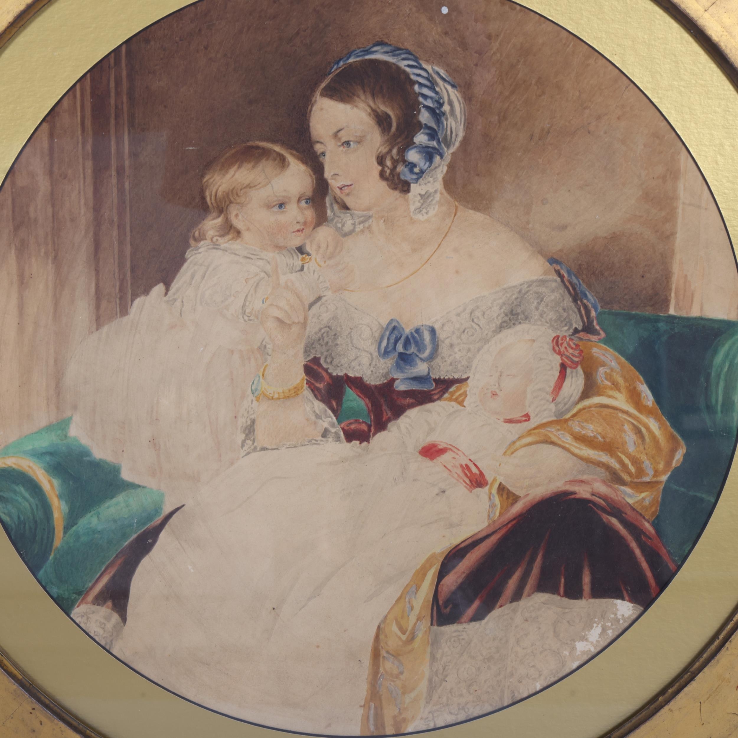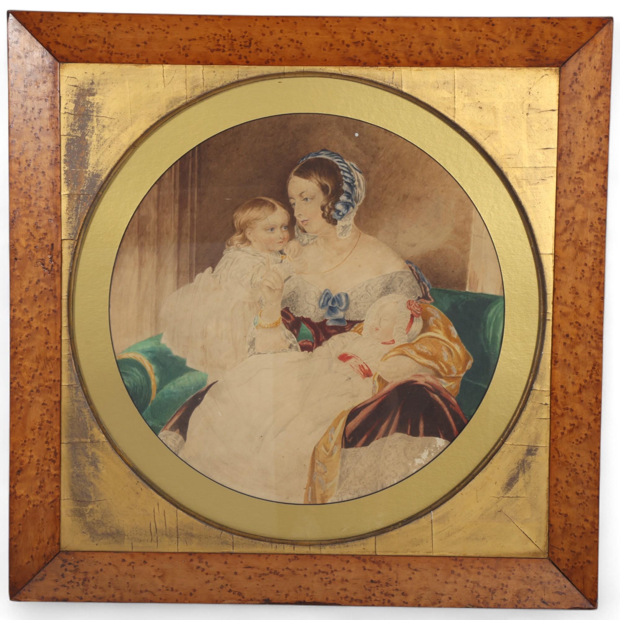 Portrait of Queen Victoria with Princess Victoria and Prince Albert Edward, 19th century circular watercolour, in the manner of Sir Edwin Landseer, unsigned, diameter 47cm, maple frame, overall frame dimensions 70cm x 70cm