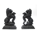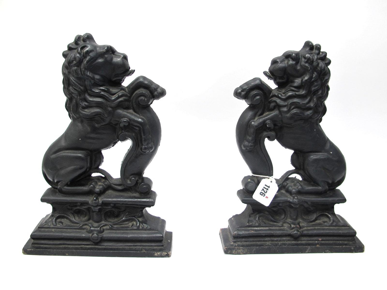 A Pair of Cast Iron Fireside Ornaments, each as a lion rampant on stepped base, black painted, 36cm high. (2)