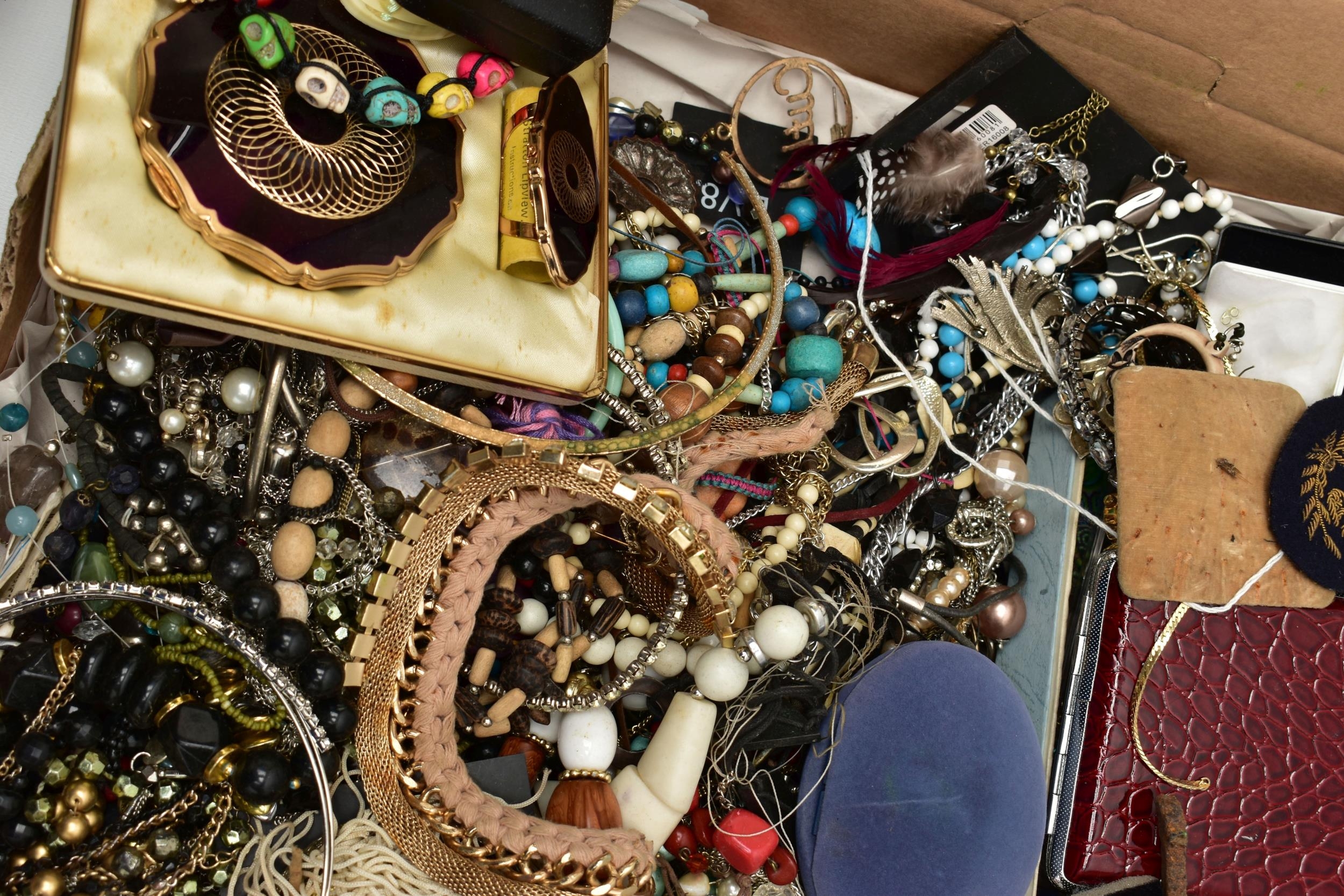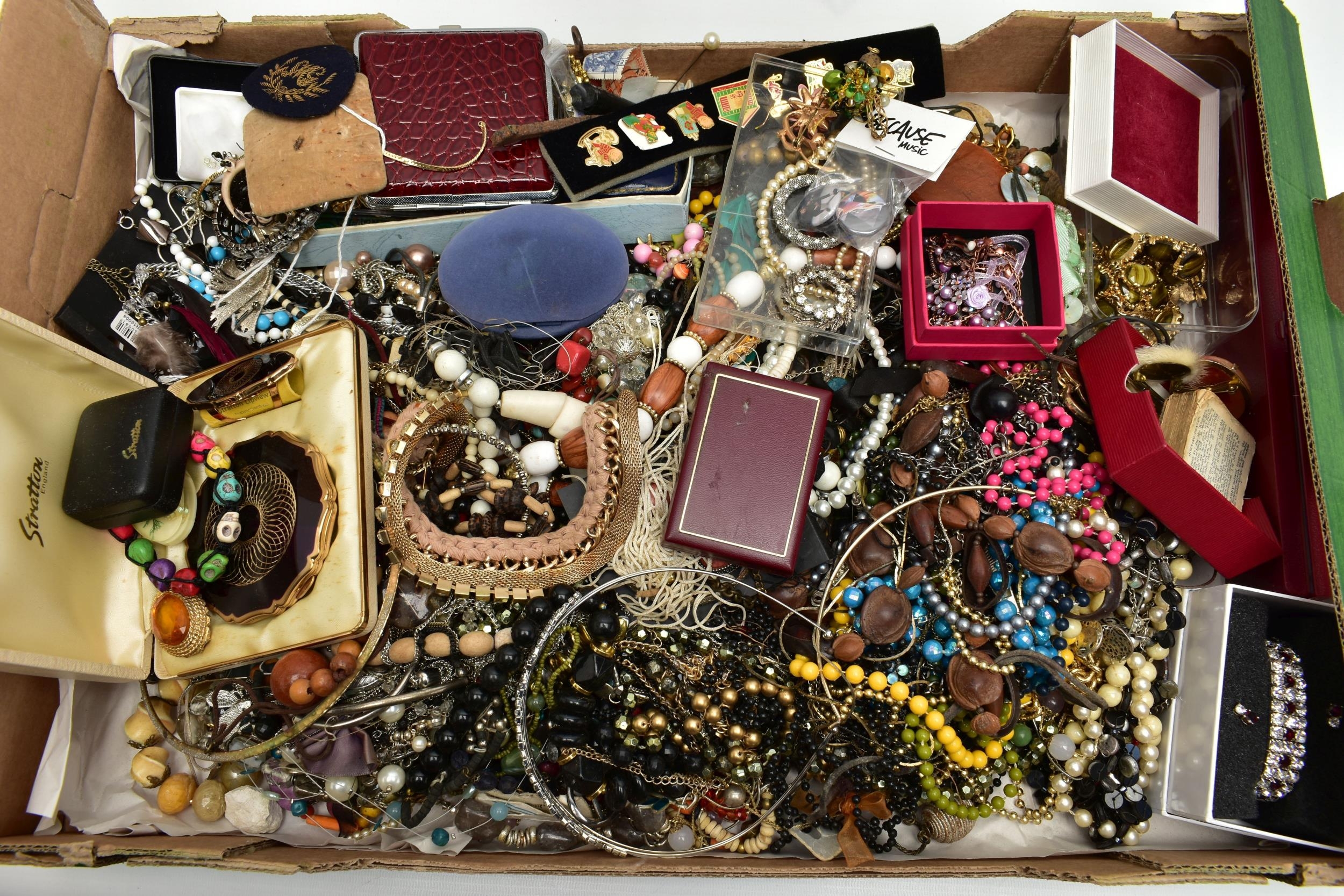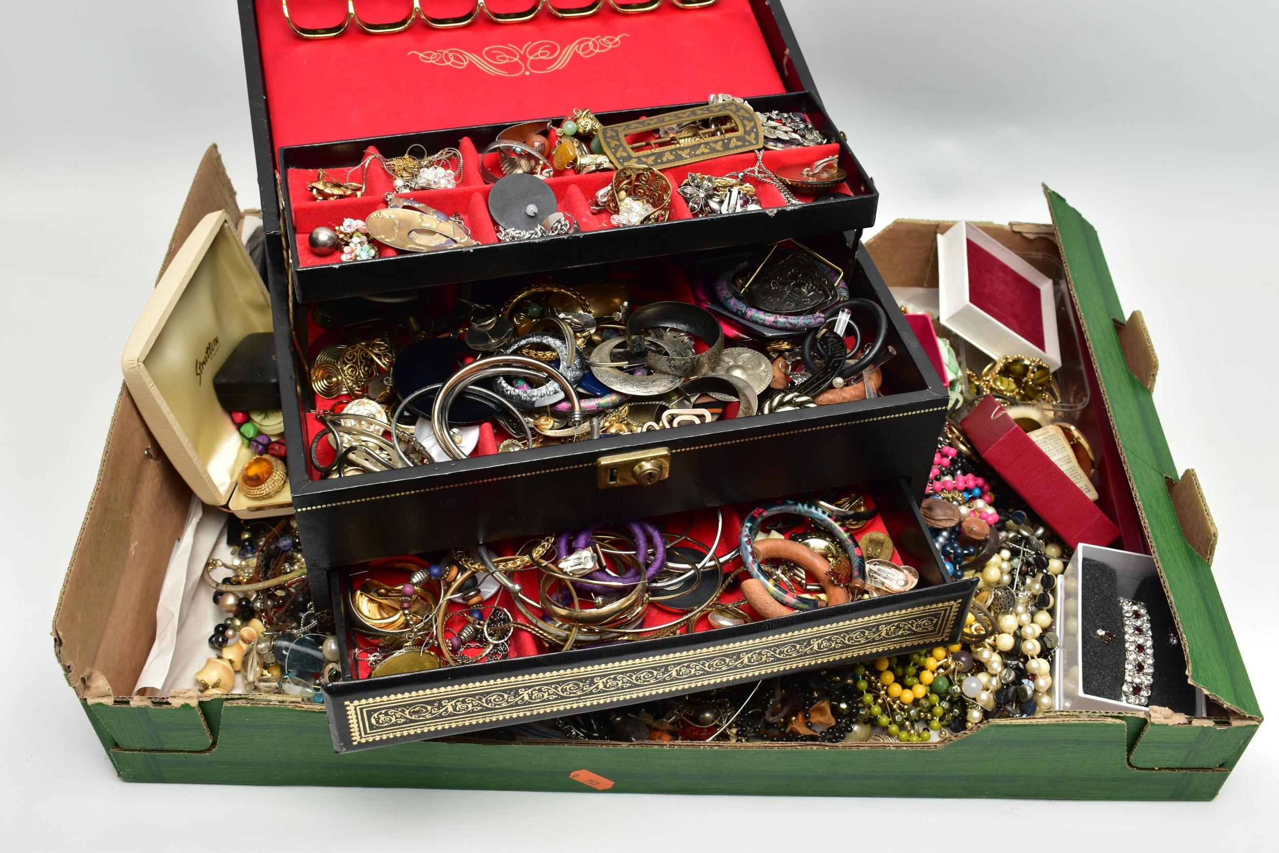 A LARGE ASSORTMENT OF COSTUME JEWELLERY, to include a selection of earrings, necklaces, pendants, beaded jewellery, pins and brooches, a large AF jewellery box, a 'Stratton' compact set, a cigarette case etc