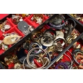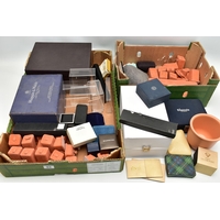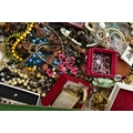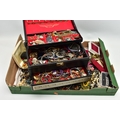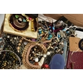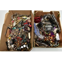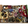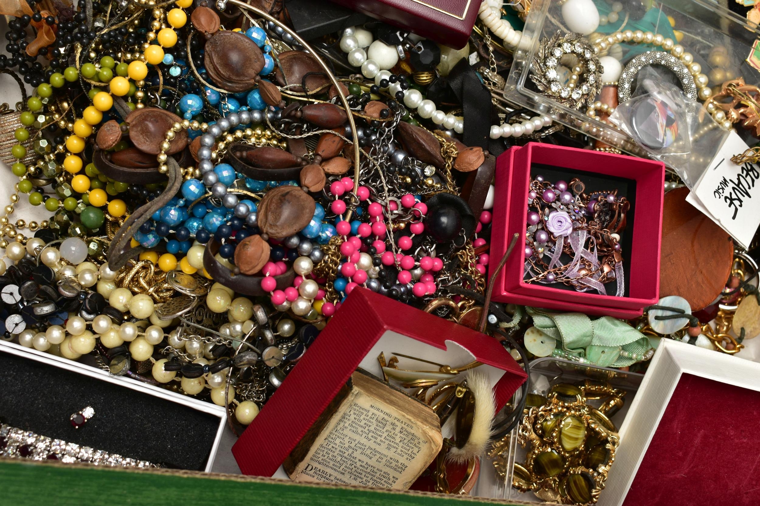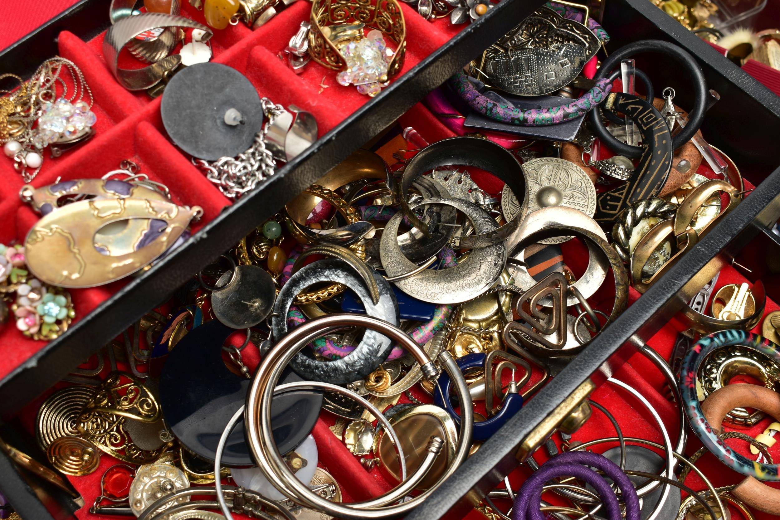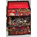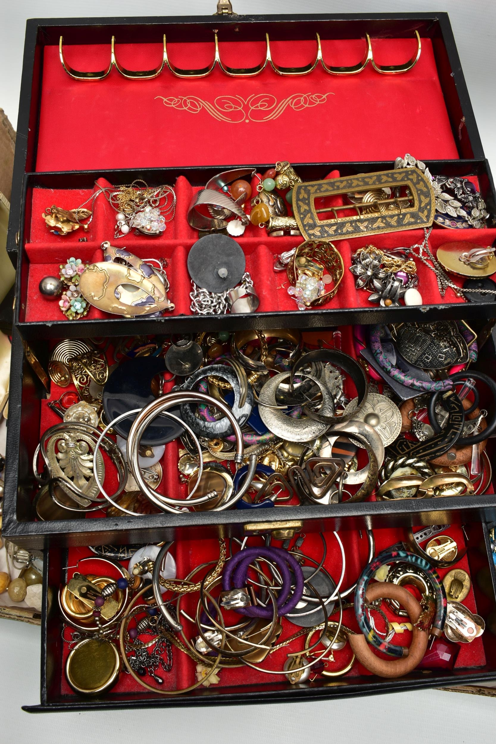 A LARGE ASSORTMENT OF COSTUME JEWELLERY, to include a selection of earrings, necklaces, pendants, beaded jewellery, pins and brooches, a large AF jewellery box, a 'Stratton' compact set, a cigarette case etc