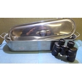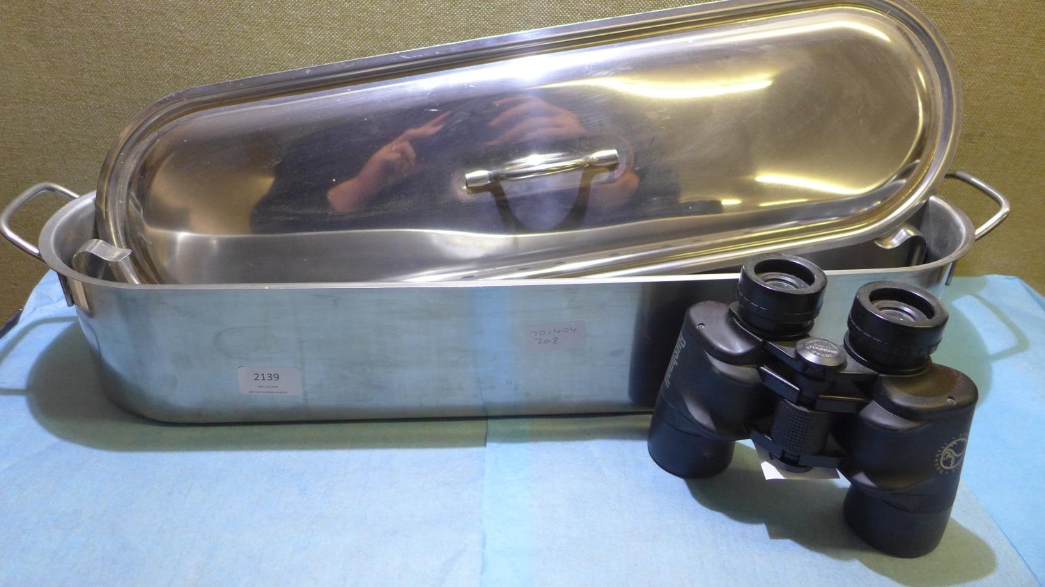 A stainless steel fish kettle and a pair of Bushnell binoculars