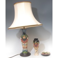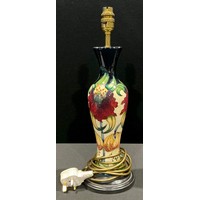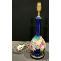 A Moorcroft pottery lamp base tube lined in the Orchid and Spring Flowers pattern, blue ground, plinth base, 43cm high overall