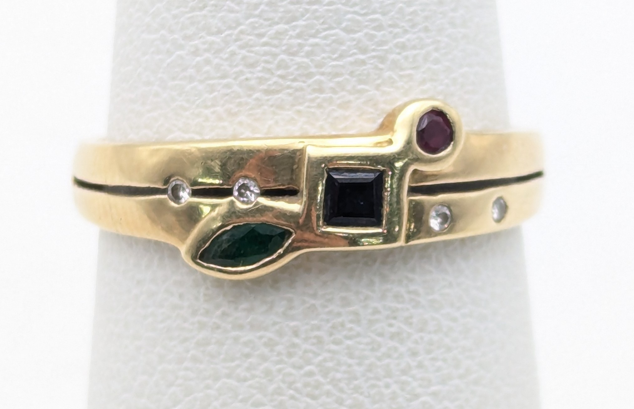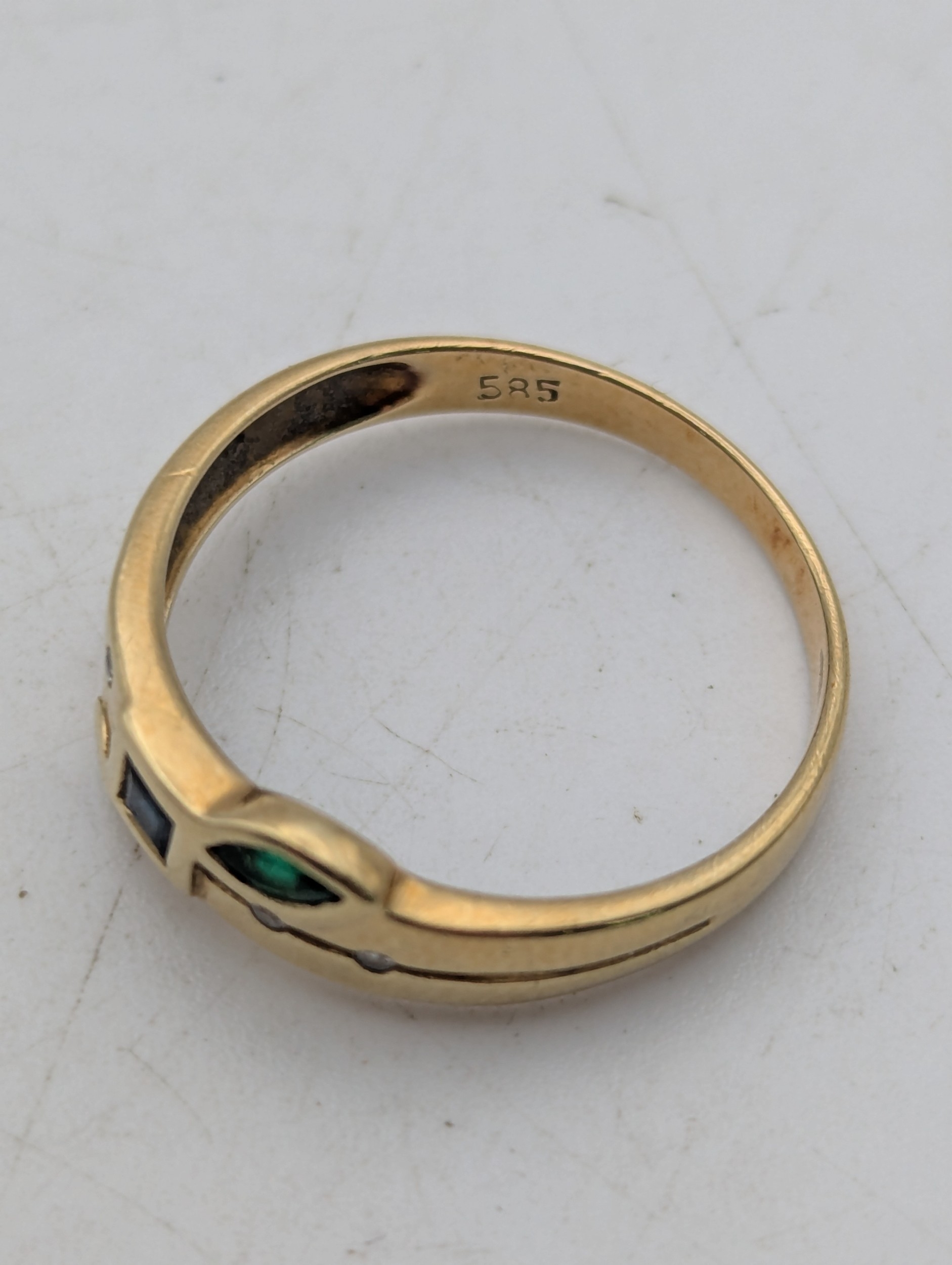 Diamond, ruby, sapphire and emerald 14ct yellow gold ring stamped 585 size N, 2g Location:R2