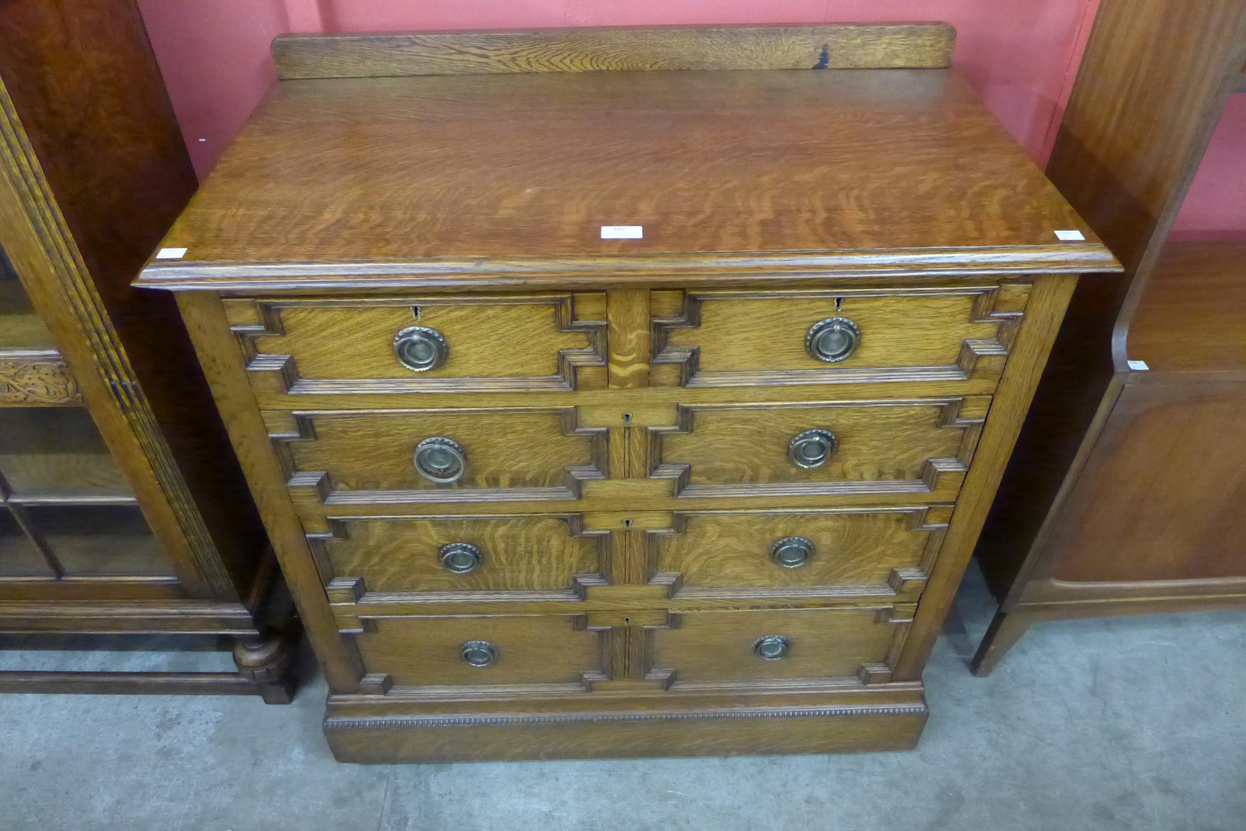 An early 20th Century oak geometric moulded chest of drawers