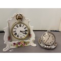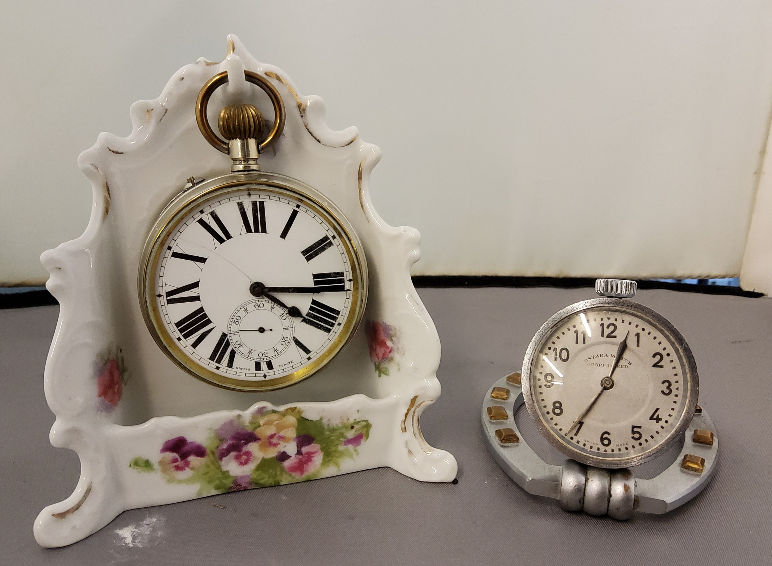 A large open faced chrome pocket watch, Roman numerals, subsiduary seconds dial; an Austrian porcelain pocket watch holder, printed with pansies, 13cm high, c.1910; etc