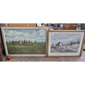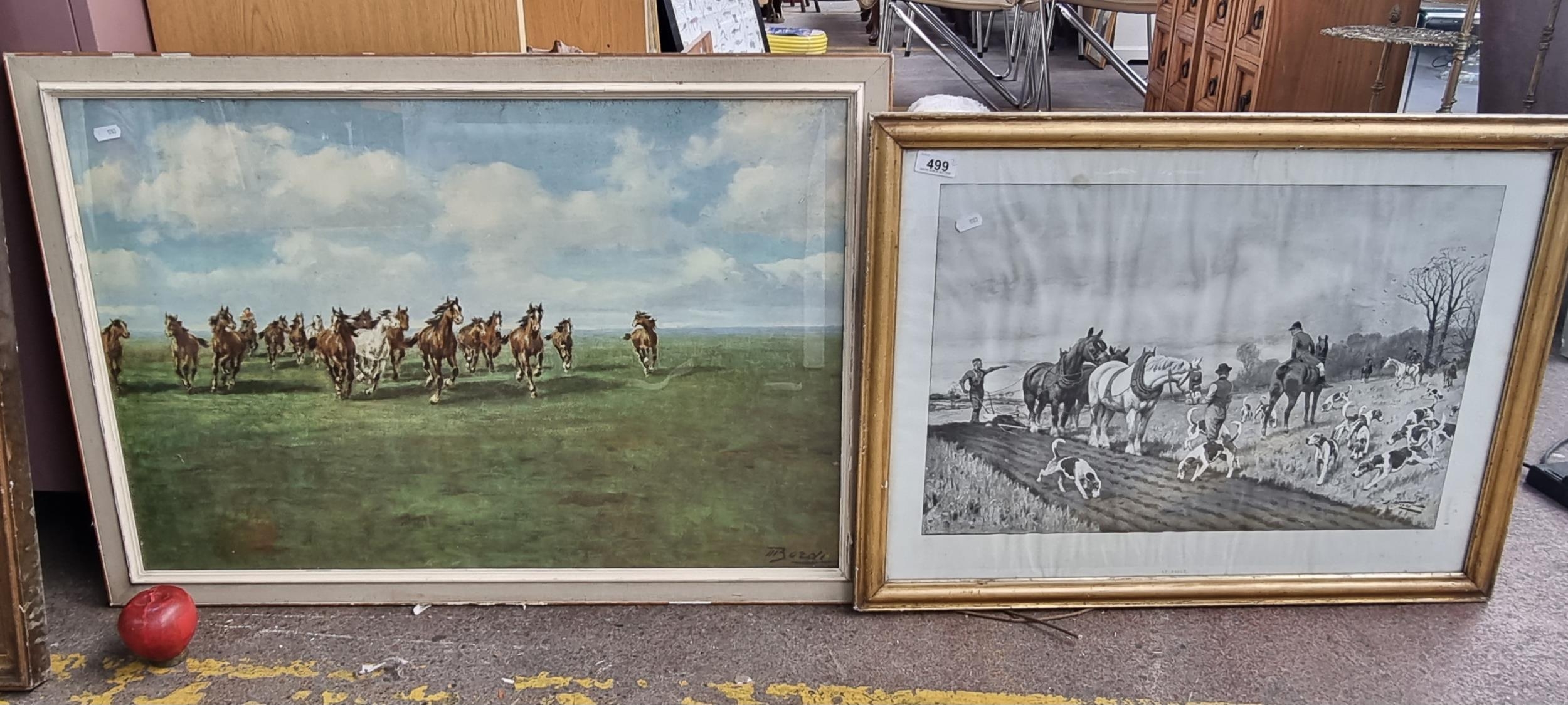 Two large prints of an equestrian nature including one titled "The Rebel Herd" original painted by the artist Mario Bordi, along with a print titled "At Fault" by the artist S. Wright. Housed in vintage frames.