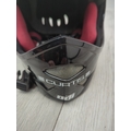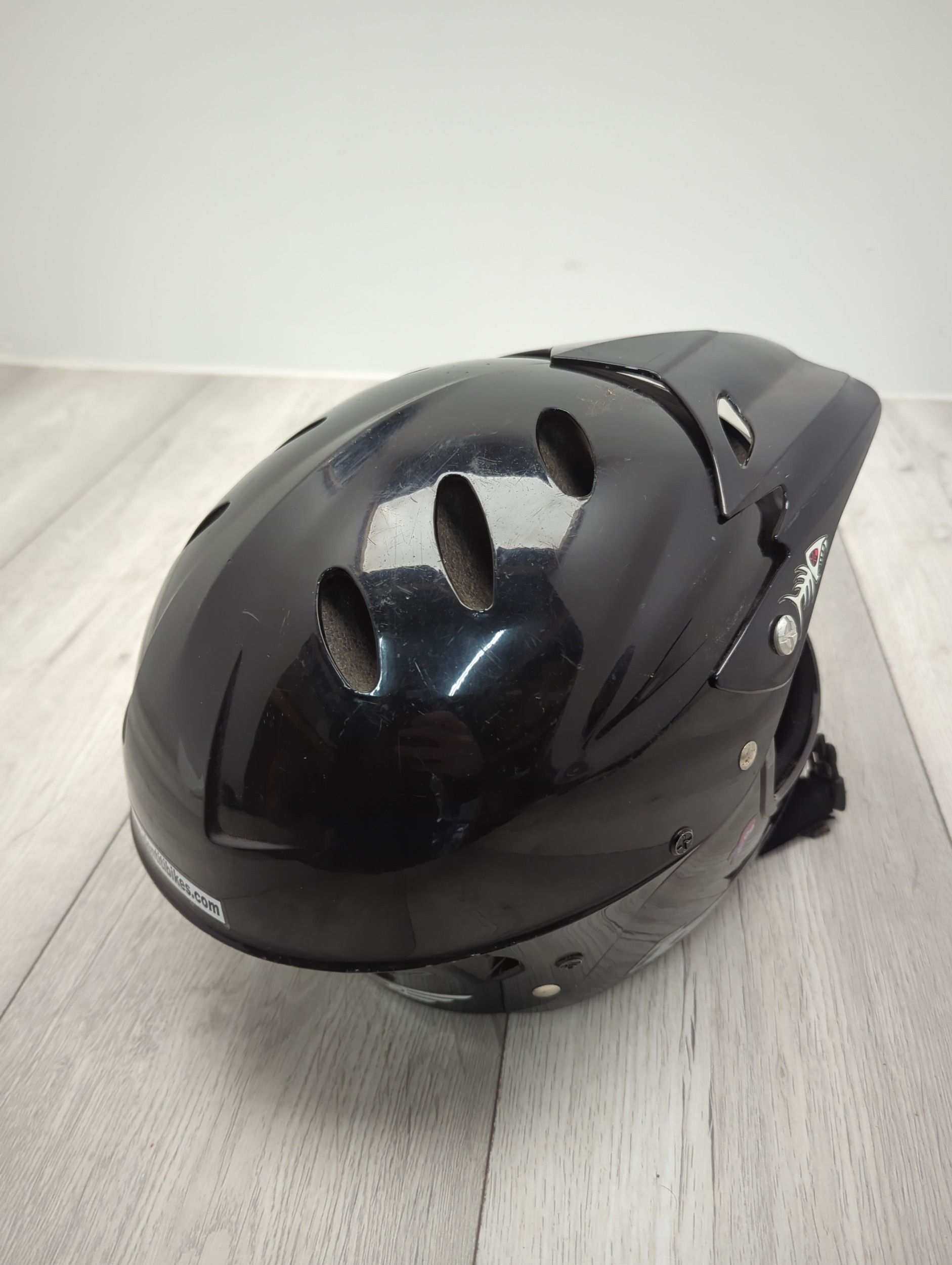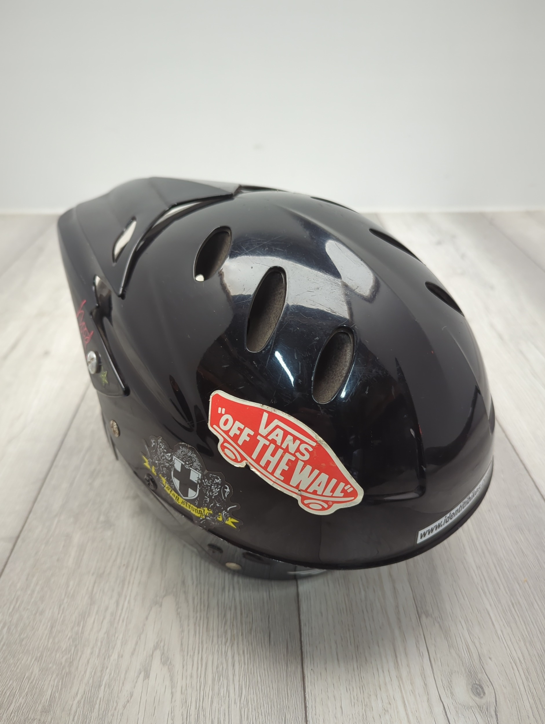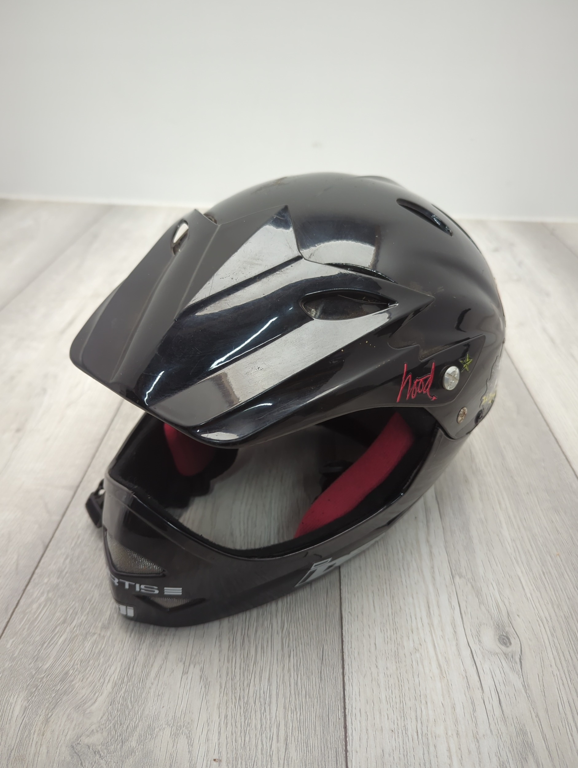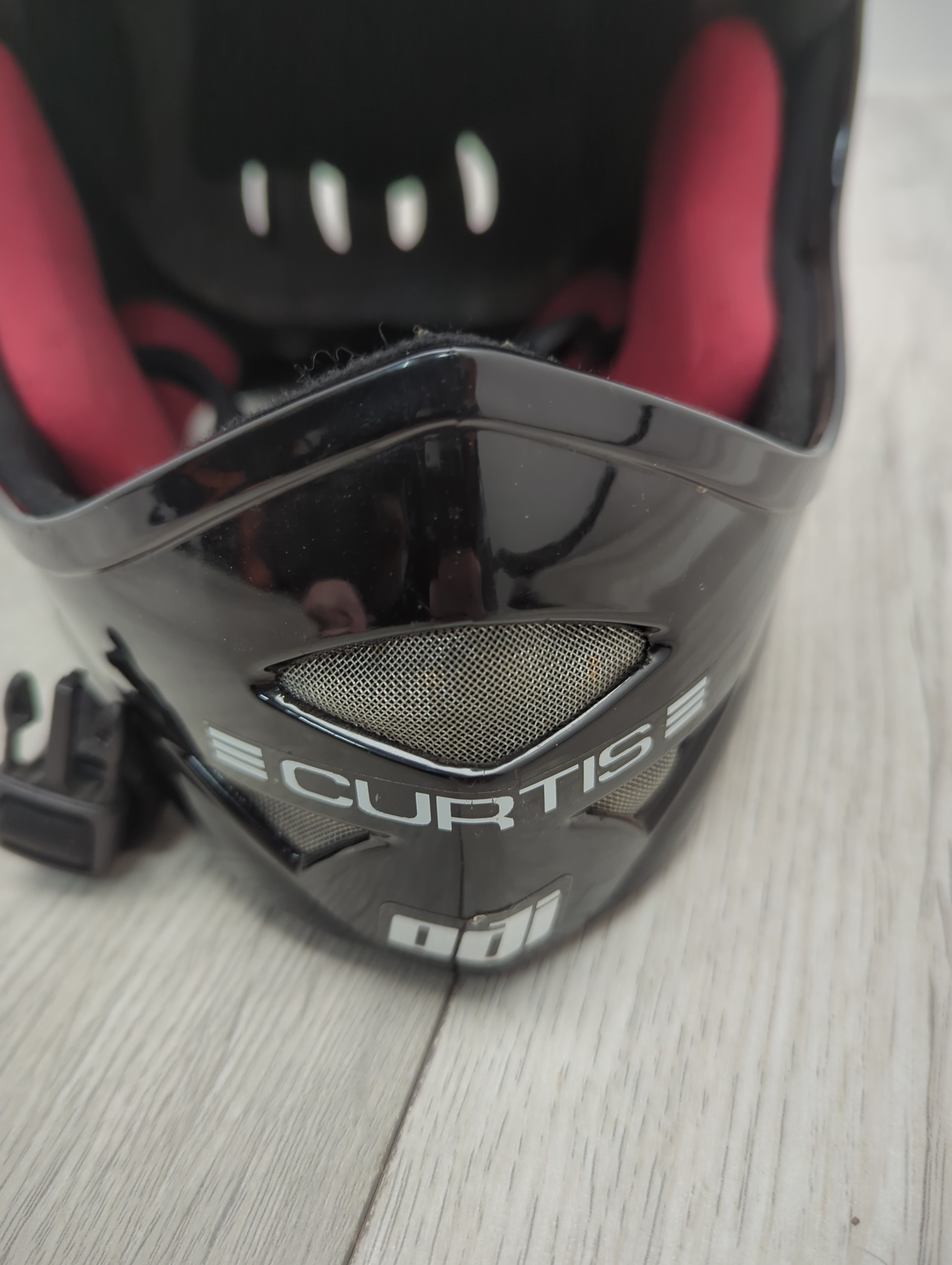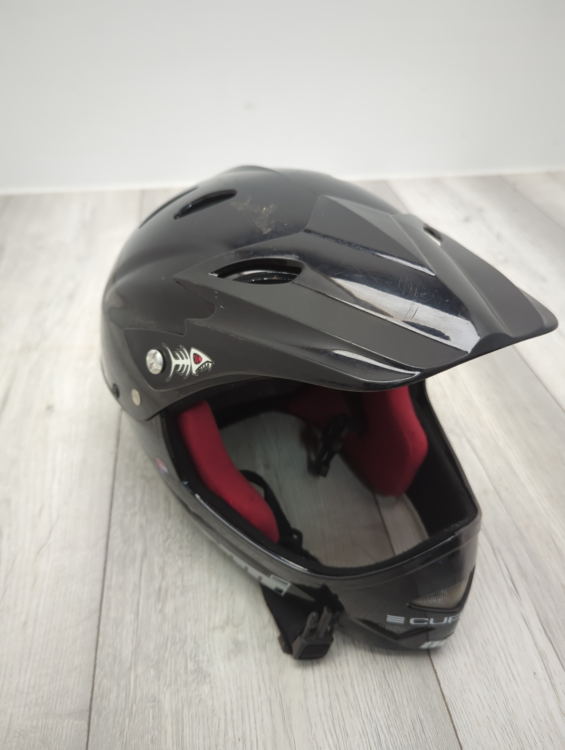This Curtis full face helmet is designed for outdoor activities and appears to offer robust protection. It features multiple ventilation openings for airflow and a visor for added protection against elements. The inner lining is padded, enhancing comfort during use. Decorative stickers, including a notable emblem, adorn the exterior, adding a personalised touch.