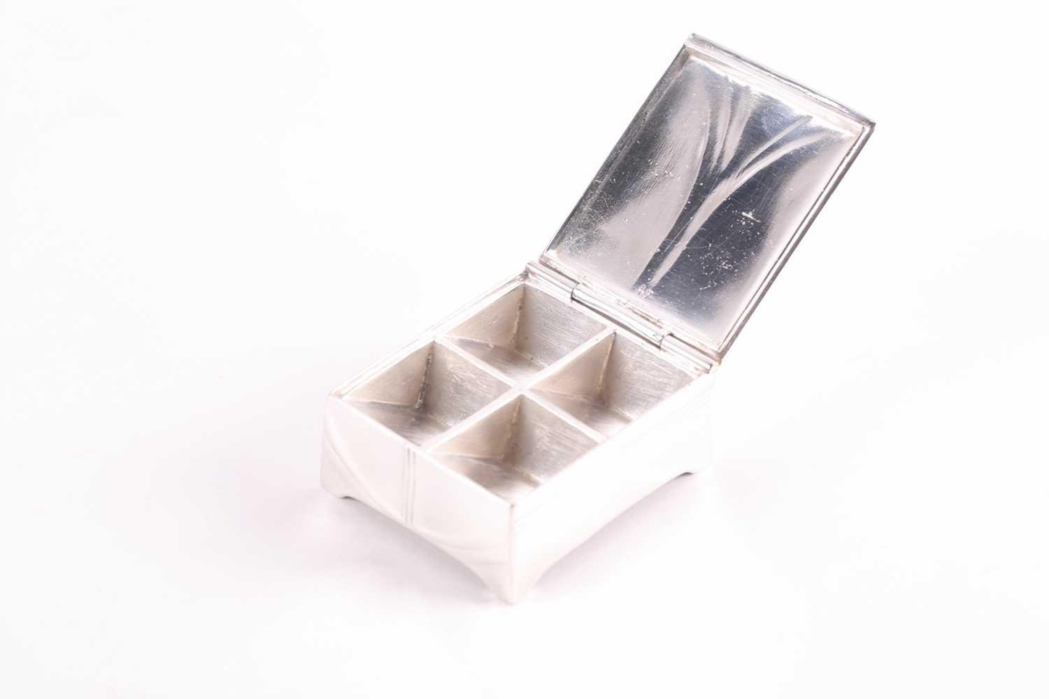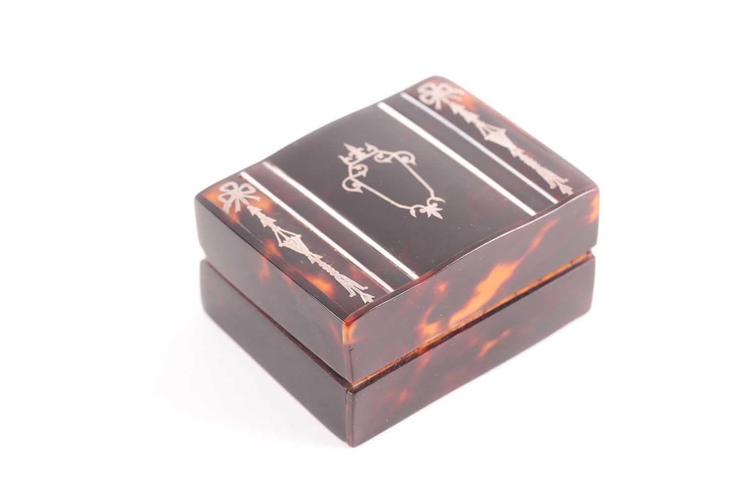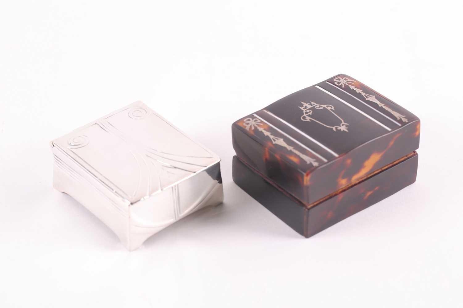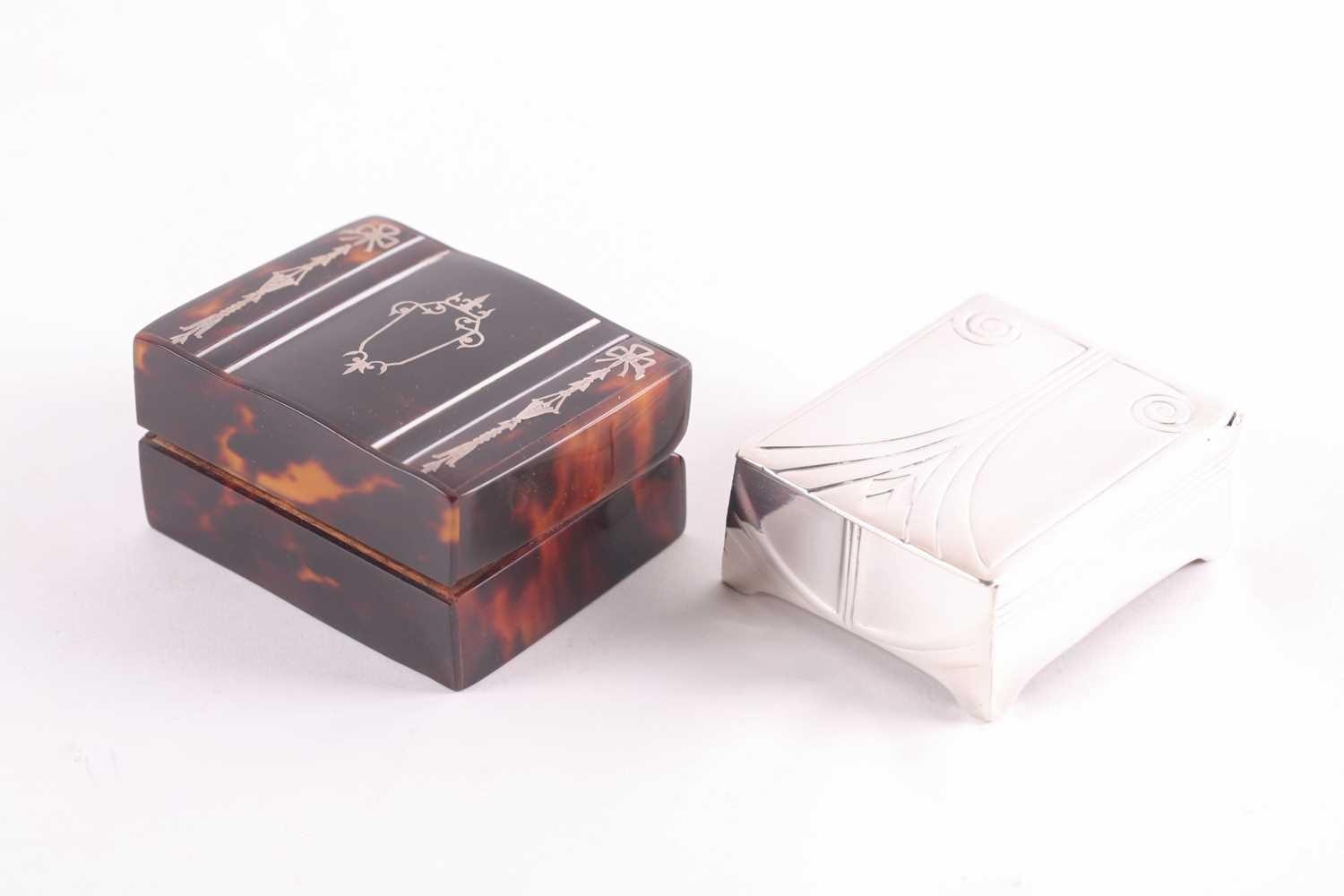 An Edwardian silver and tortoiseshell stamp box, rounded rectangular, the hinged cover with applied swags and central cartouche, the wooden interior with two stamp apertures; together with an Art Nouveau silver plated stamp box, the hinged cover opening to reveal four apertures. (2)