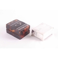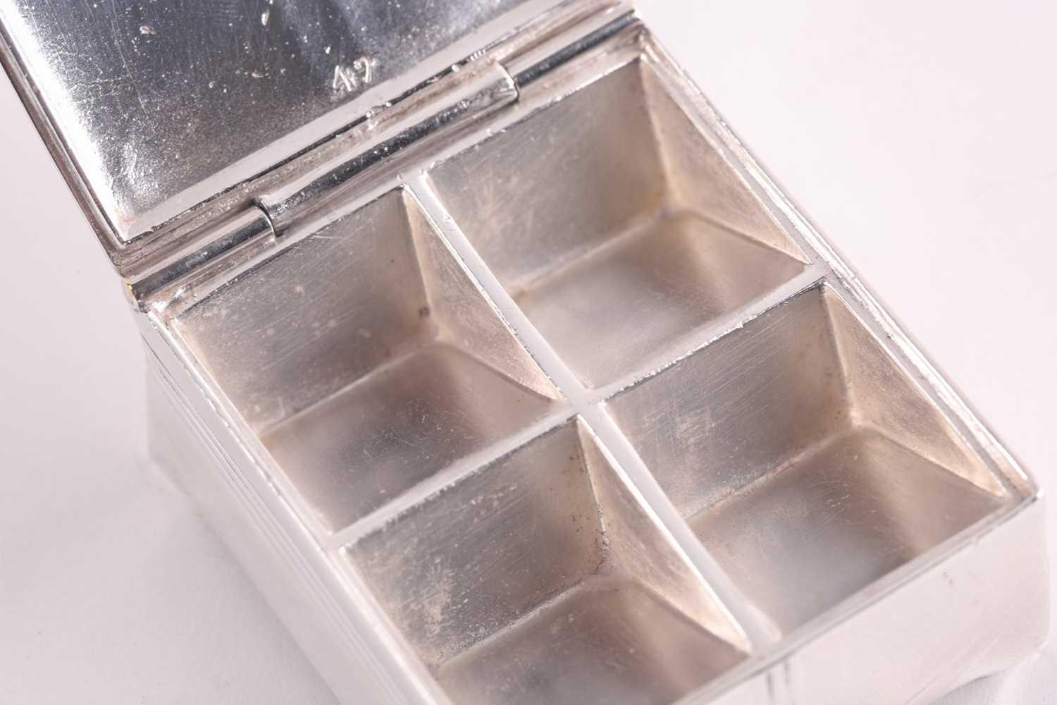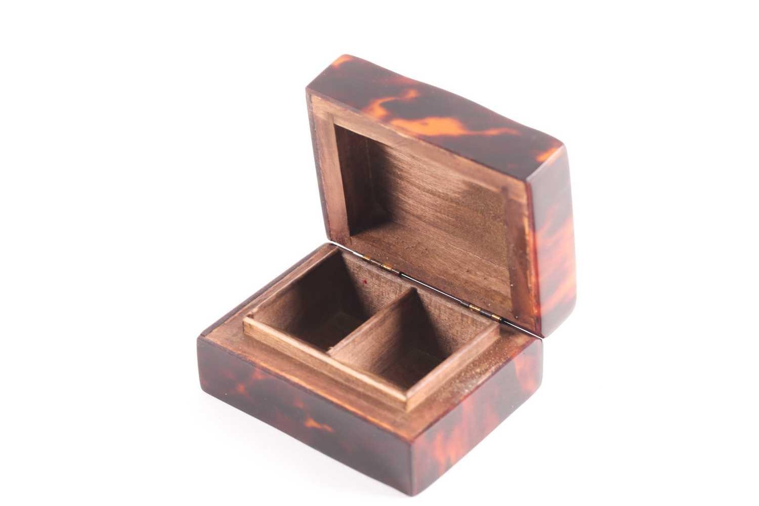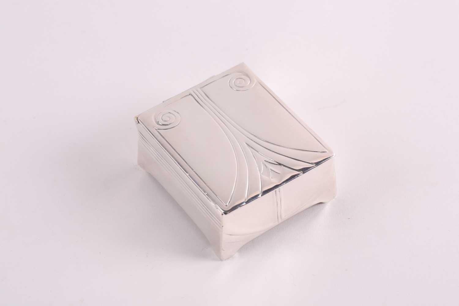 An Edwardian silver and tortoiseshell stamp box, rounded rectangular, the hinged cover with applied swags and central cartouche, the wooden interior with two stamp apertures; together with an Art Nouveau silver plated stamp box, the hinged cover opening to reveal four apertures. (2)