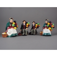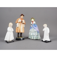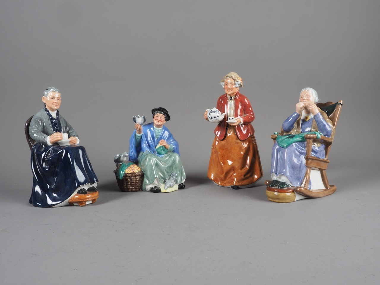 Four Doulton figures "Tea Time", "The Cup of Tea", "A Stitch in Time" and "Tuppence a Bag"