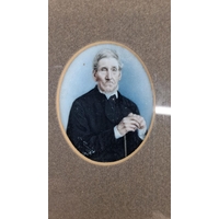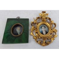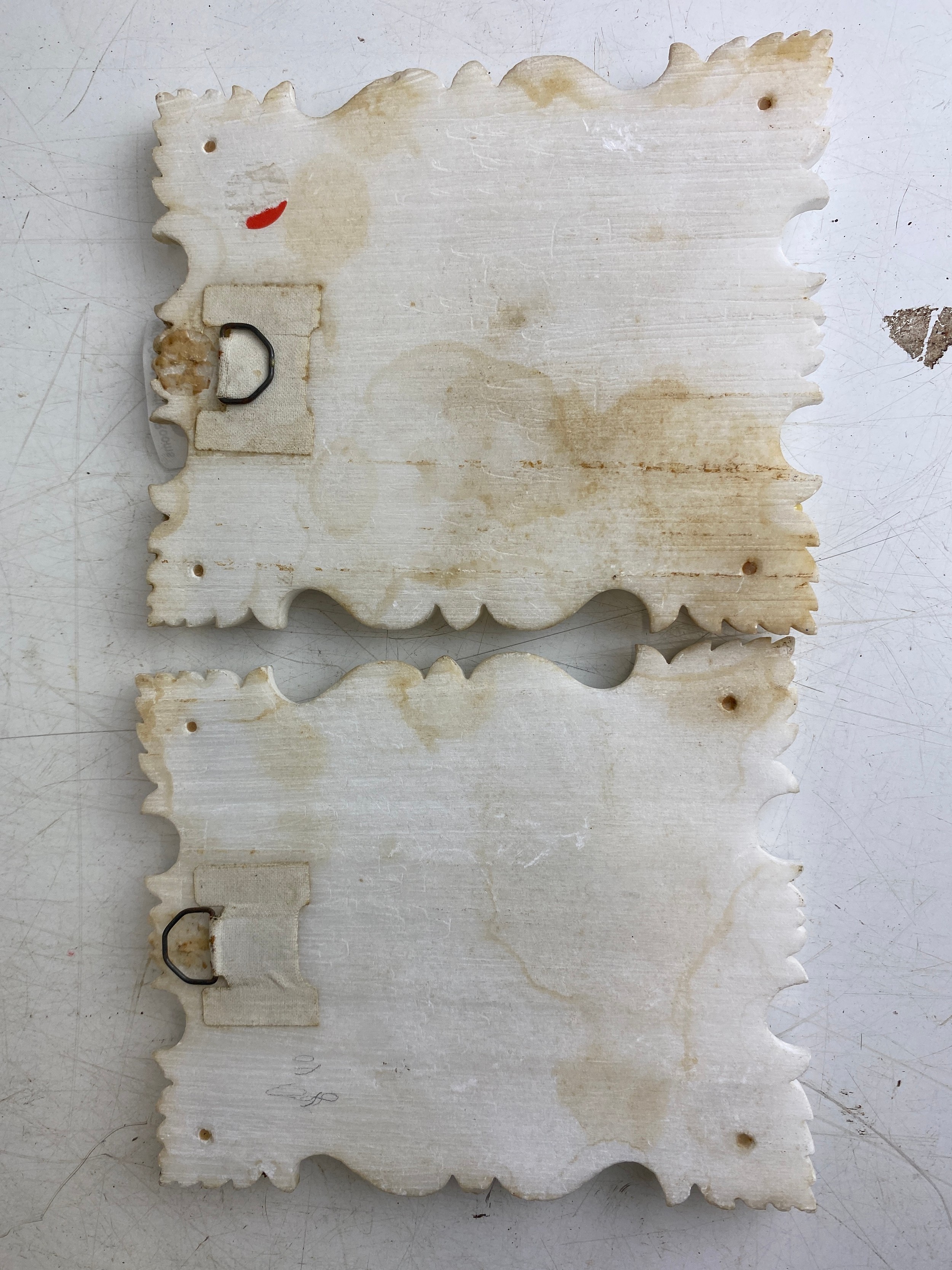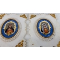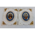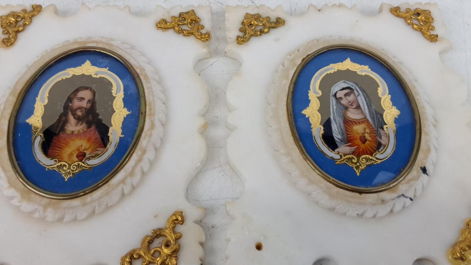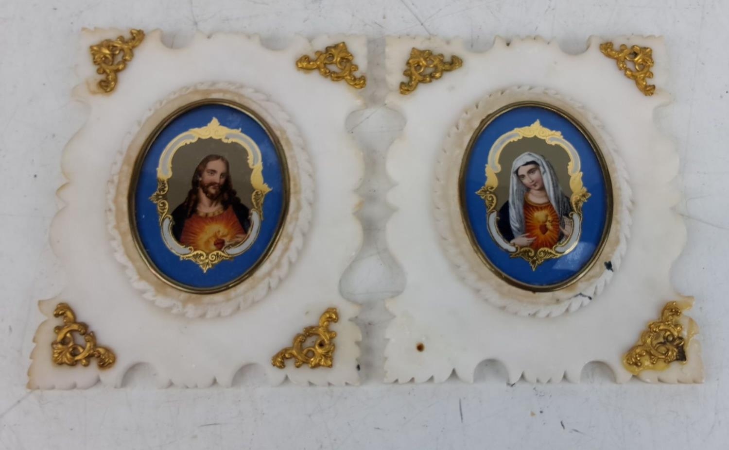 Pair of religious icons in white marble frames with gold detailing, featuring portraits of the Sacred Heart of Jesus and the Immaculate Heart of Mary, measuring 12cm x 14cm.