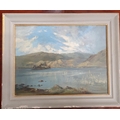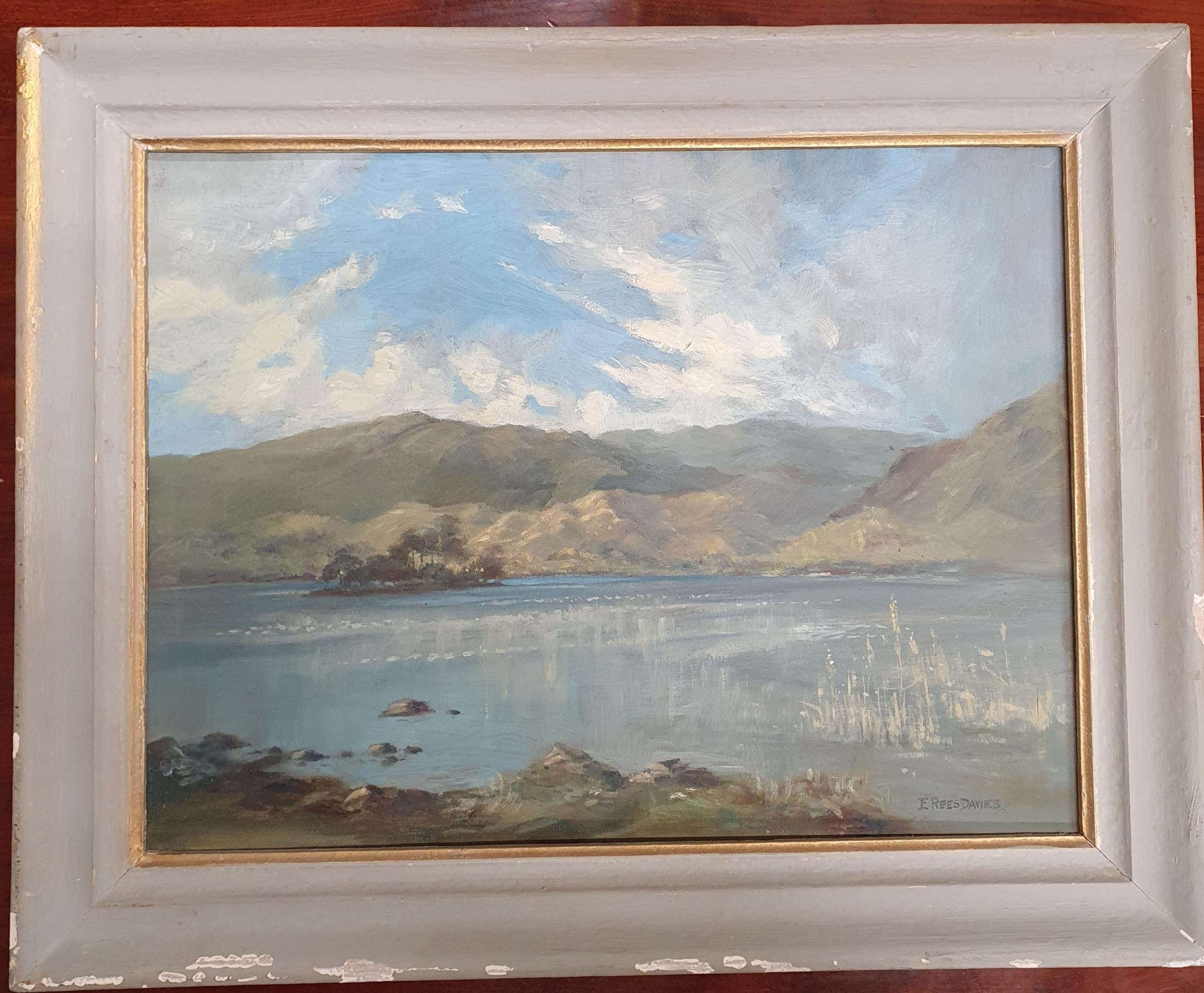 Edith Rees-Davies. A 20th Century Oil on Board of a lake scene with rushes to the fore. Signed LR.