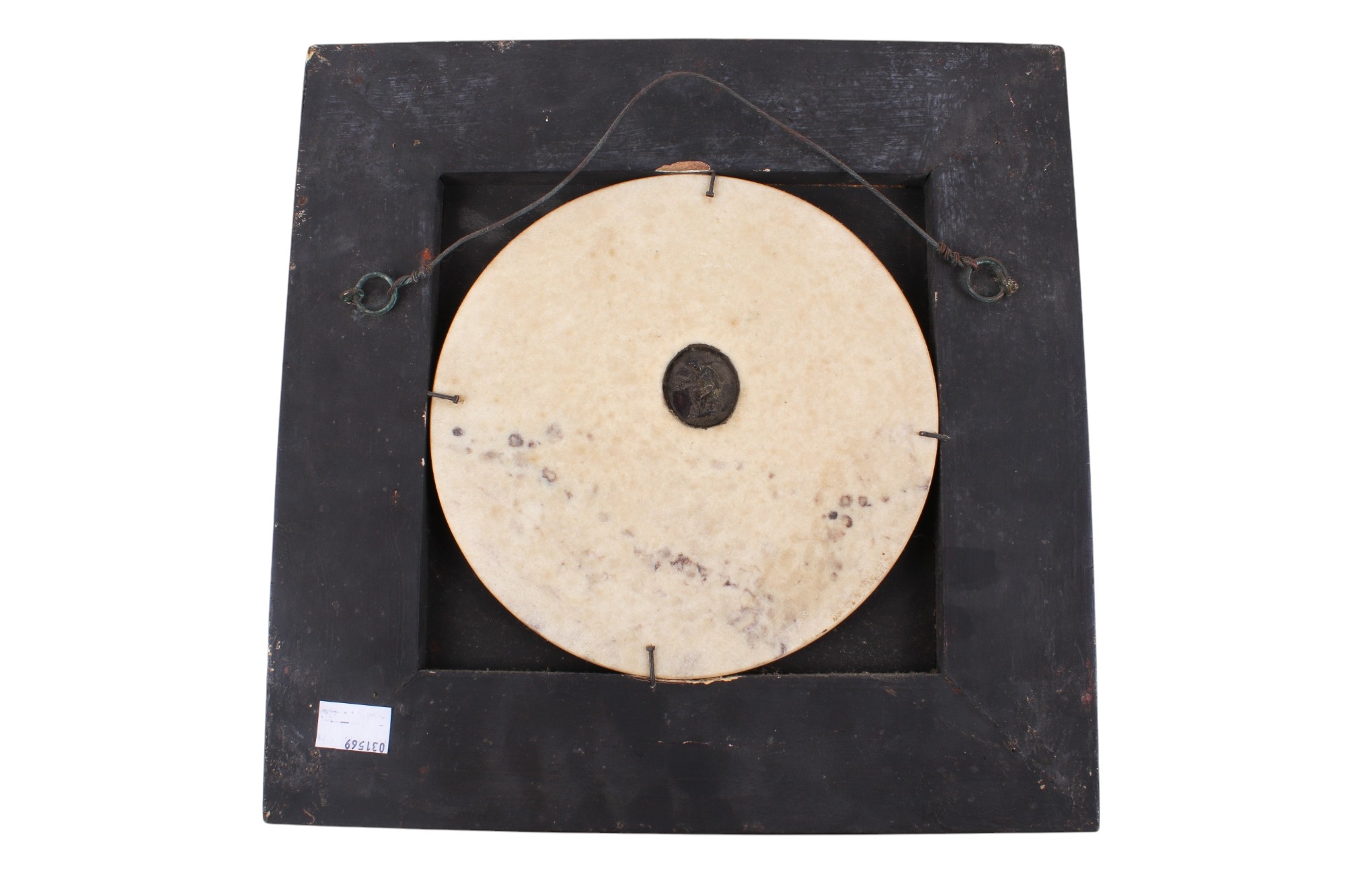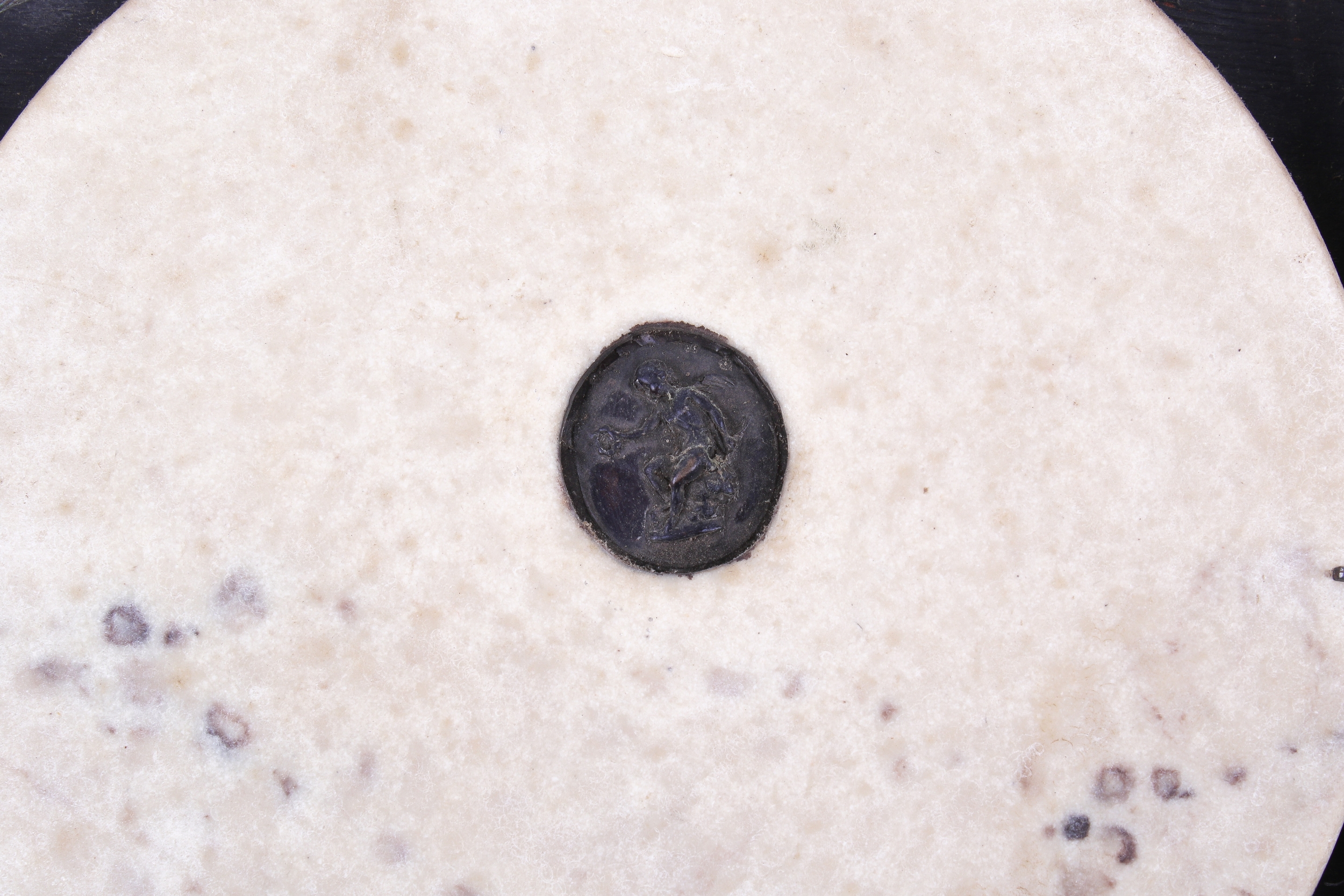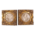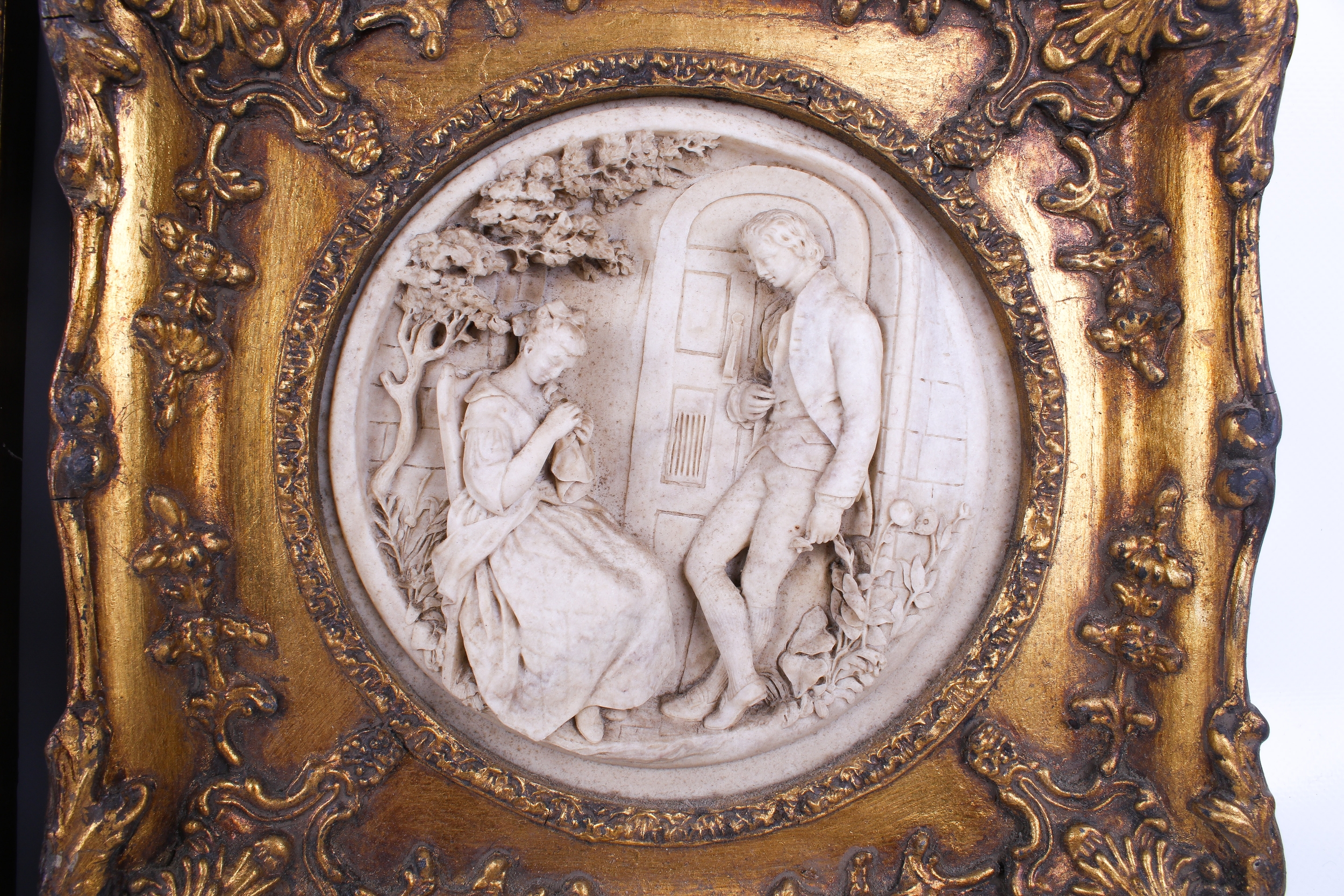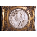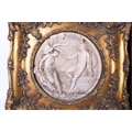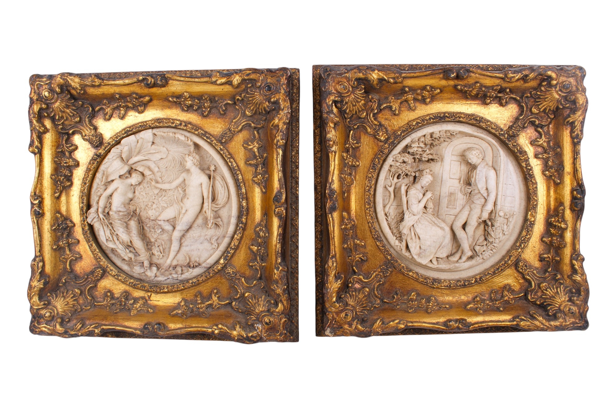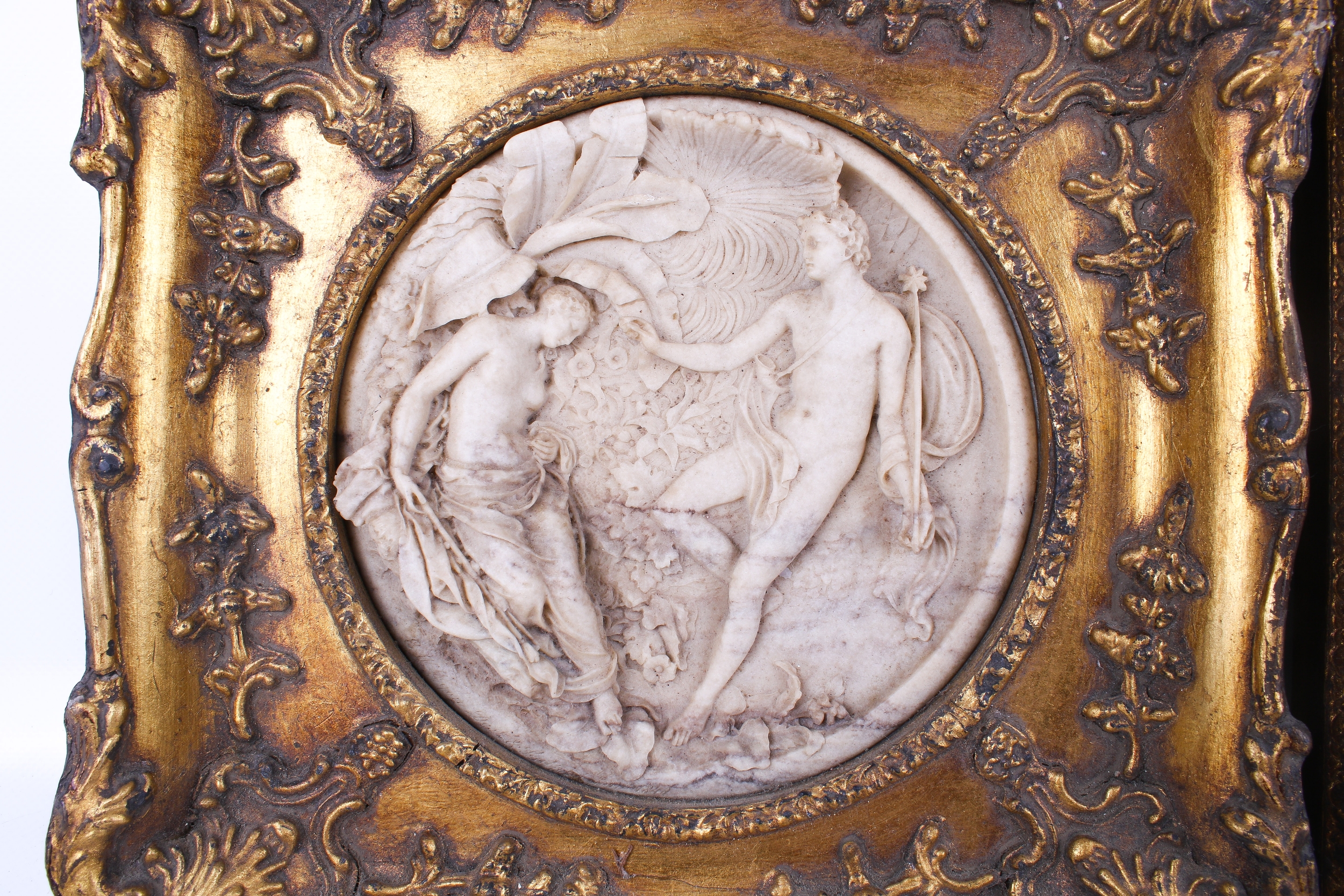 Edward William Wyon (1811-1885), two Victorian carved marble plaques held within gilt ornate frames. One of the circular composite relief panels depicting a courting couple, the other depicting Titiana and Oberon, characters from the play 'A Midsummer Night's Dream' by William Shakespeare. Signed and dated in the work 'E.W. WYON DES & SCULP 1st JAN 1848', both with bronze relief medallion depicting Cupid to the verso, Diameter 17cm, framed 29.5cm x 29.5cm