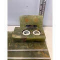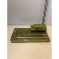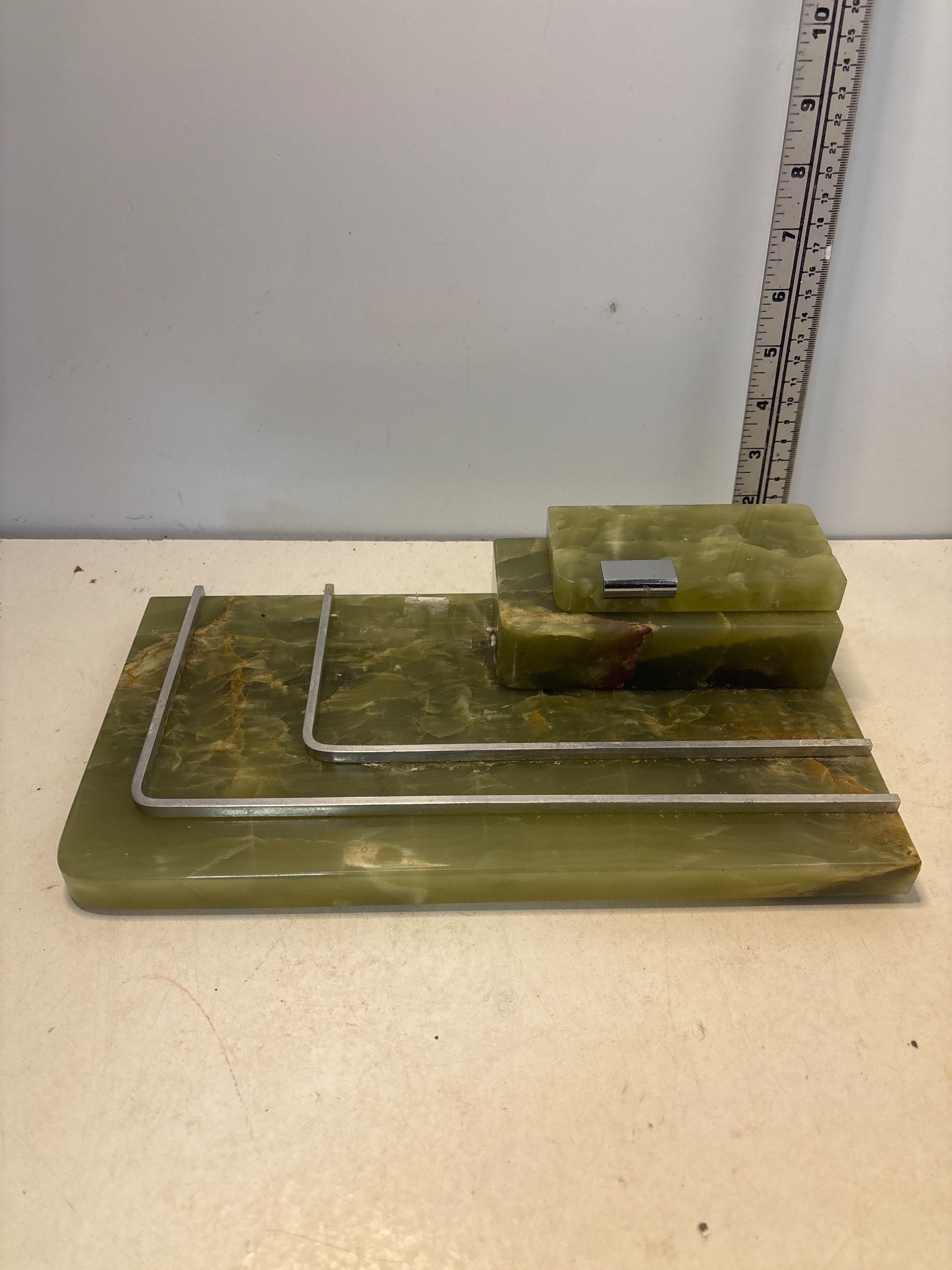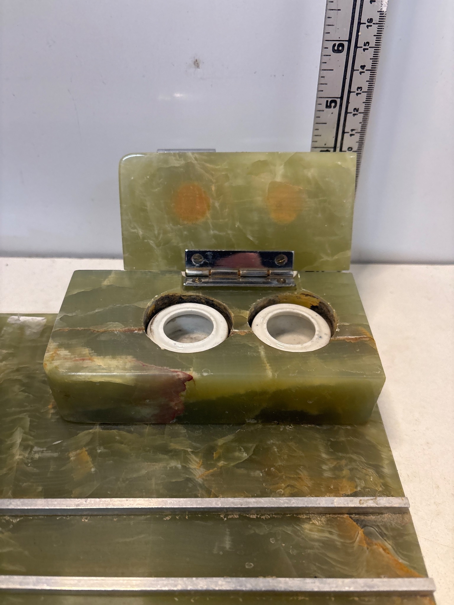 Onyx desk set with pen rest, blotter holder, and inkwells.