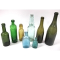 A Harrogate Spa Water Bottle, in green glass, embossed 'Harrogate Bottle at the Royal Pump Room', the base 22cm high, a 'R.P. Culley and Co Ld' green glass bottle, 21cm high, a blue 'Woodward Chemist, Nottingham' bottle, a 'Globe, Salford' bottle, a 'Bigg and Co., Manchester' bottle and three others. (8)