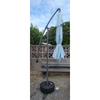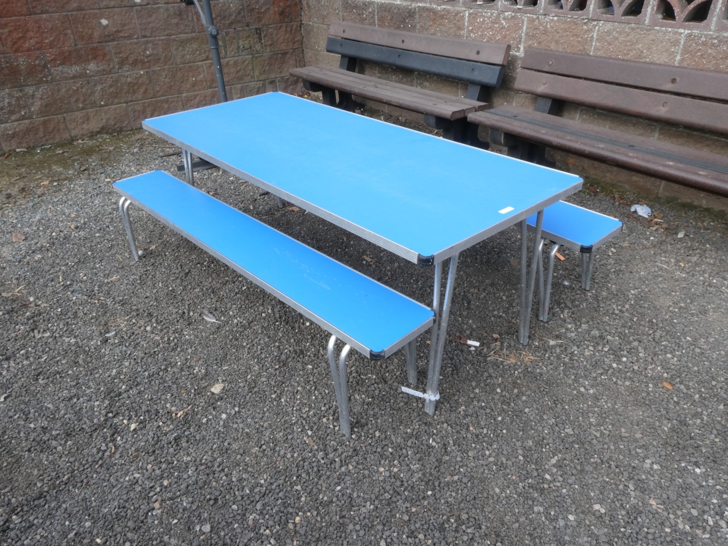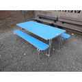 A folding picnic table together with two matching benches