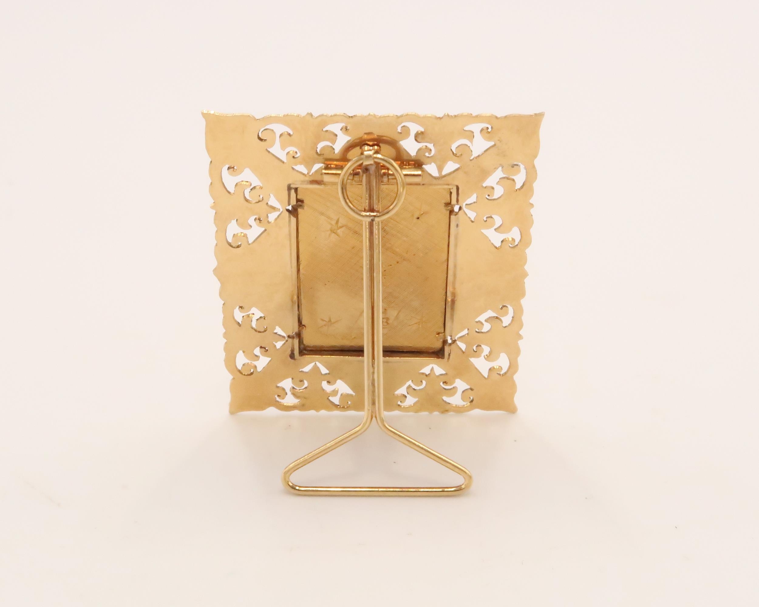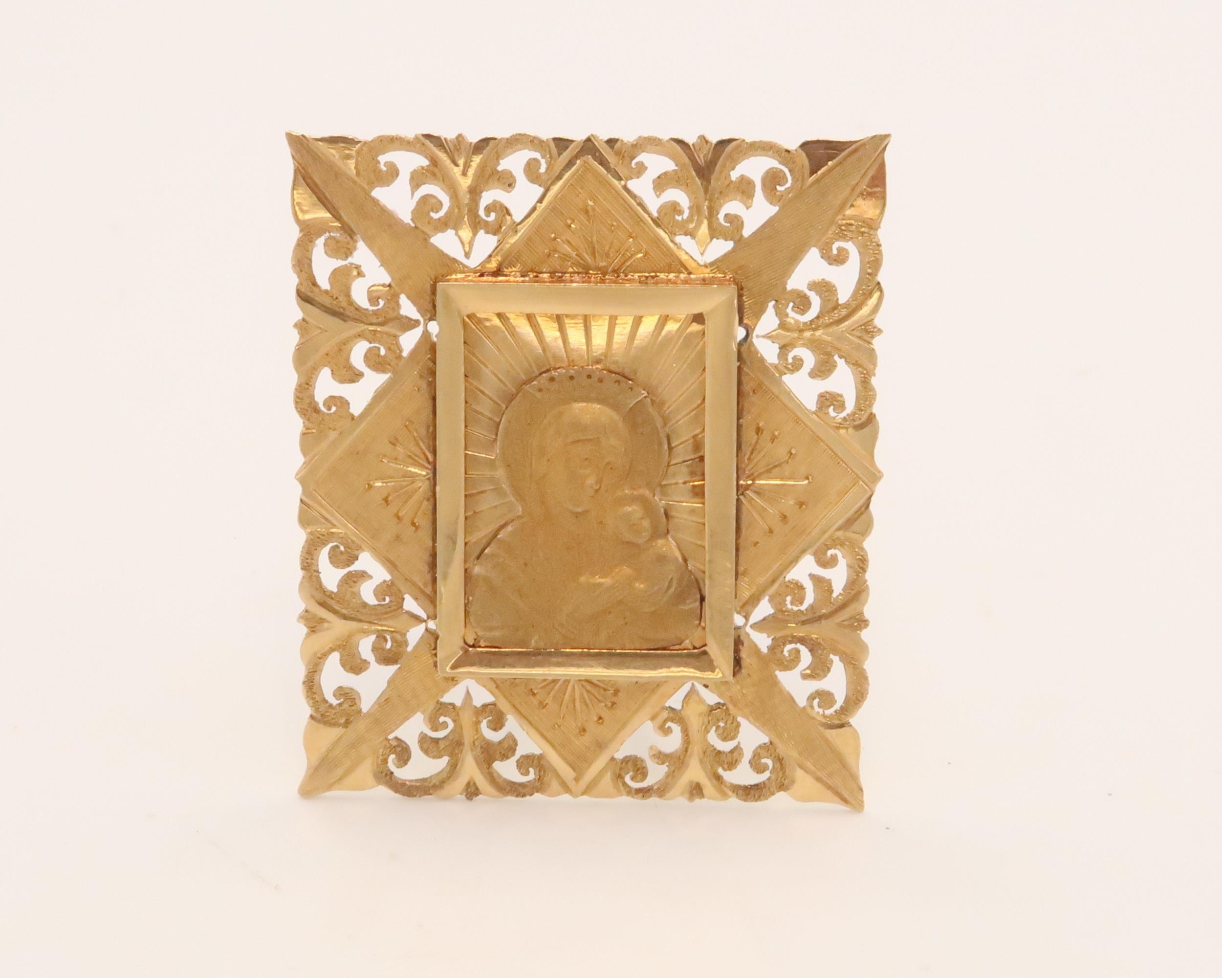 An 18ct Tested Madonna & Child Pendant with stand, featuring an elaborately worked border.