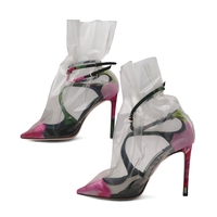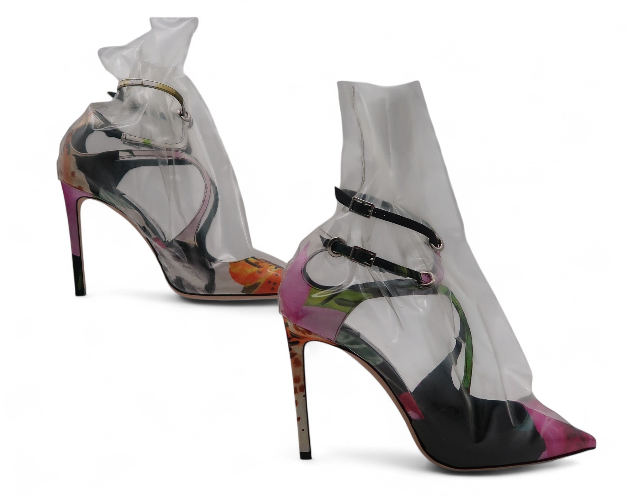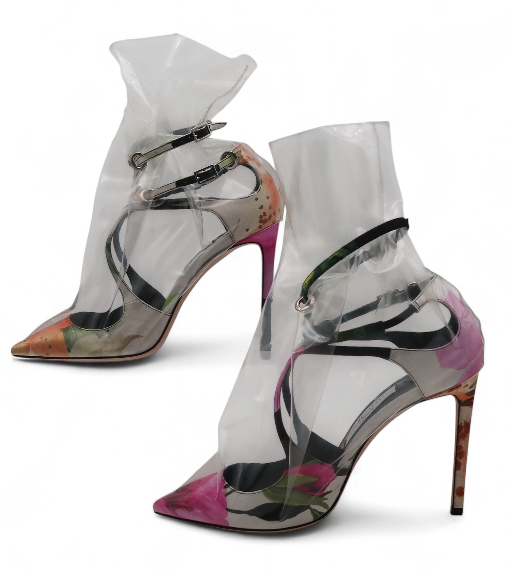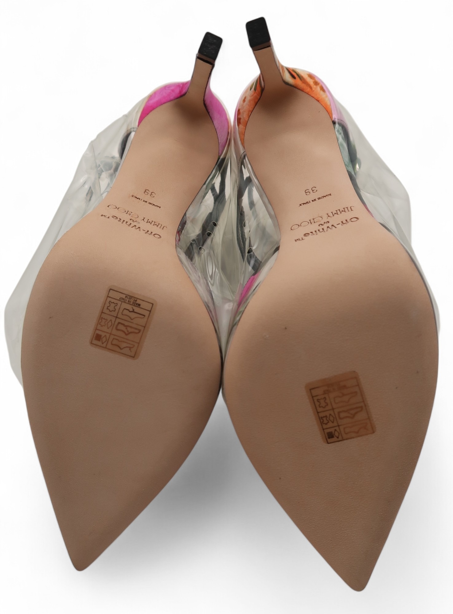 A pair of Jimmy Choo Off-White Claire 100 floral mix/transparent high heel shoes, size 9, with box