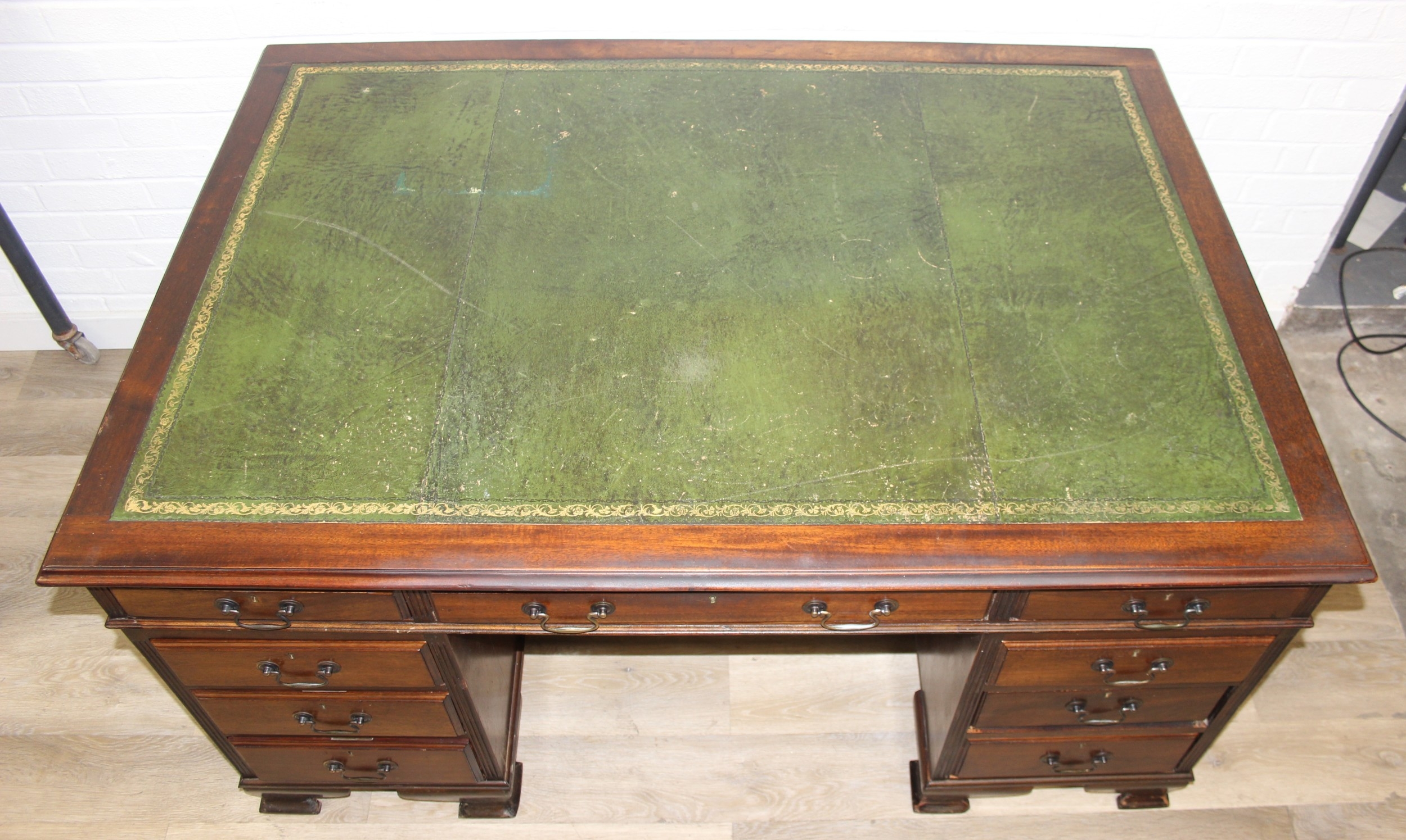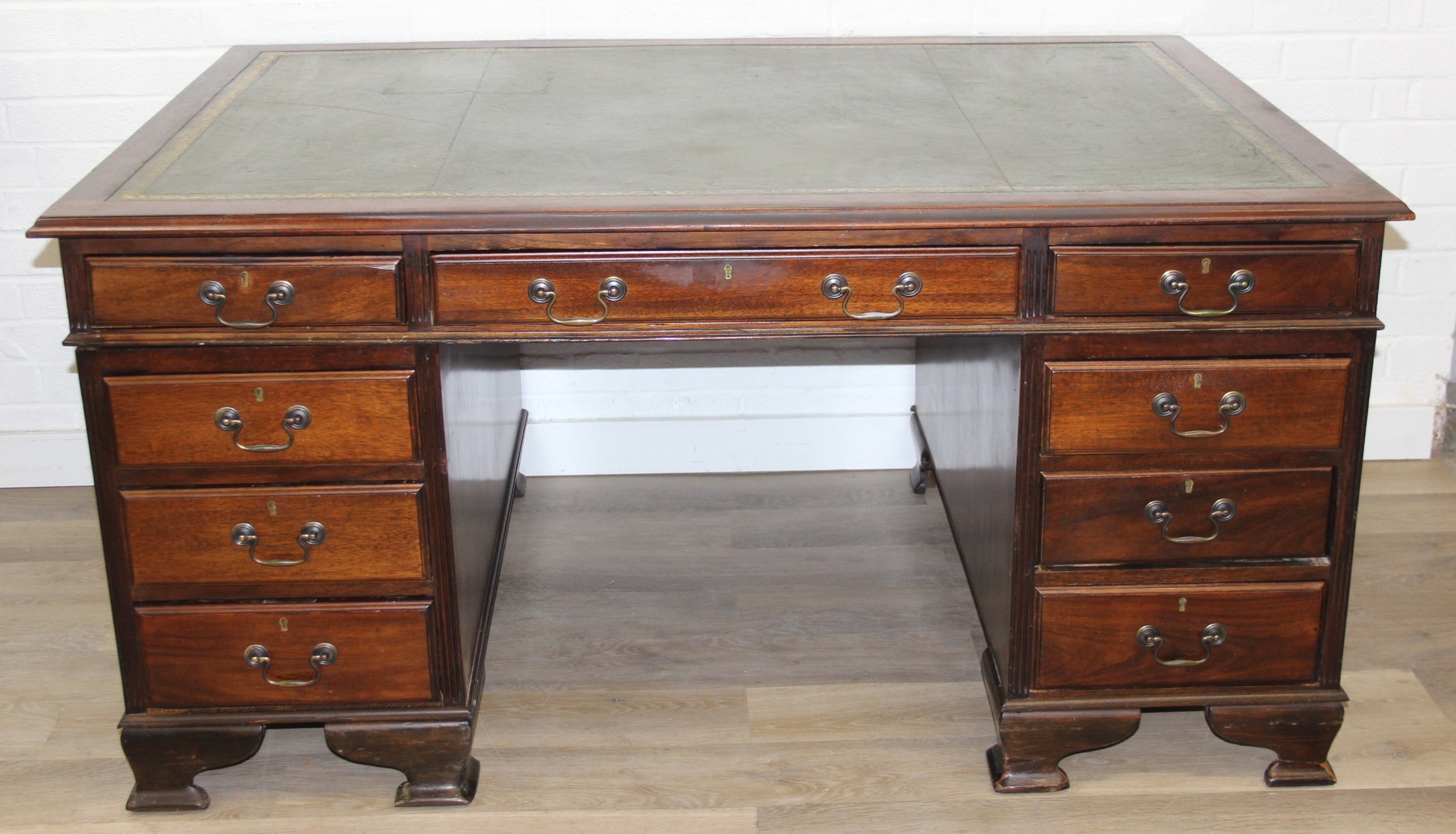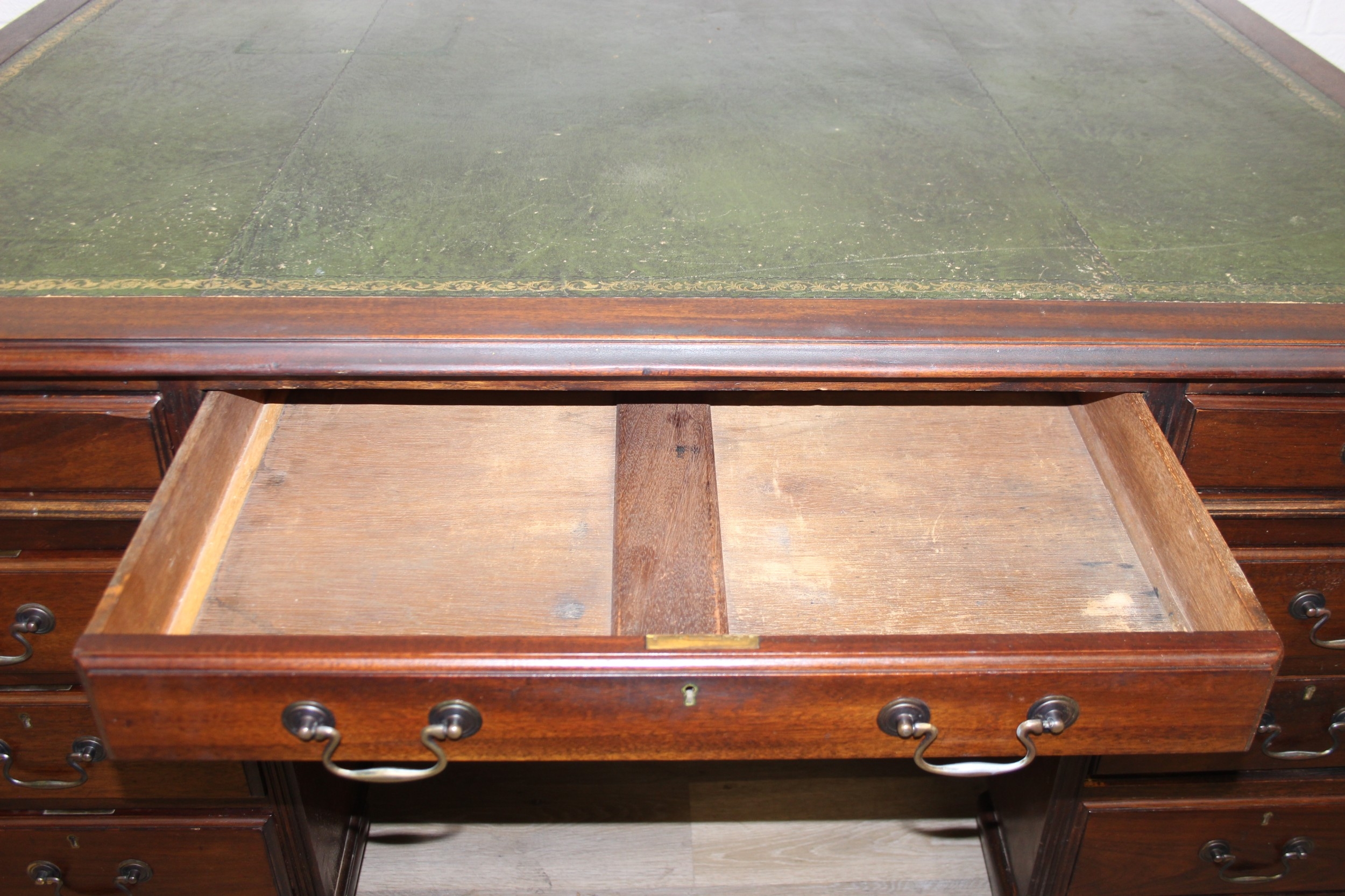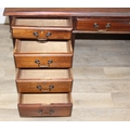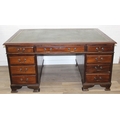 A vintage mahogany partner's three-part pedestal desk with inset green leather top, eighteen drawers [nine on either side], 20th century, 152cm x 107cm x 77cm
