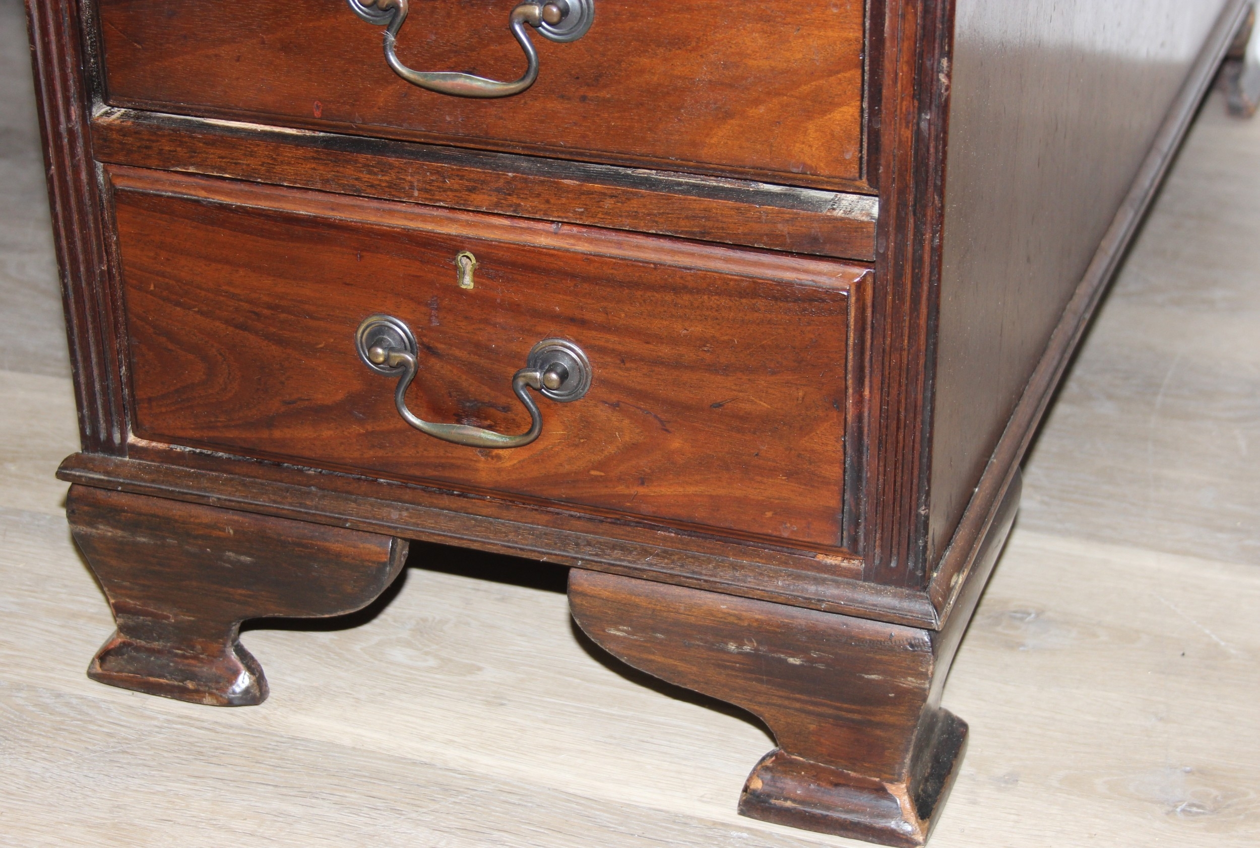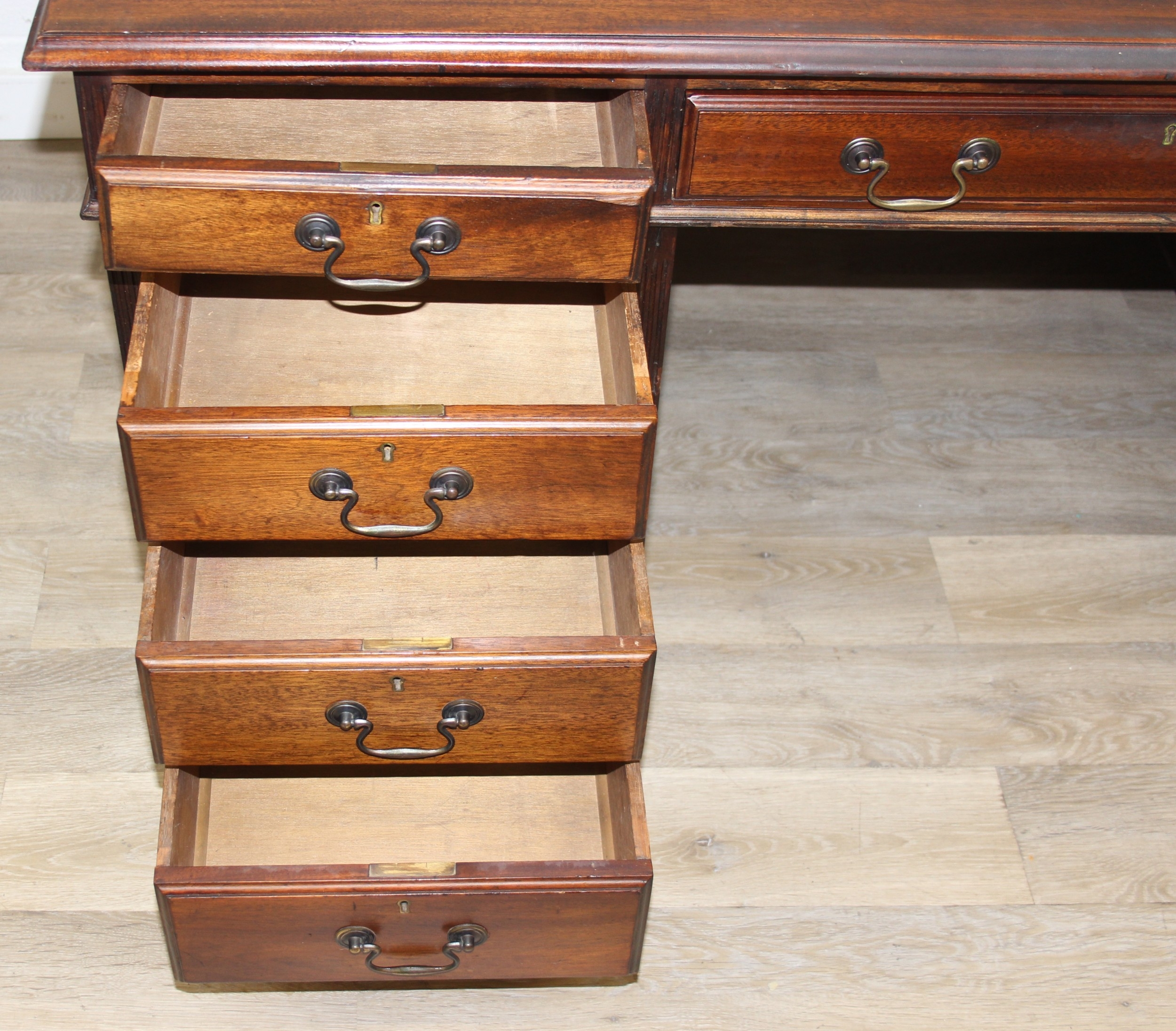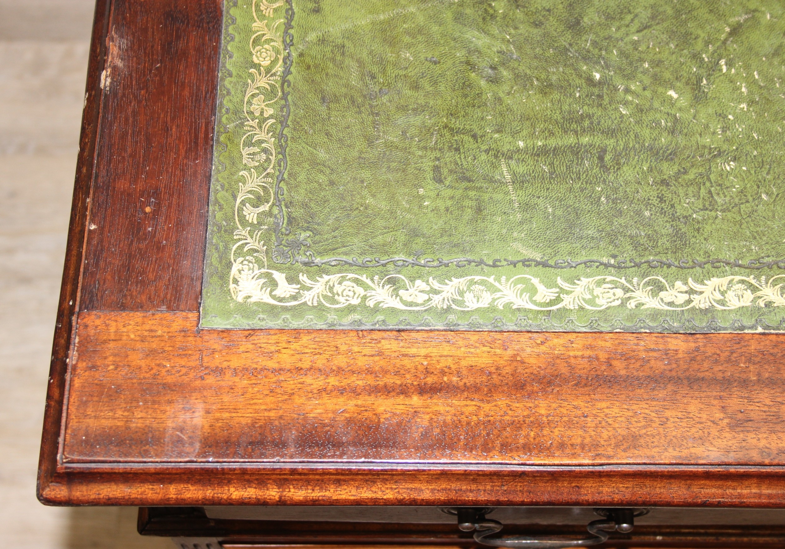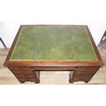 A vintage mahogany partner's three-part pedestal desk with inset green leather top, eighteen drawers [nine on either side], 20th century, 152cm x 107cm x 77cm
