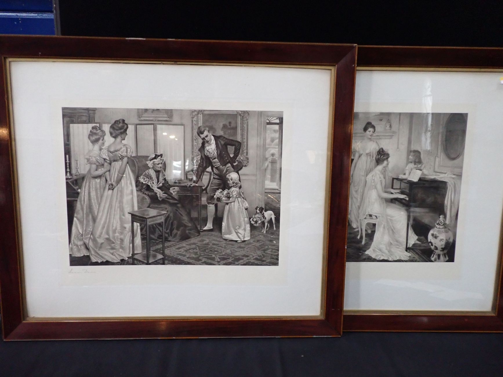 TWO EDWARDIAN INTERIOR SCENES, AFTER LUCIEN DAVISAND D. DOWNING both with signatures to the margin, published by Jesse Boot 1904 and 1902, in contemporaneous frames 76 x 88cm overall (a/f)