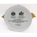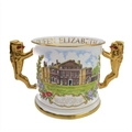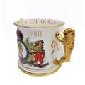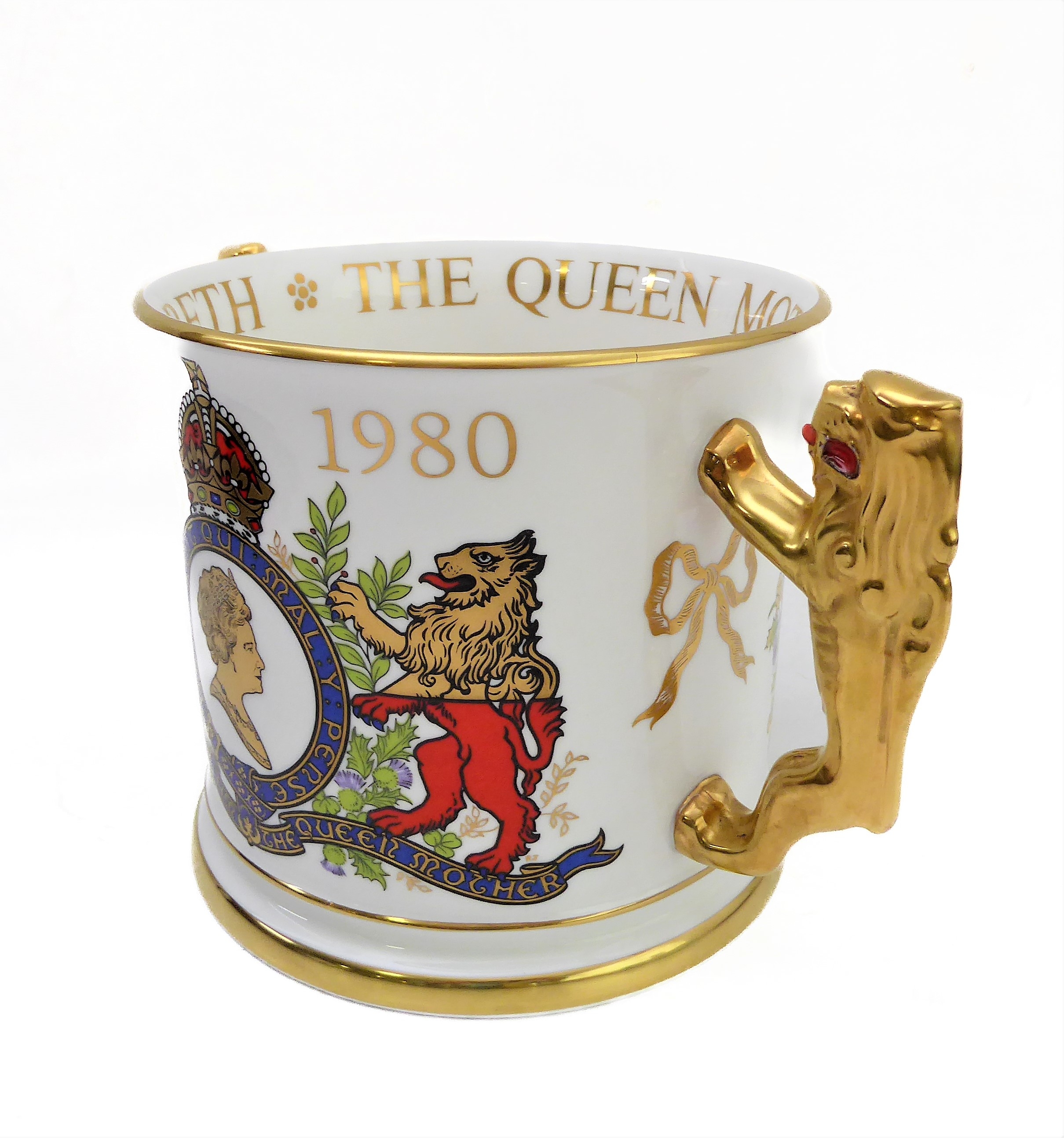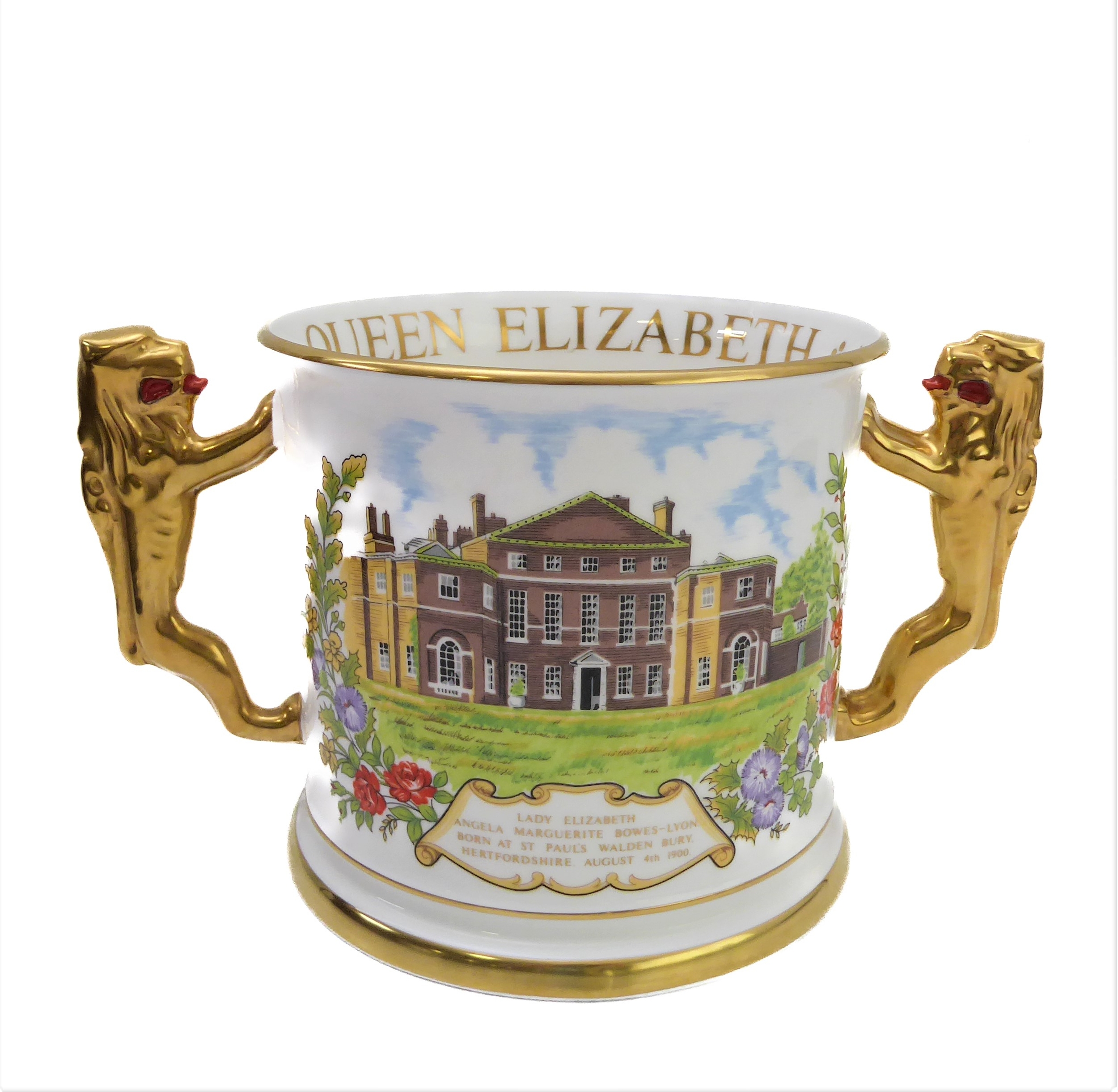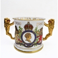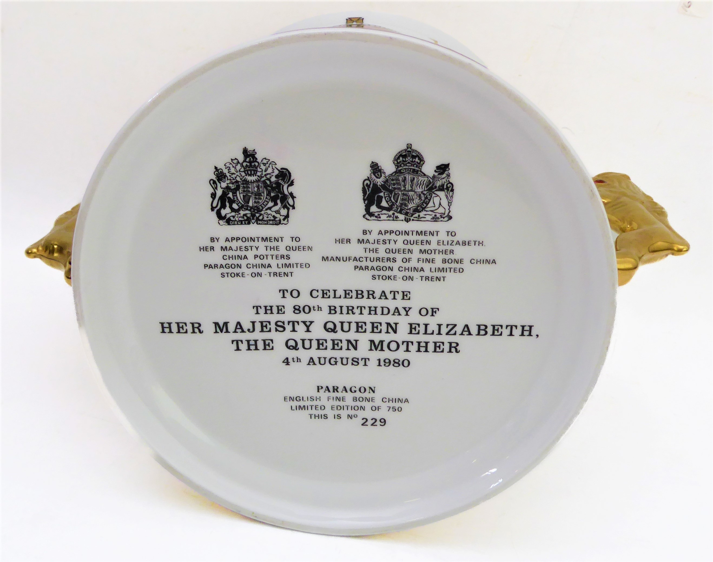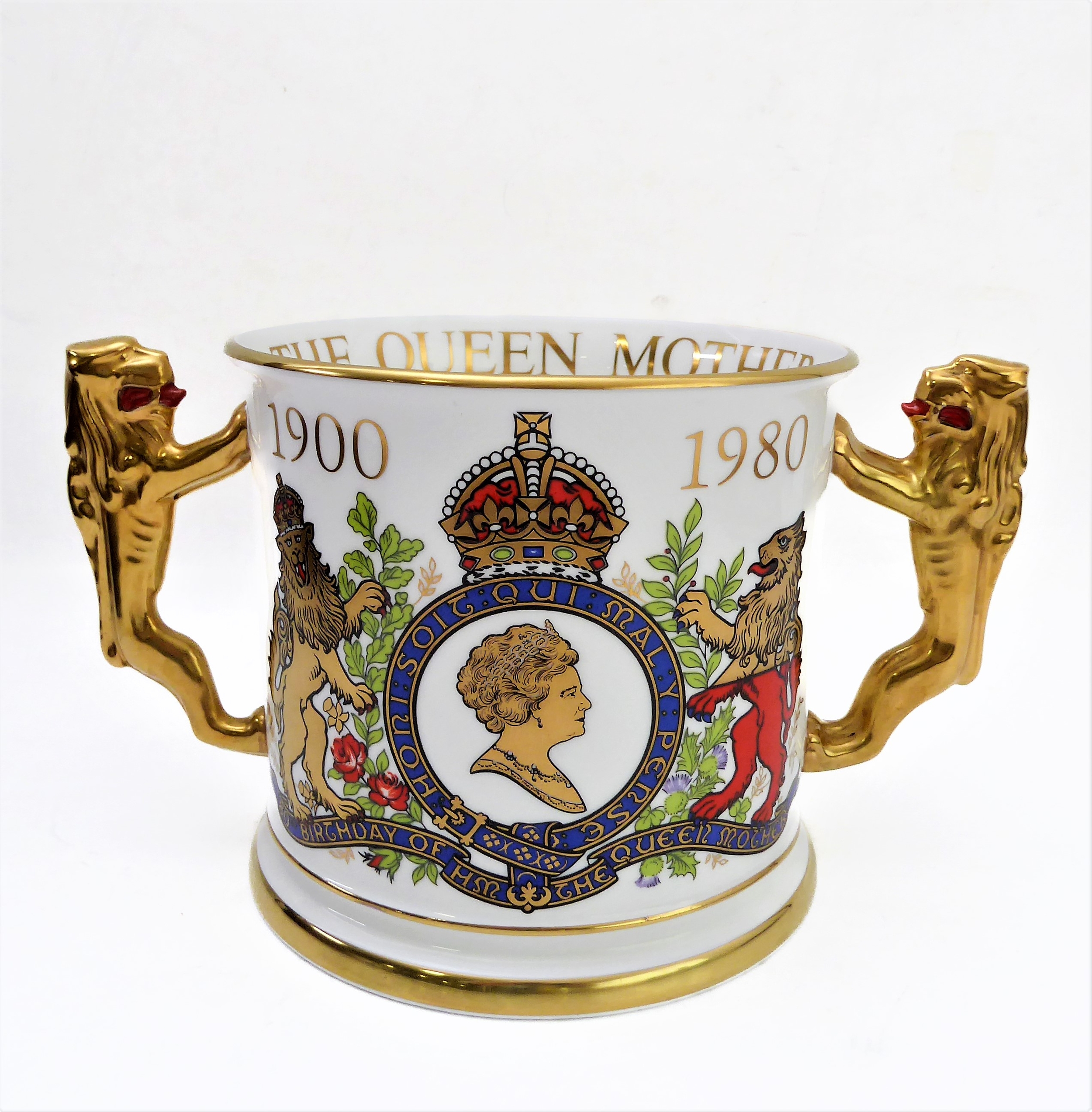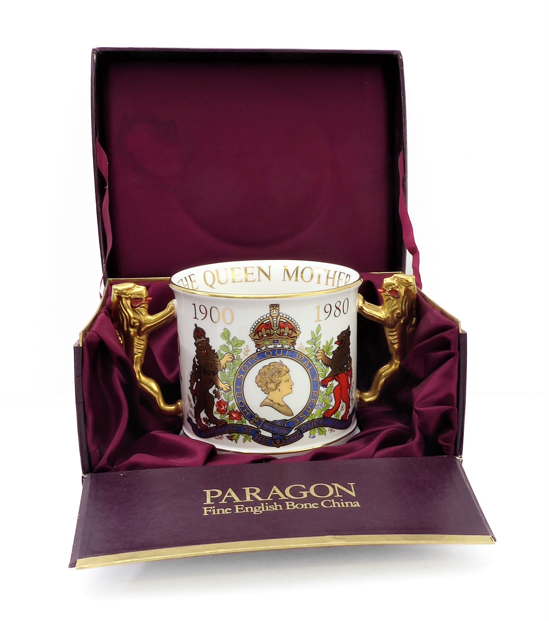 A fine Paragon English Bone China two-handled loving cup: finely hand-gilded and the two handles modelled as lions salient; limited edition 229 of 750 produced 'to celebrate the 80th Birthday of HM Queen Elizabeth, the Queen Mother - 4th August 1980'; fitted box. (22.5cm wide including handles)