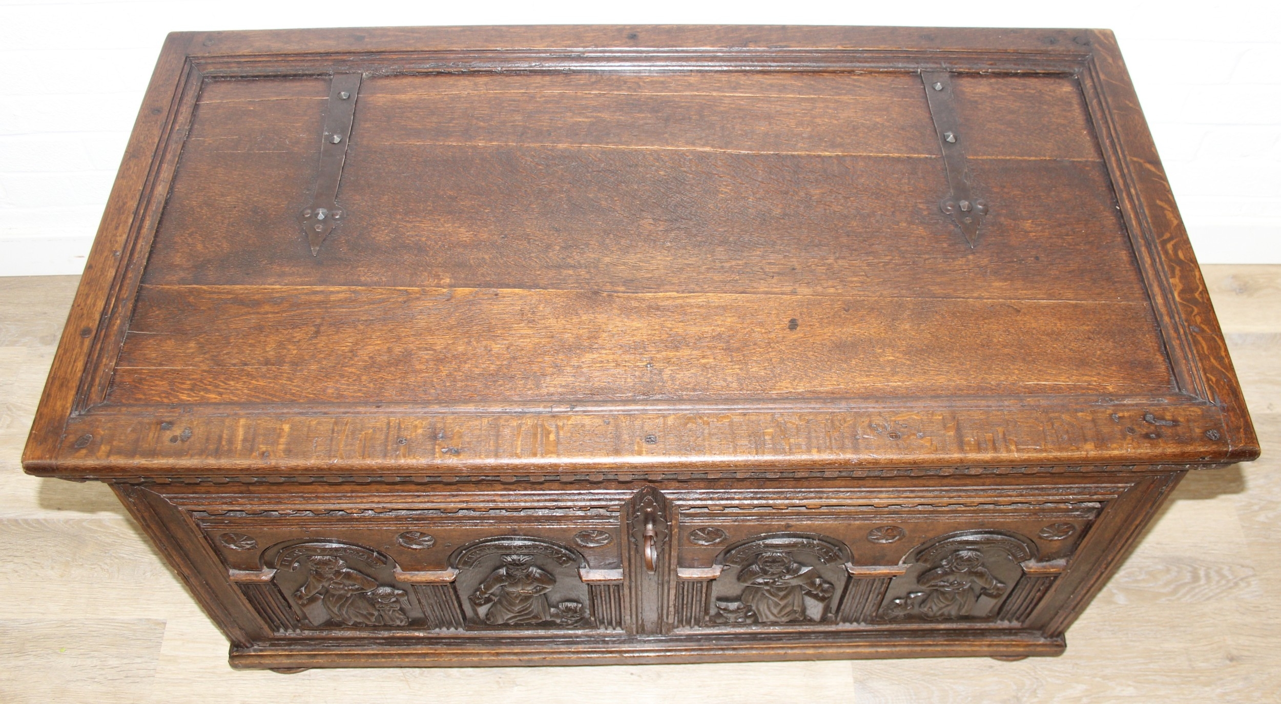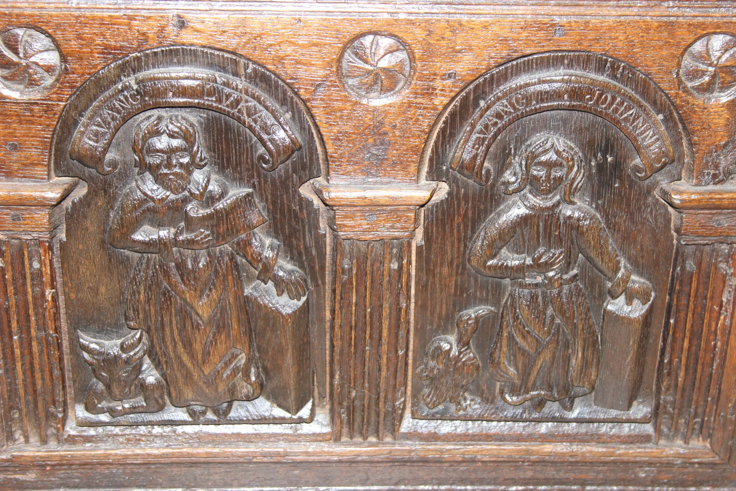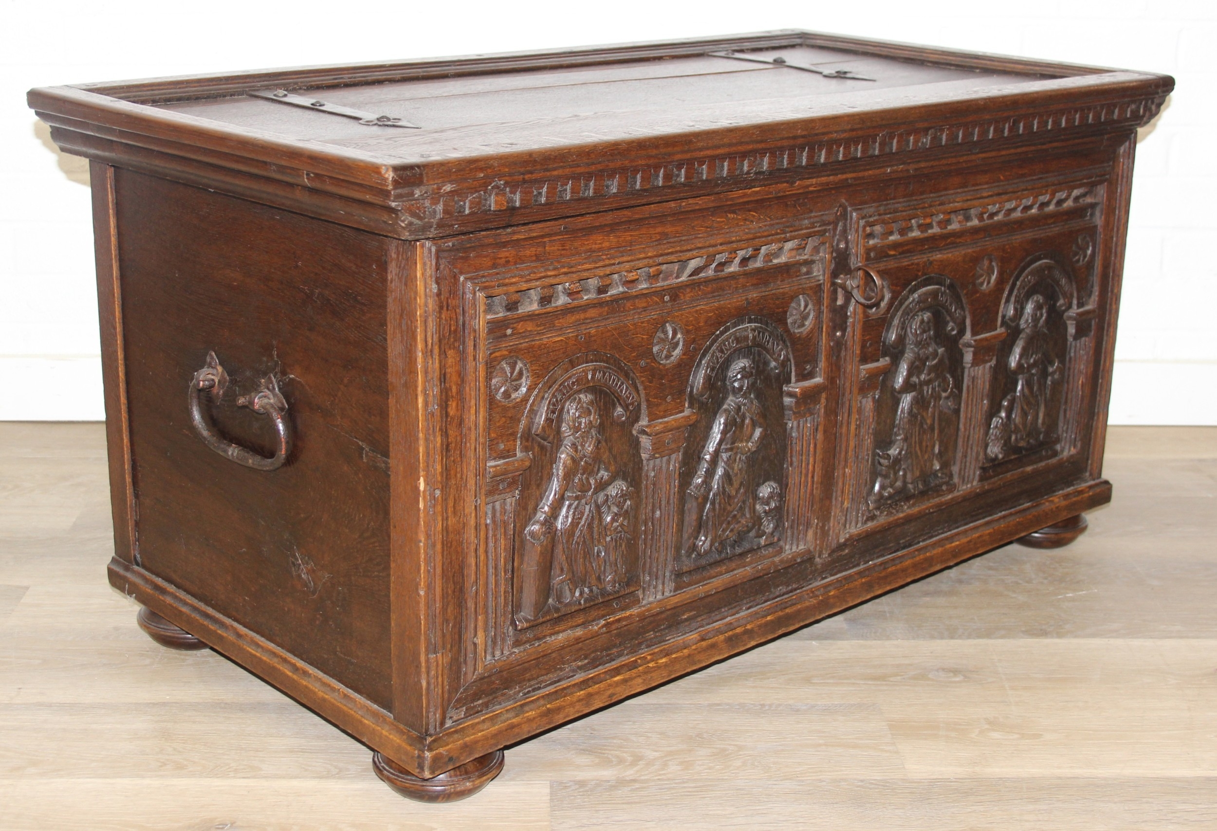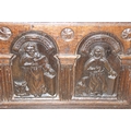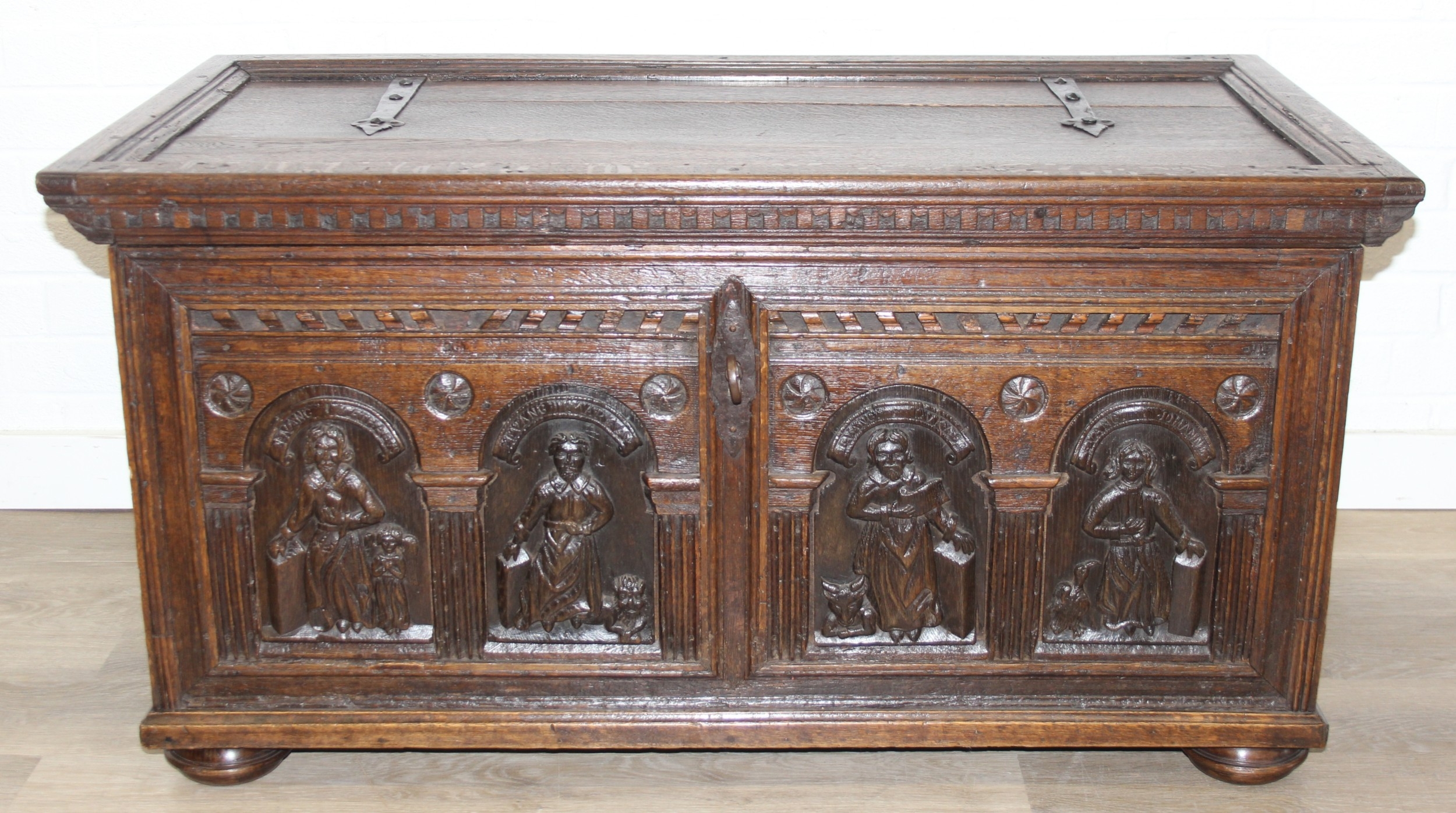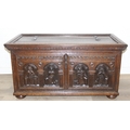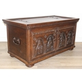 An unusual antique carved oak trunk or coffer depicting the four evangelists or gospels, possibly Italian with interesting lock plate, believed to be 18th century, 114cm x 61cm x 58cm