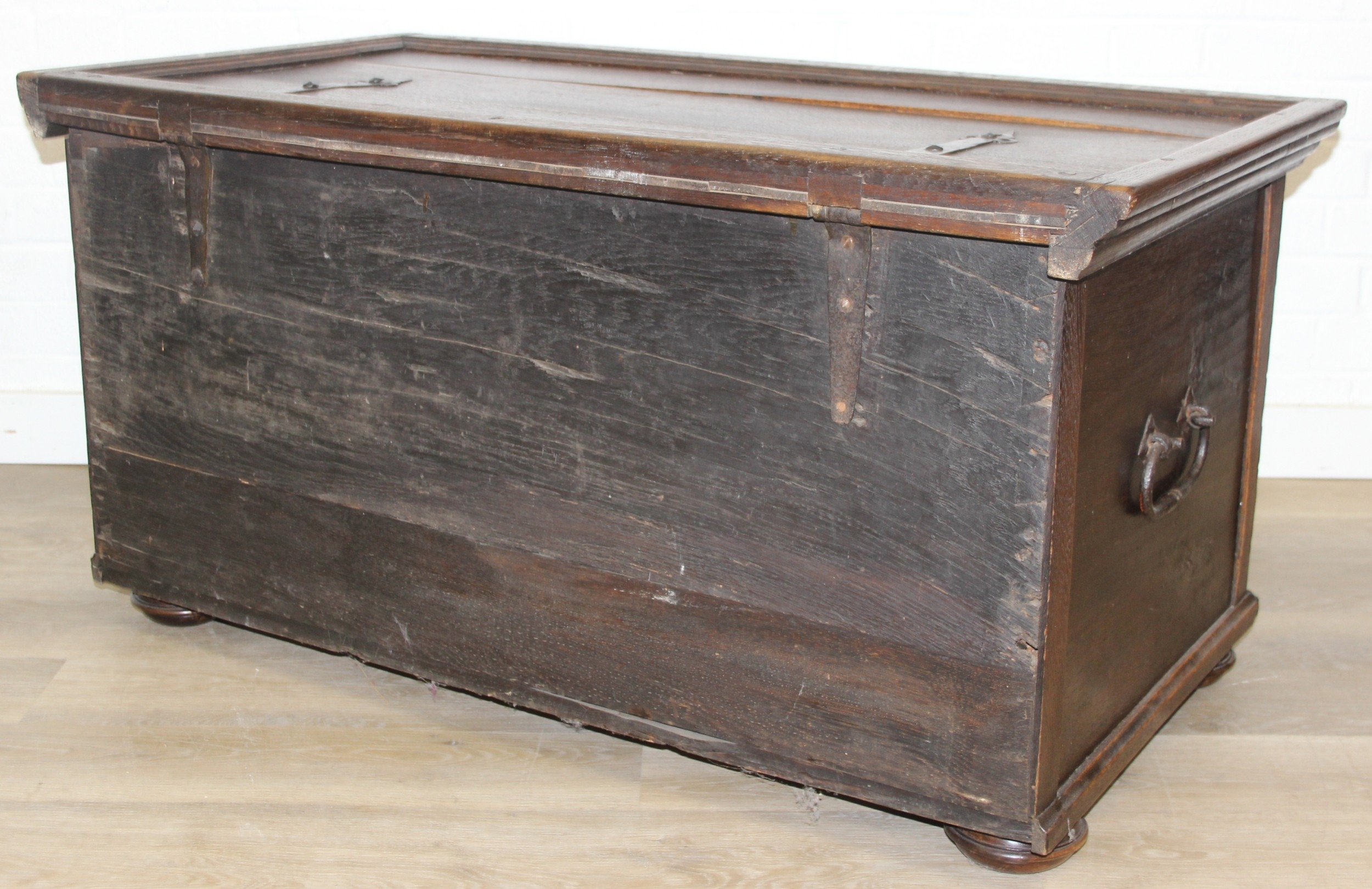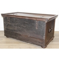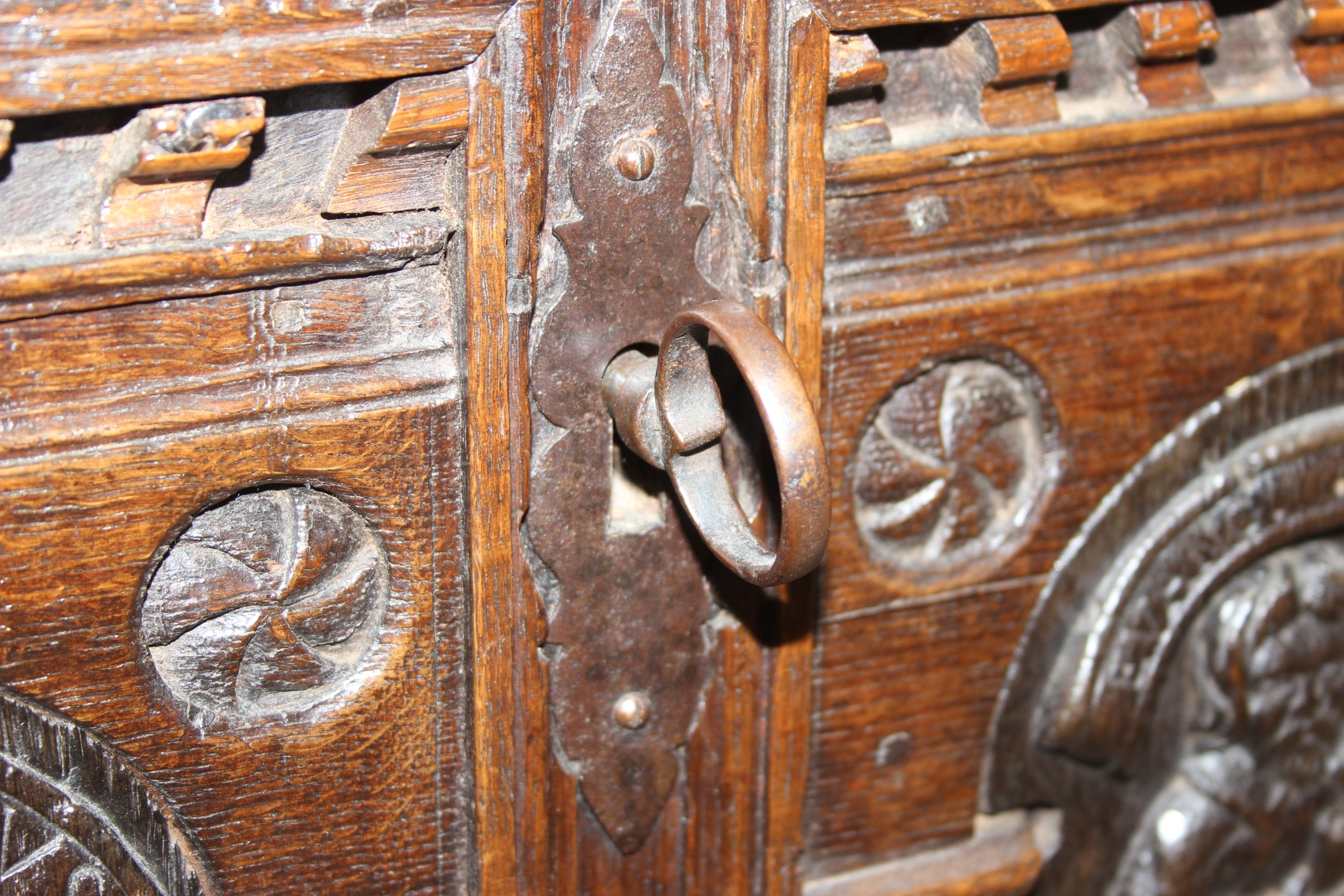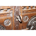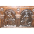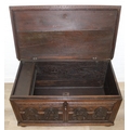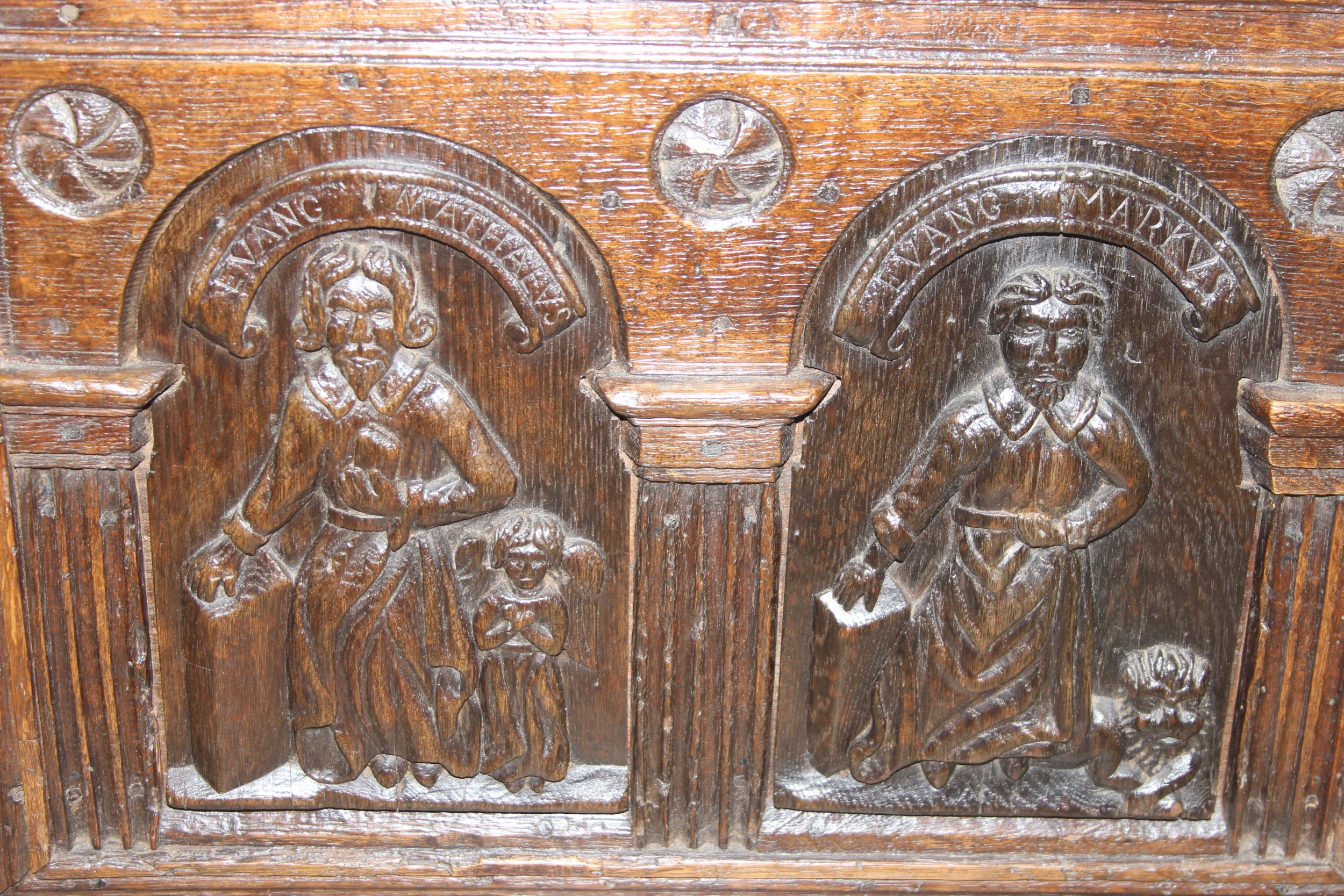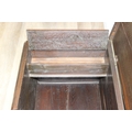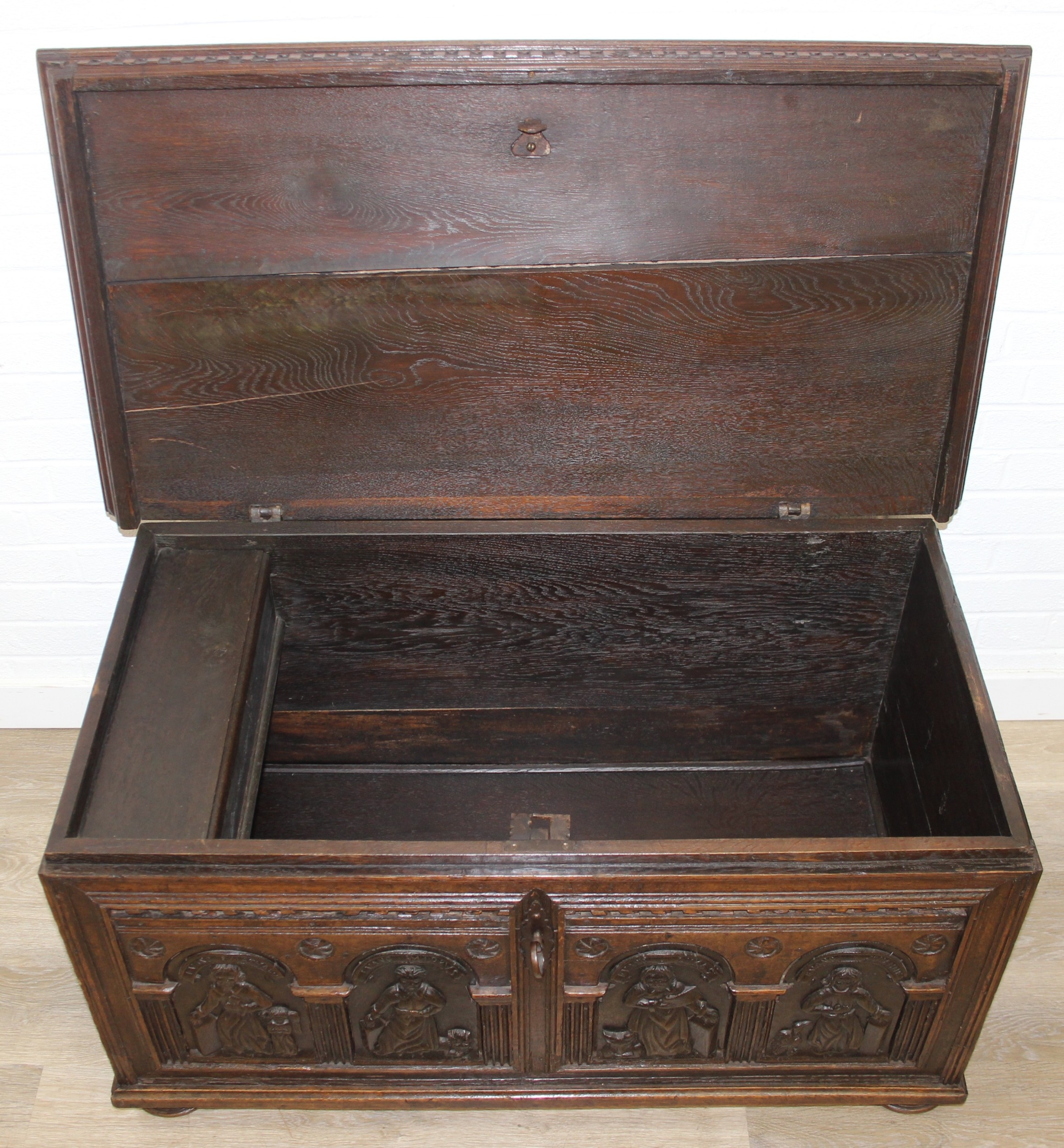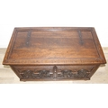 An unusual antique carved oak trunk or coffer depicting the four evangelists or gospels, possibly Italian with interesting lock plate, believed to be 18th century, 114cm x 61cm x 58cm