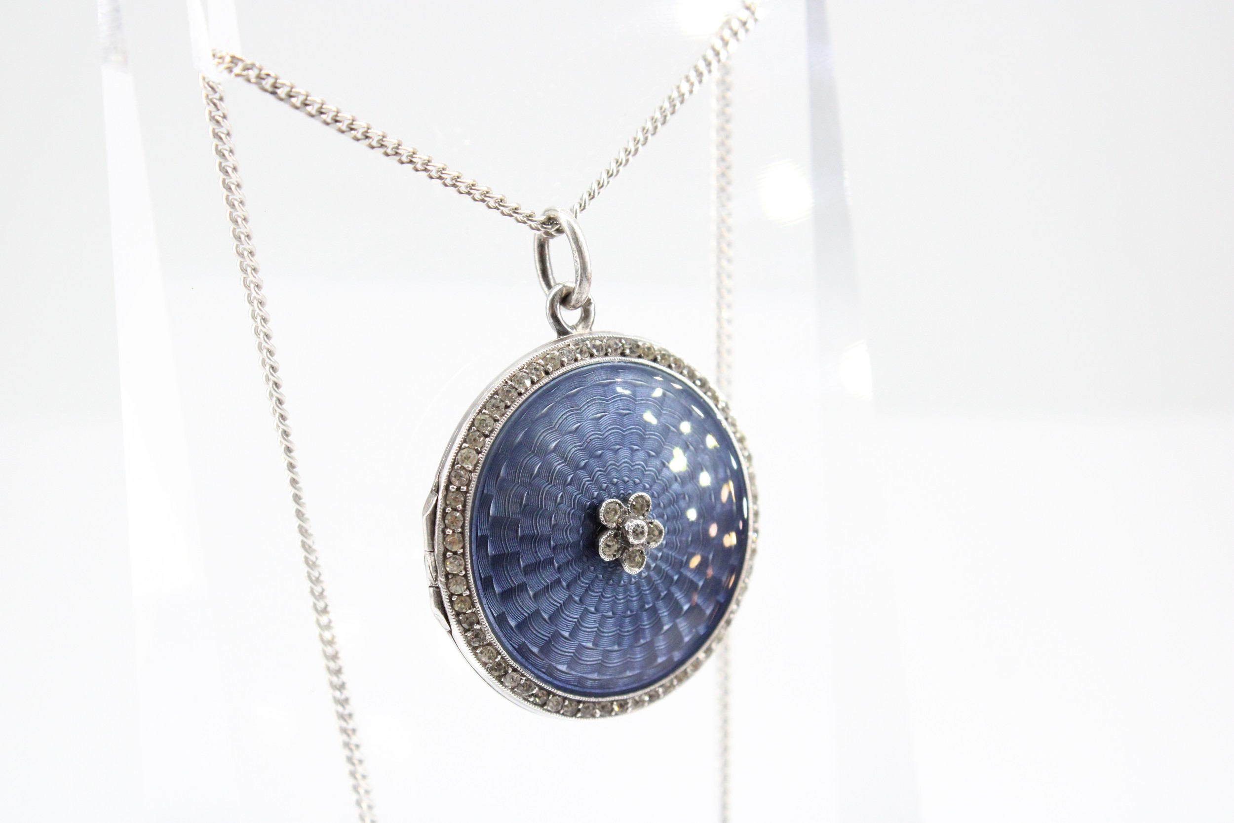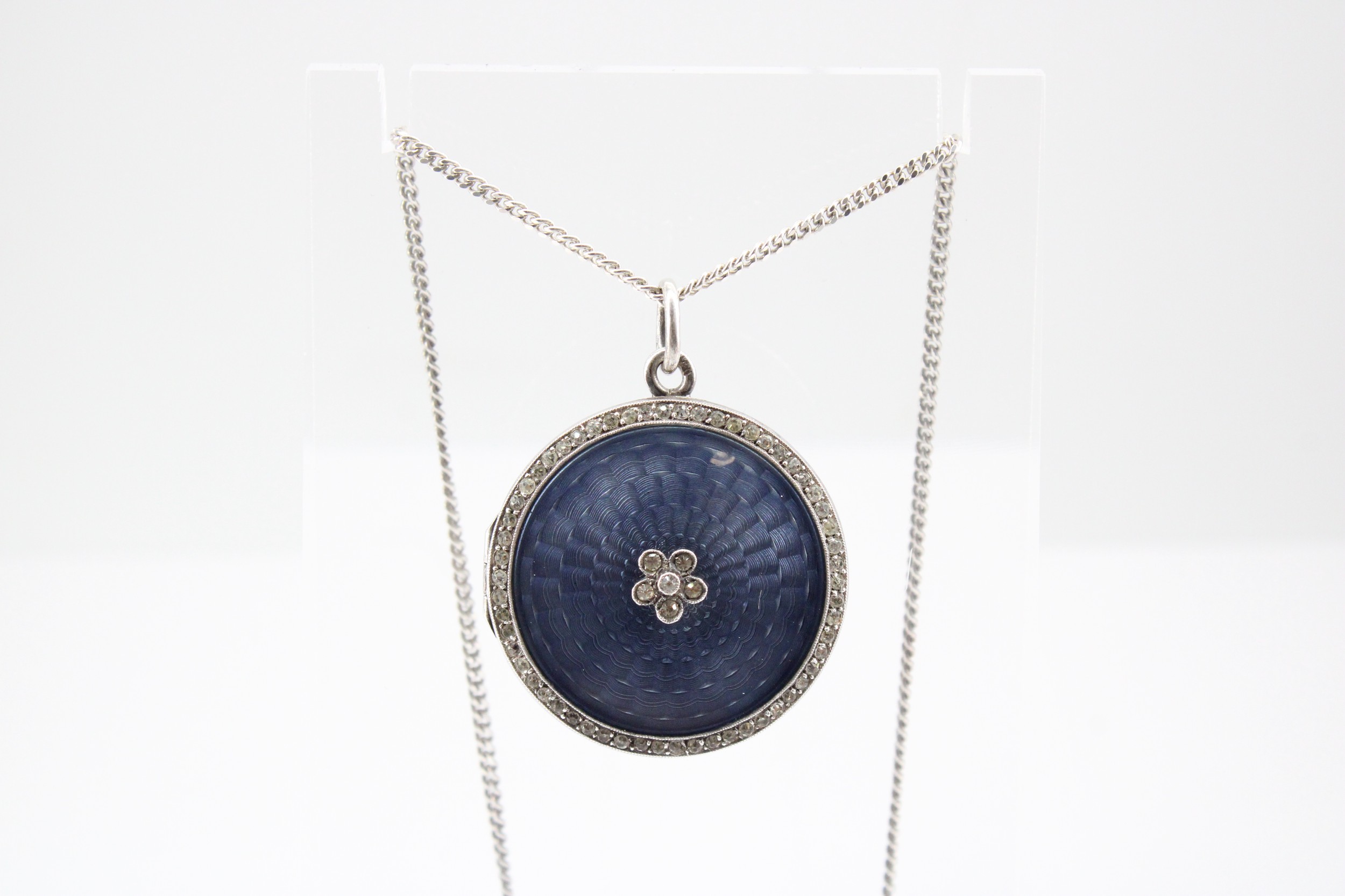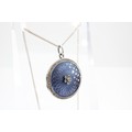 An Edwardian Silver and Blue Guilloche Enamelled Locket on a Modern Silver Chain, Locket approx. 29mm Diameter, Chain 42cms Long
