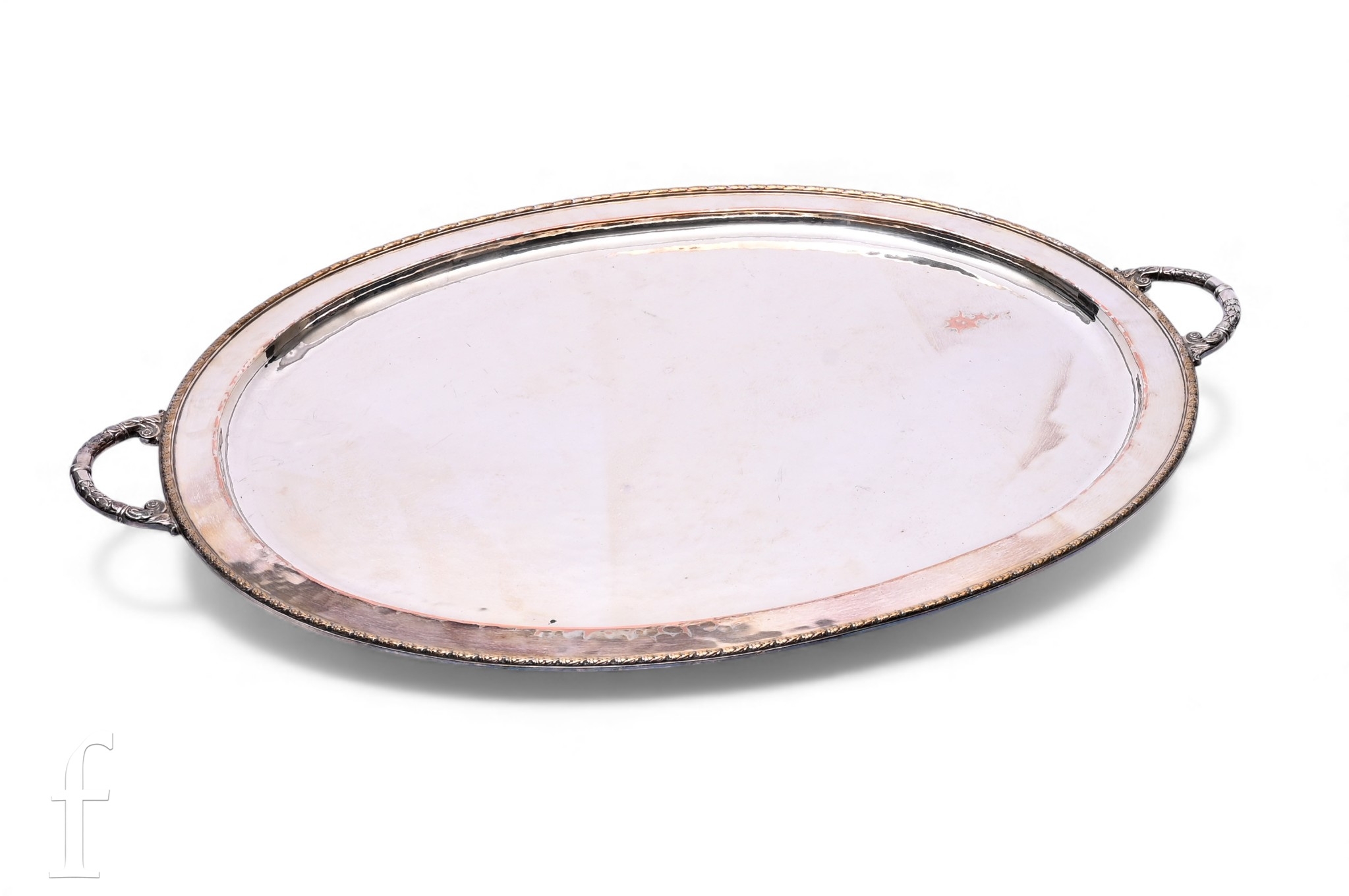 An Arts & Crafts oval plated two handled serving tray, raised border and acanthus leaf handles, width 32cm.
