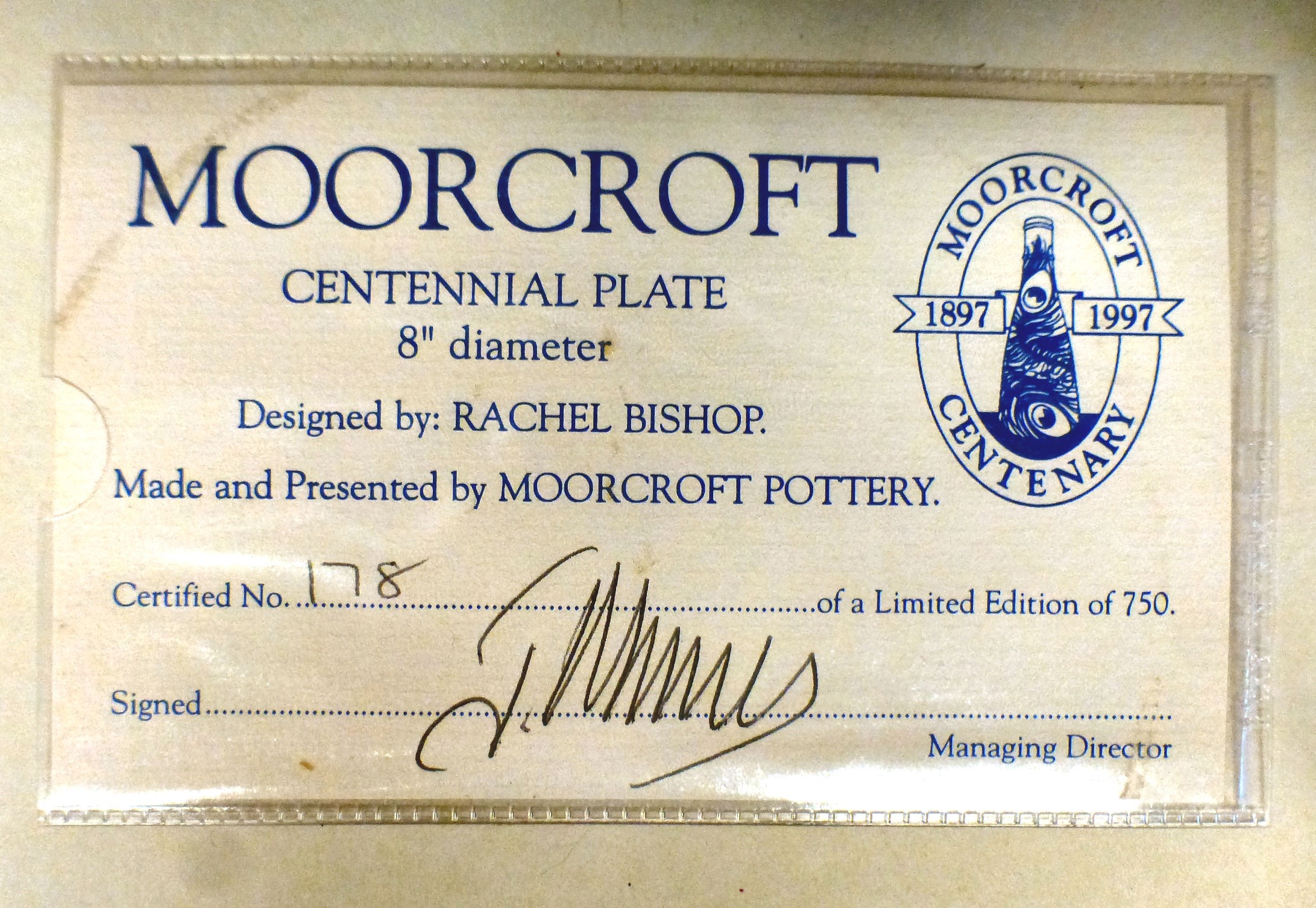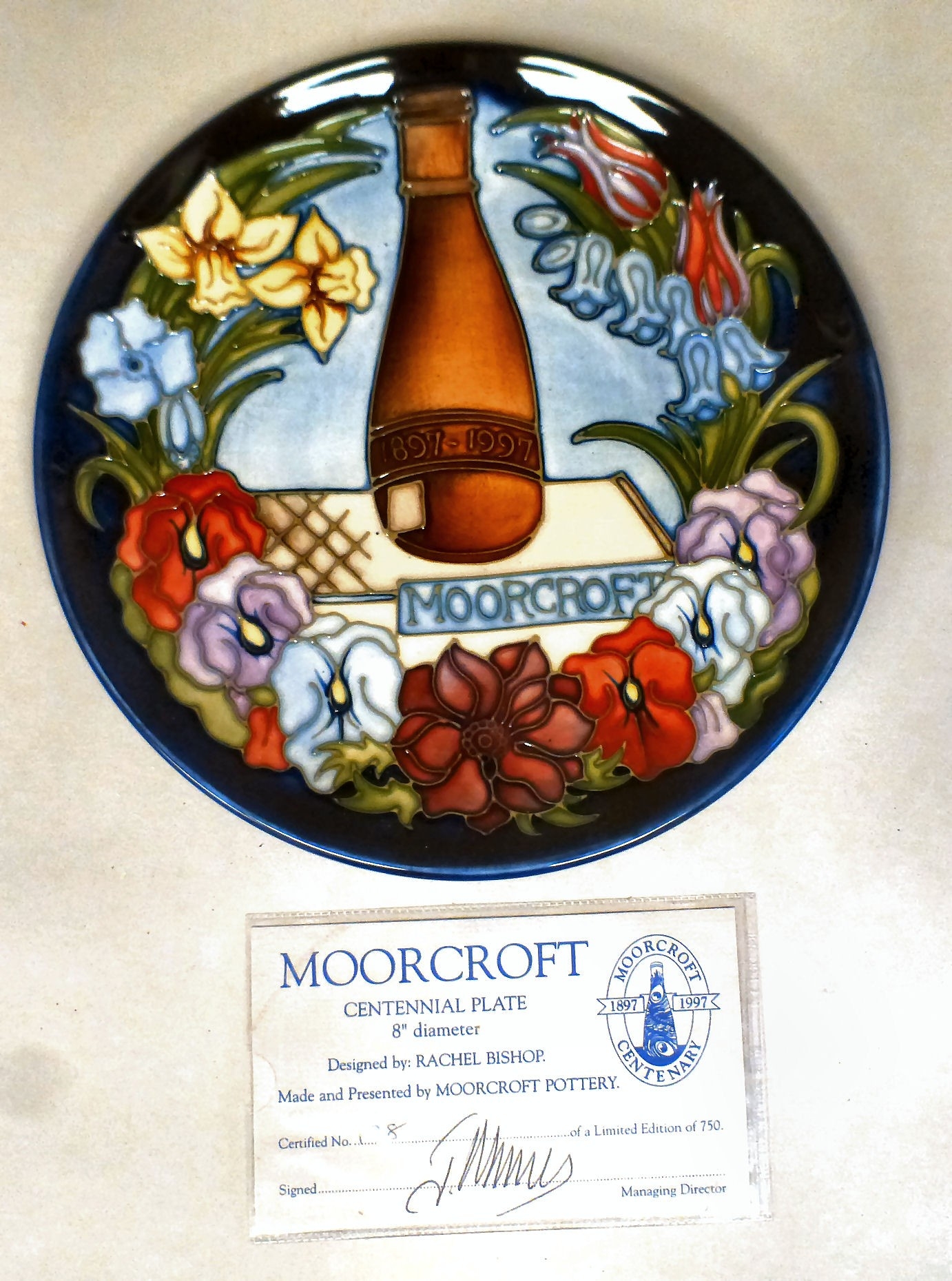 A Moorcroft pottery Centennial plate bears marks Limited 744/750 1897-1997 8"dia