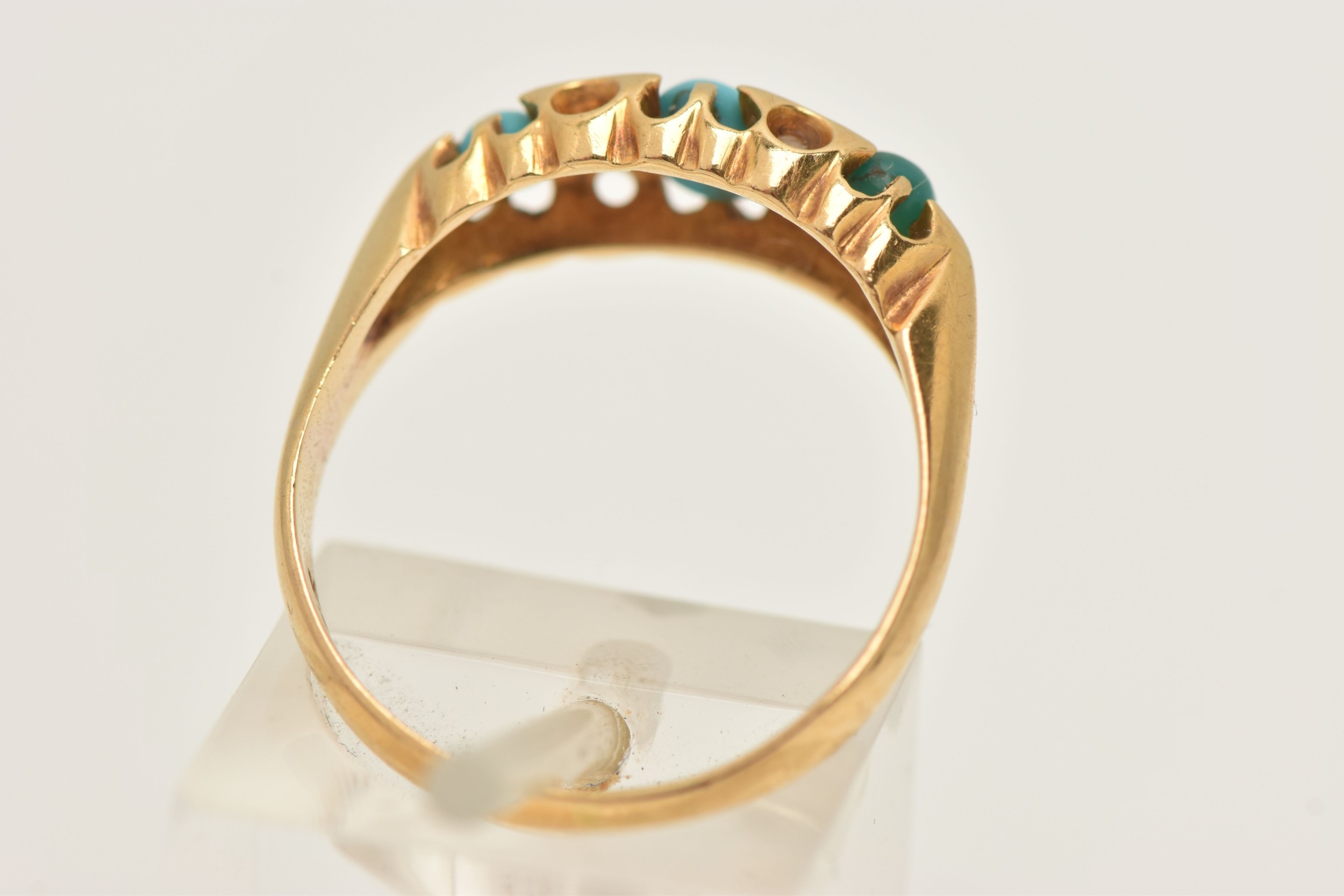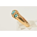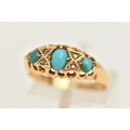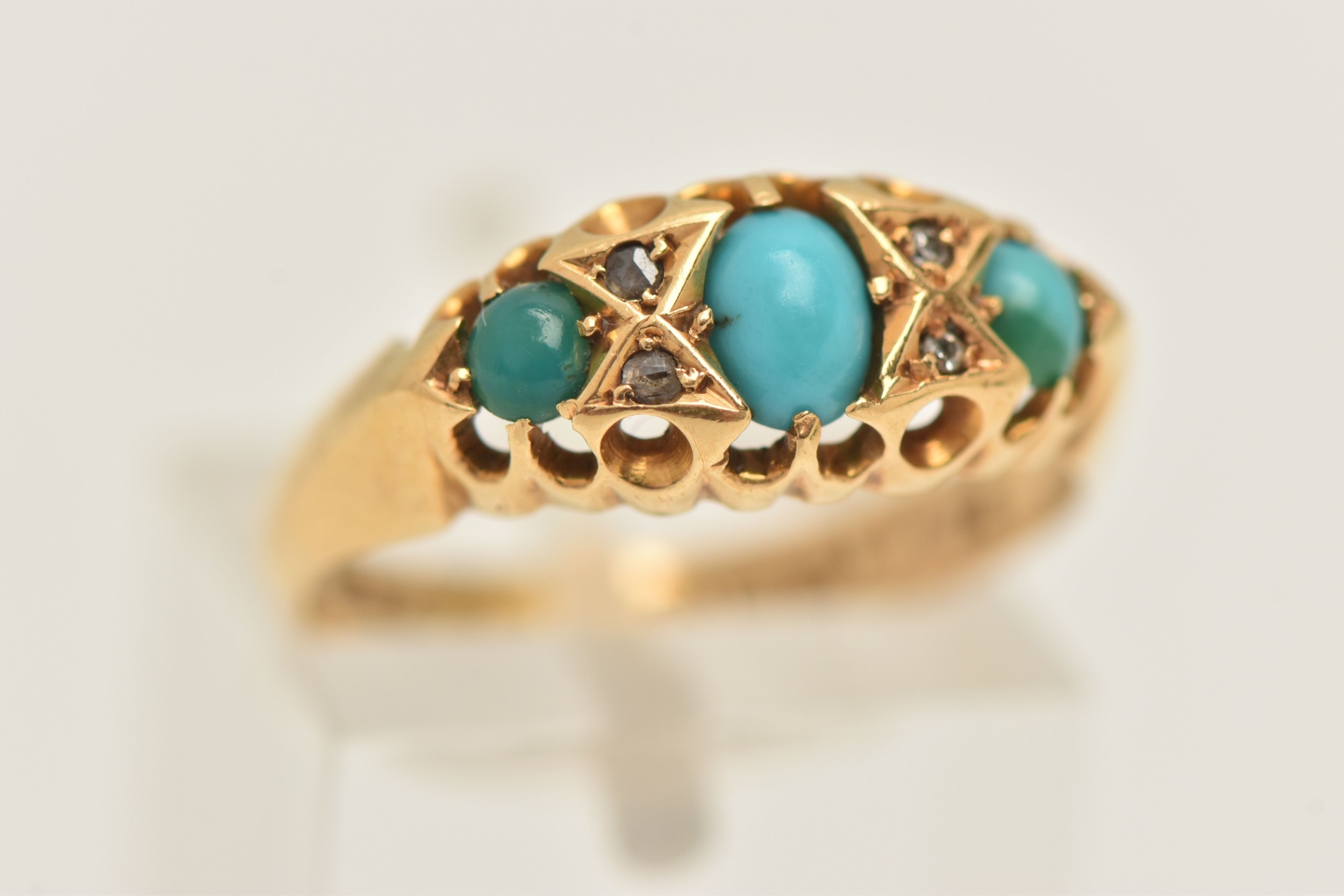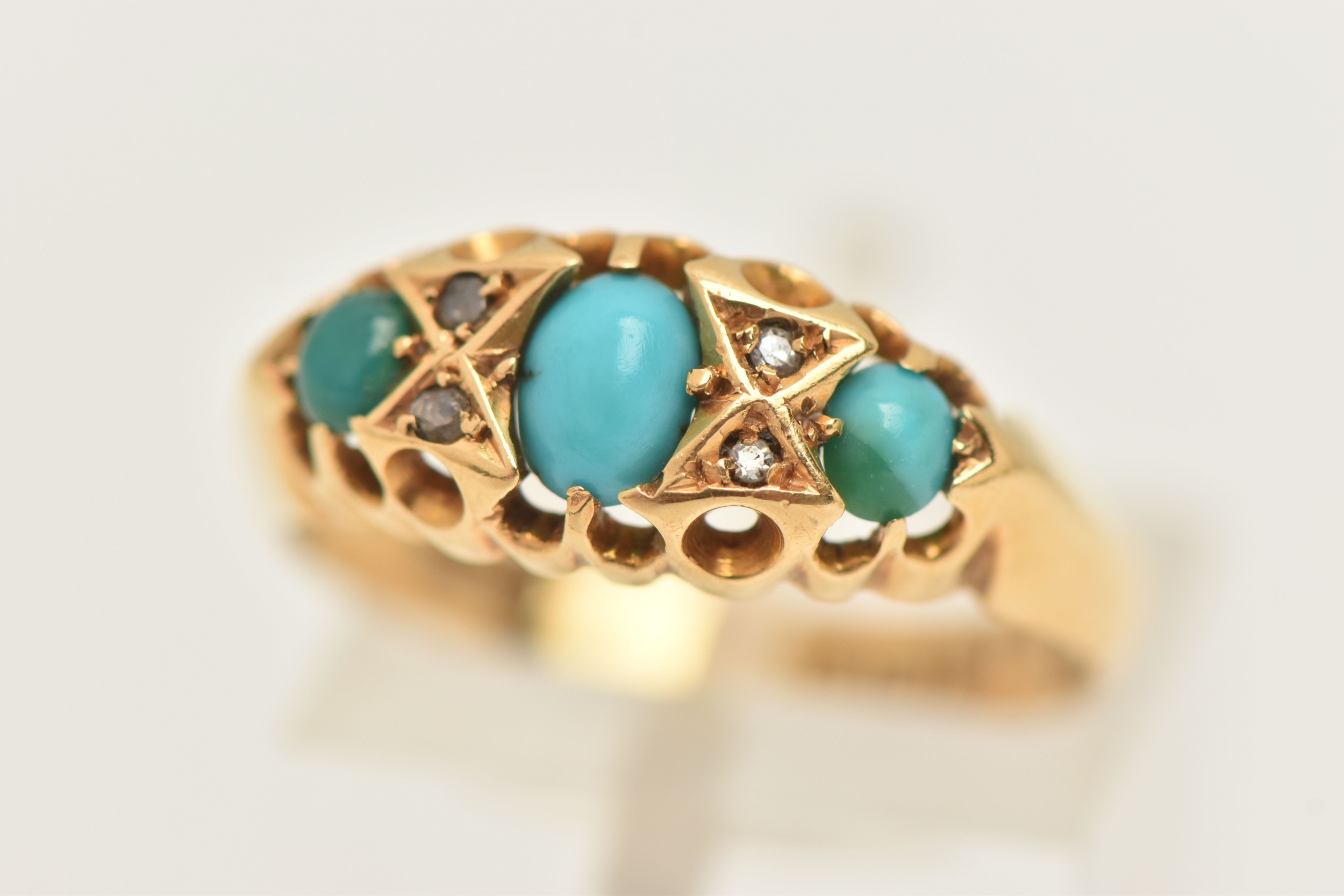 AN EARLY 20TH CENTURY 18CT GOLD TURQUOISE AND DIAMOND RING, set with three oval cut turquoise cabochons, two small rose cut diamonds and two single cut diamonds, each in a claw setting, open work gallery and polished band, hallmarked 18ct Birmingham 1919, ring size N, approximate gross weight 3.4 grams (condition report: band has a small split near one shoulder, general wear in keeping with age, single cut diamonds possibly added later)