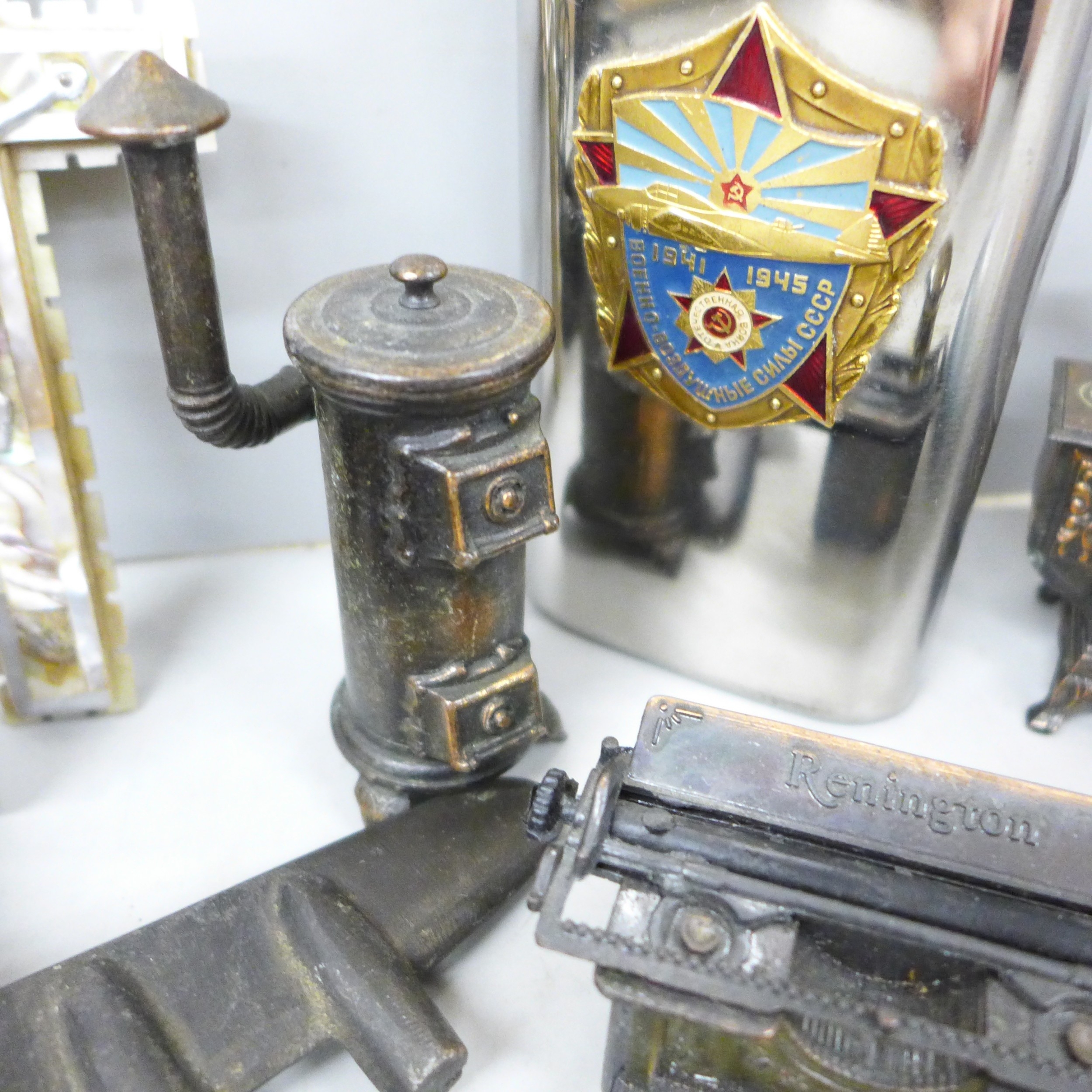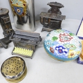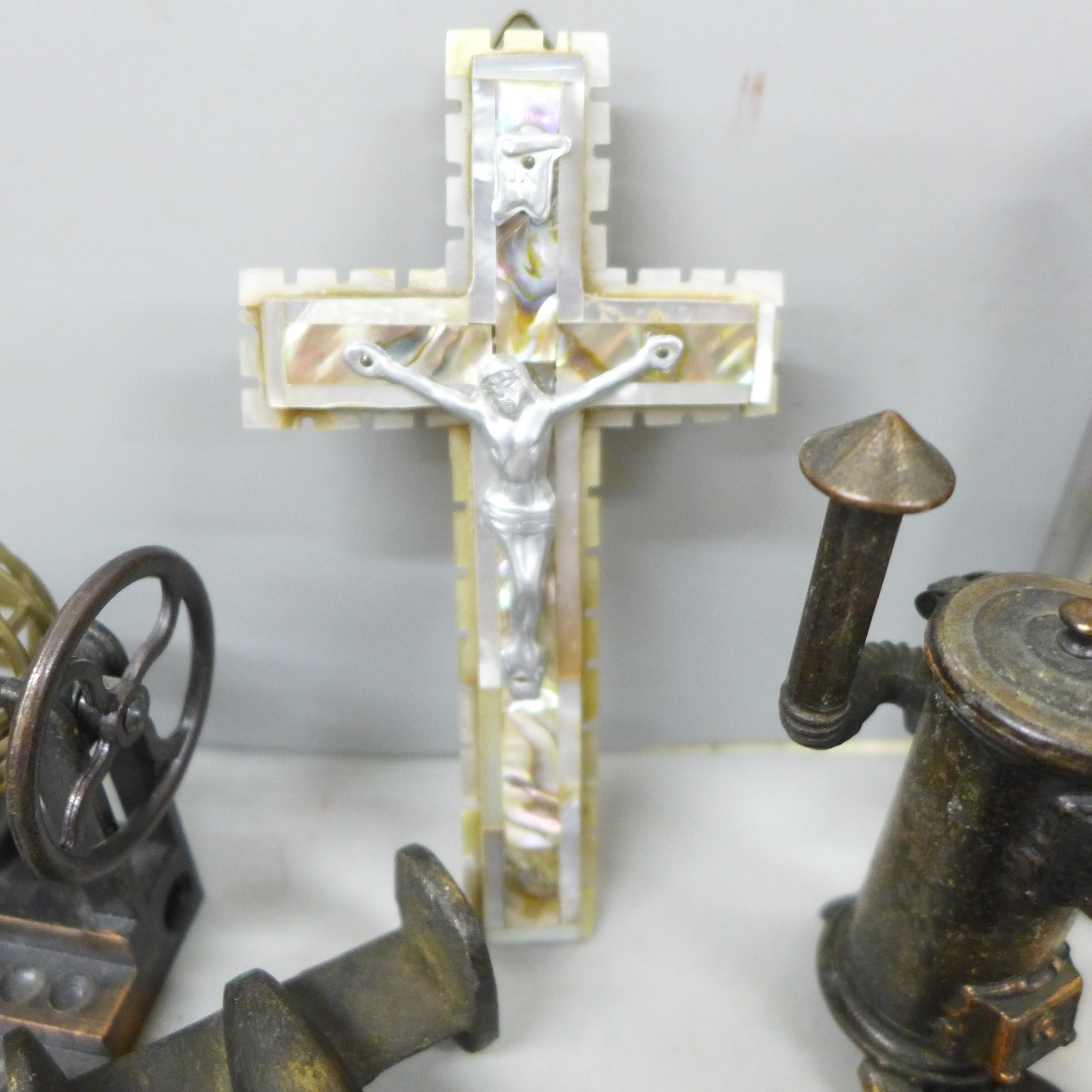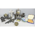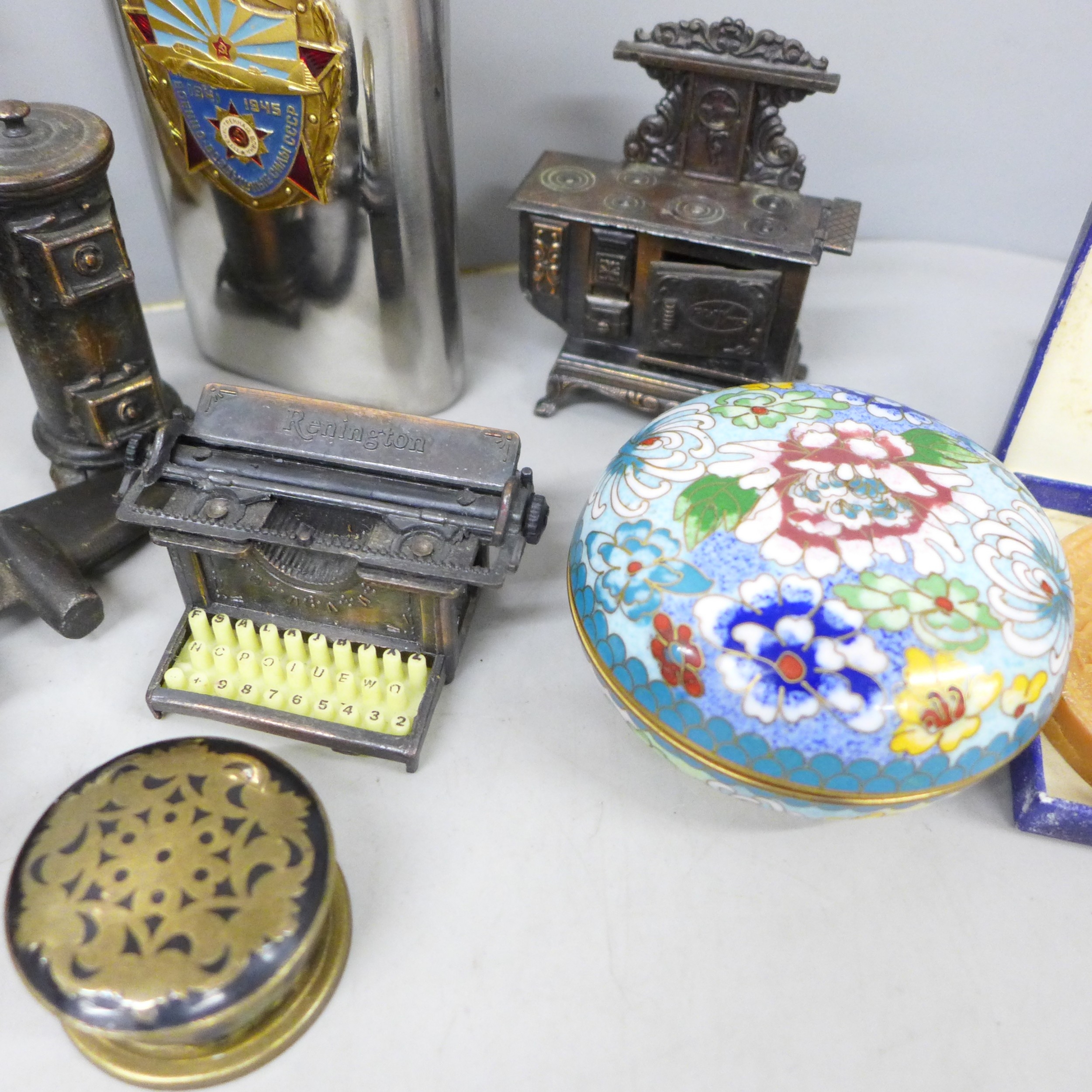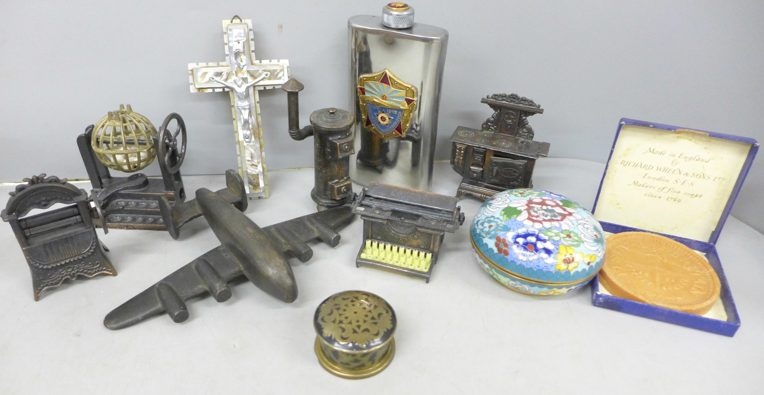 A cloisonné lidded pot, novelty pencil sharpeners, a mother of Pearl crucifix marked Bethlehem, a Russian hip flask, novelty Festival of Britain soap, a metal model aircraft and a small brass mounted pot