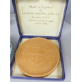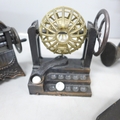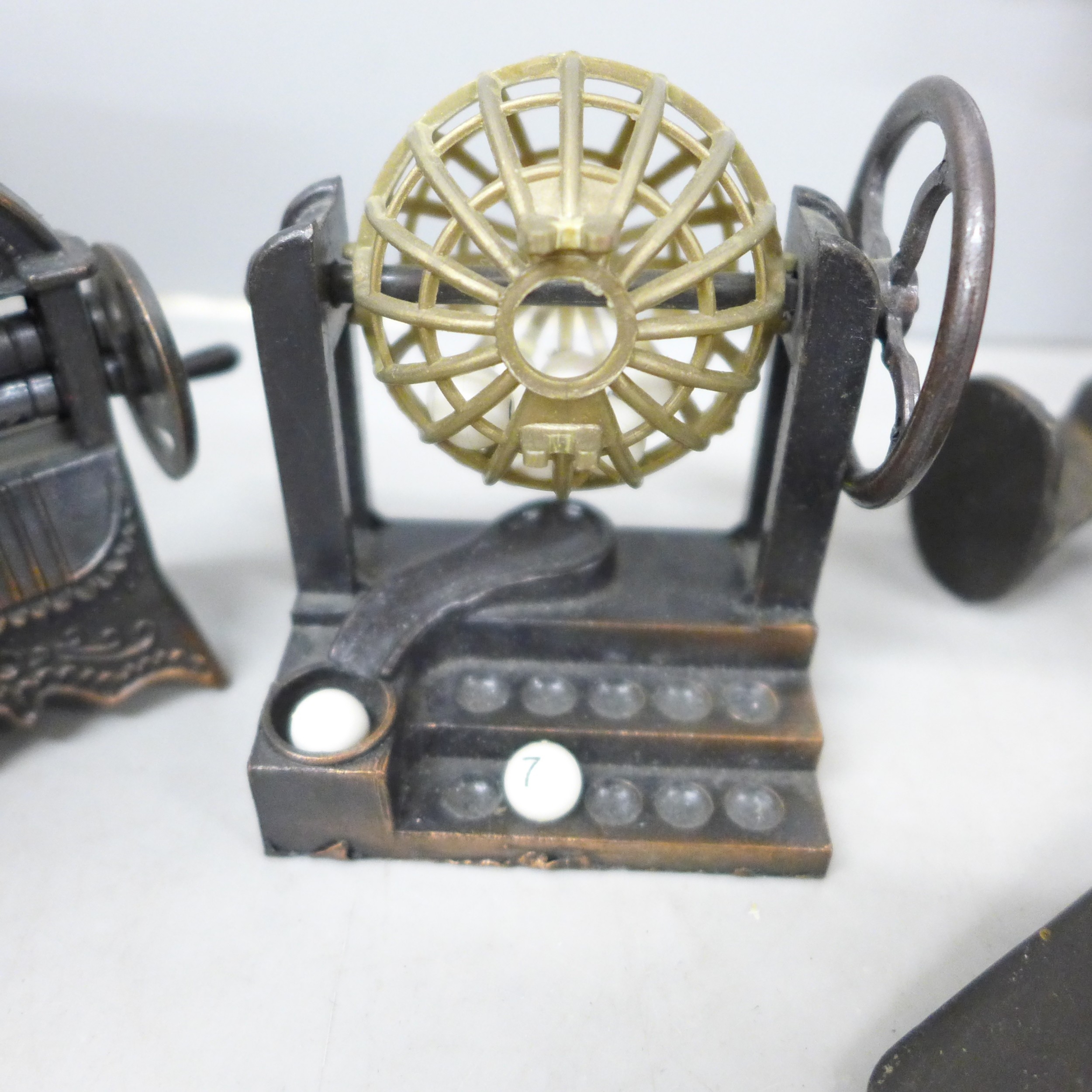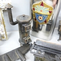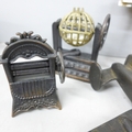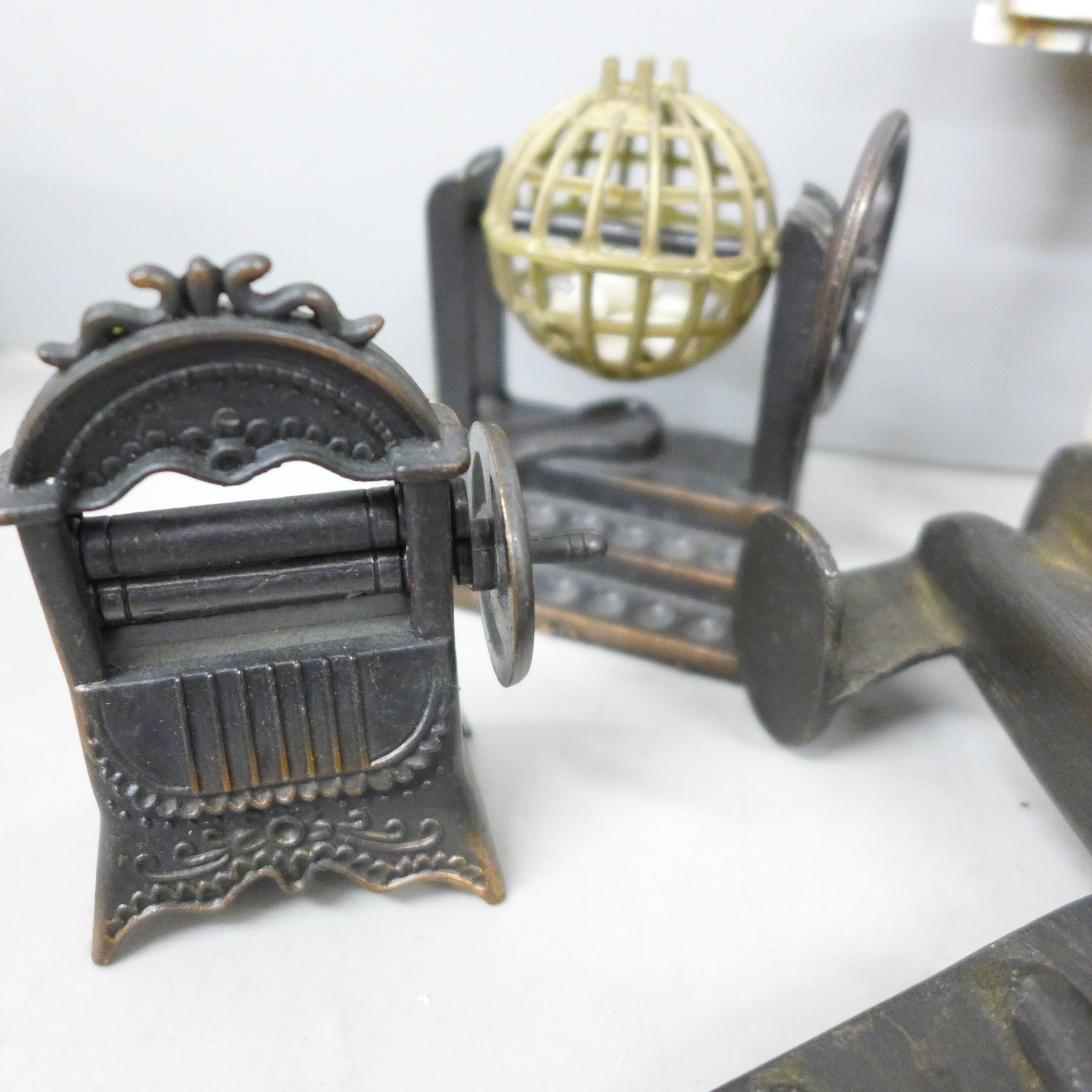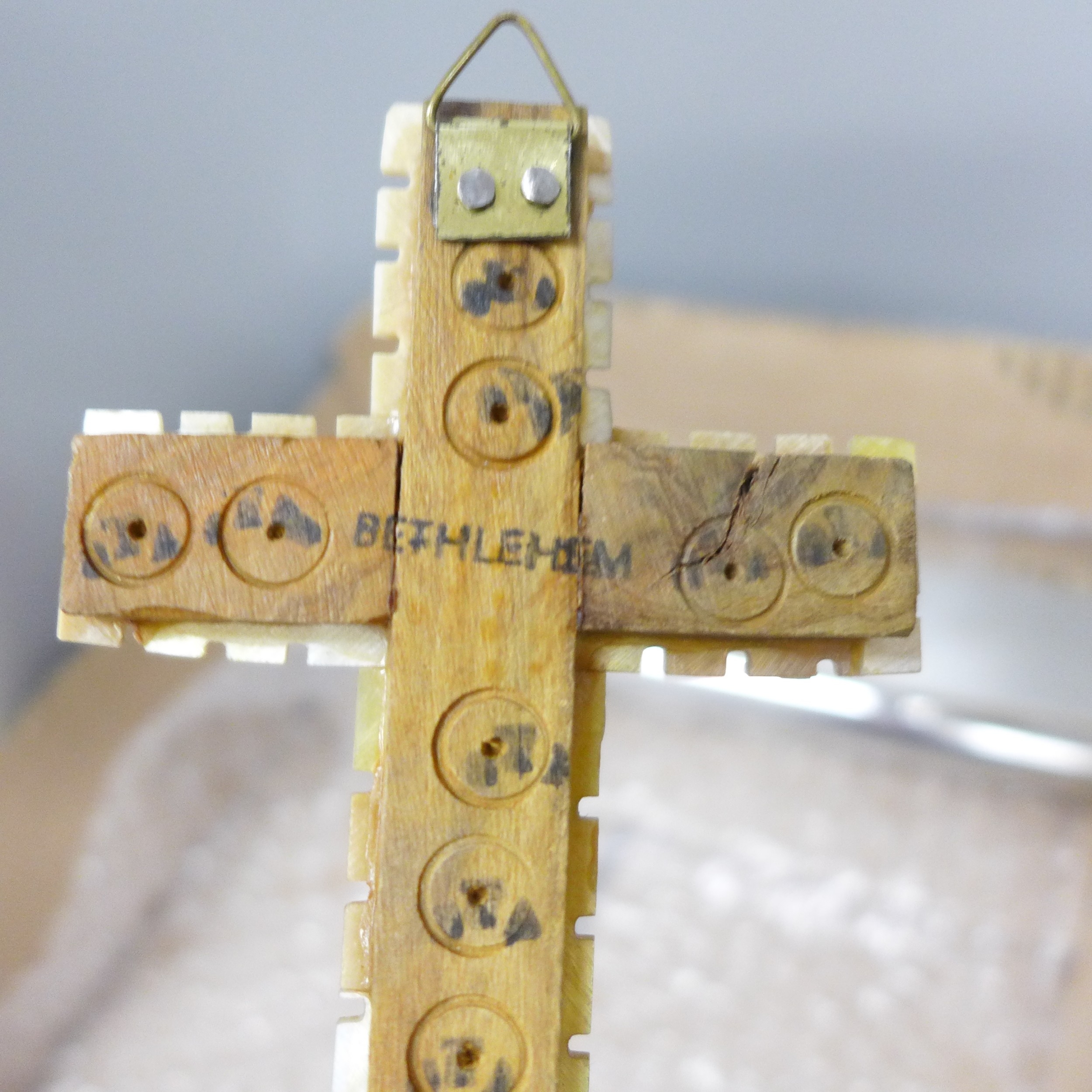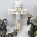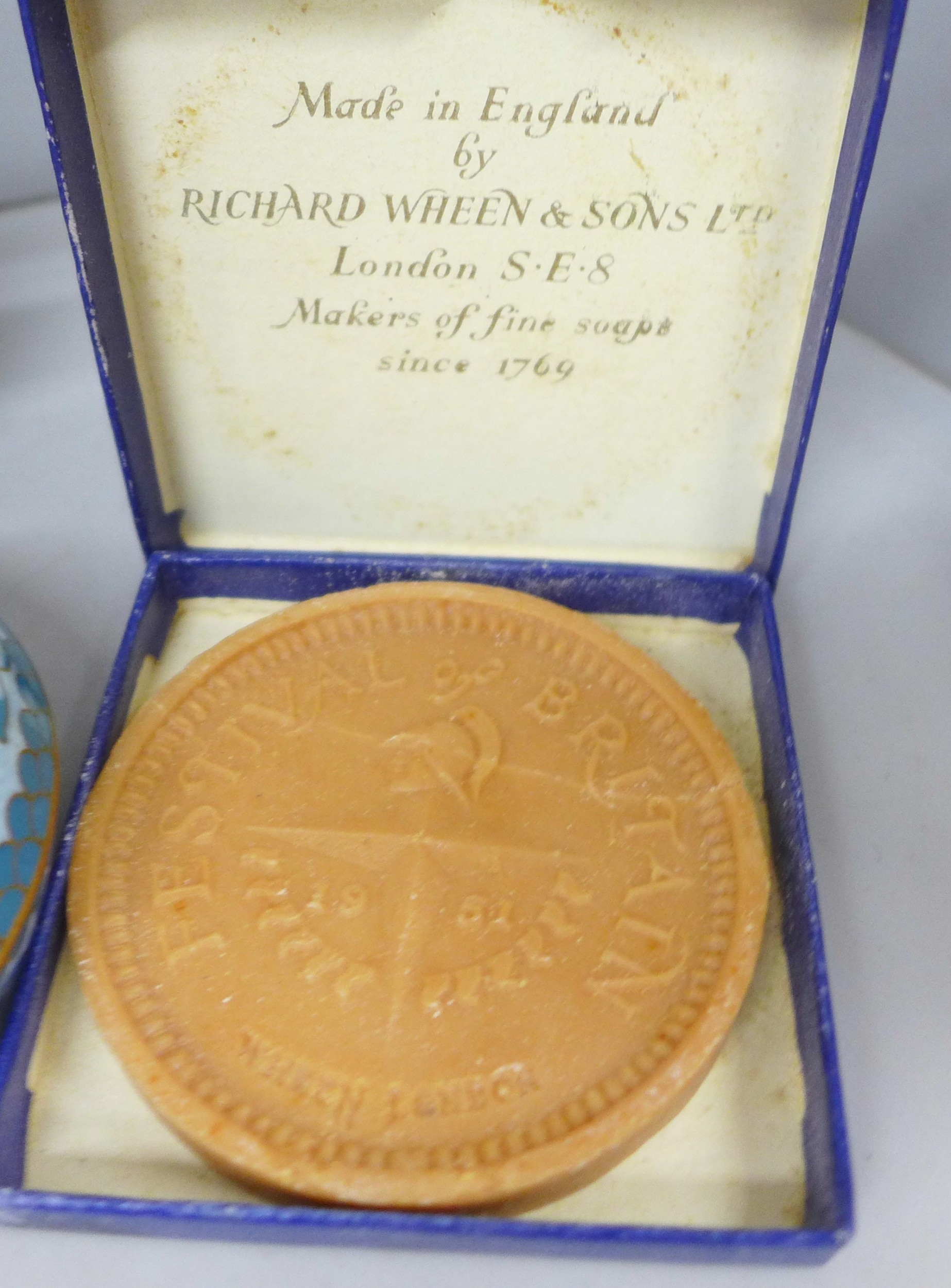 A cloisonné lidded pot, novelty pencil sharpeners, a mother of Pearl crucifix marked Bethlehem, a Russian hip flask, novelty Festival of Britain soap, a metal model aircraft and a small brass mounted pot