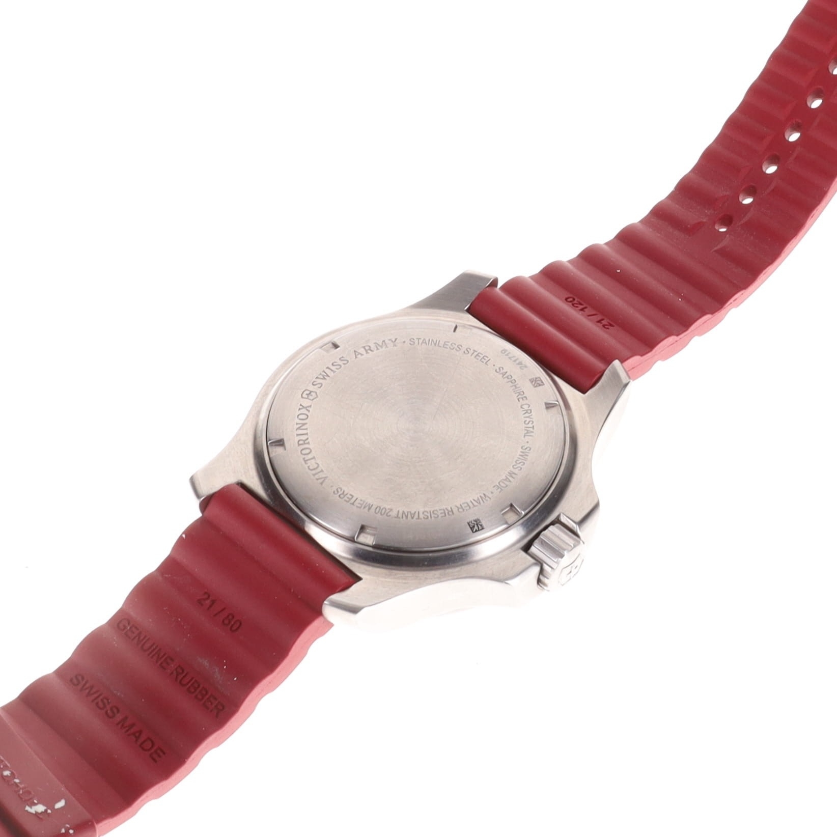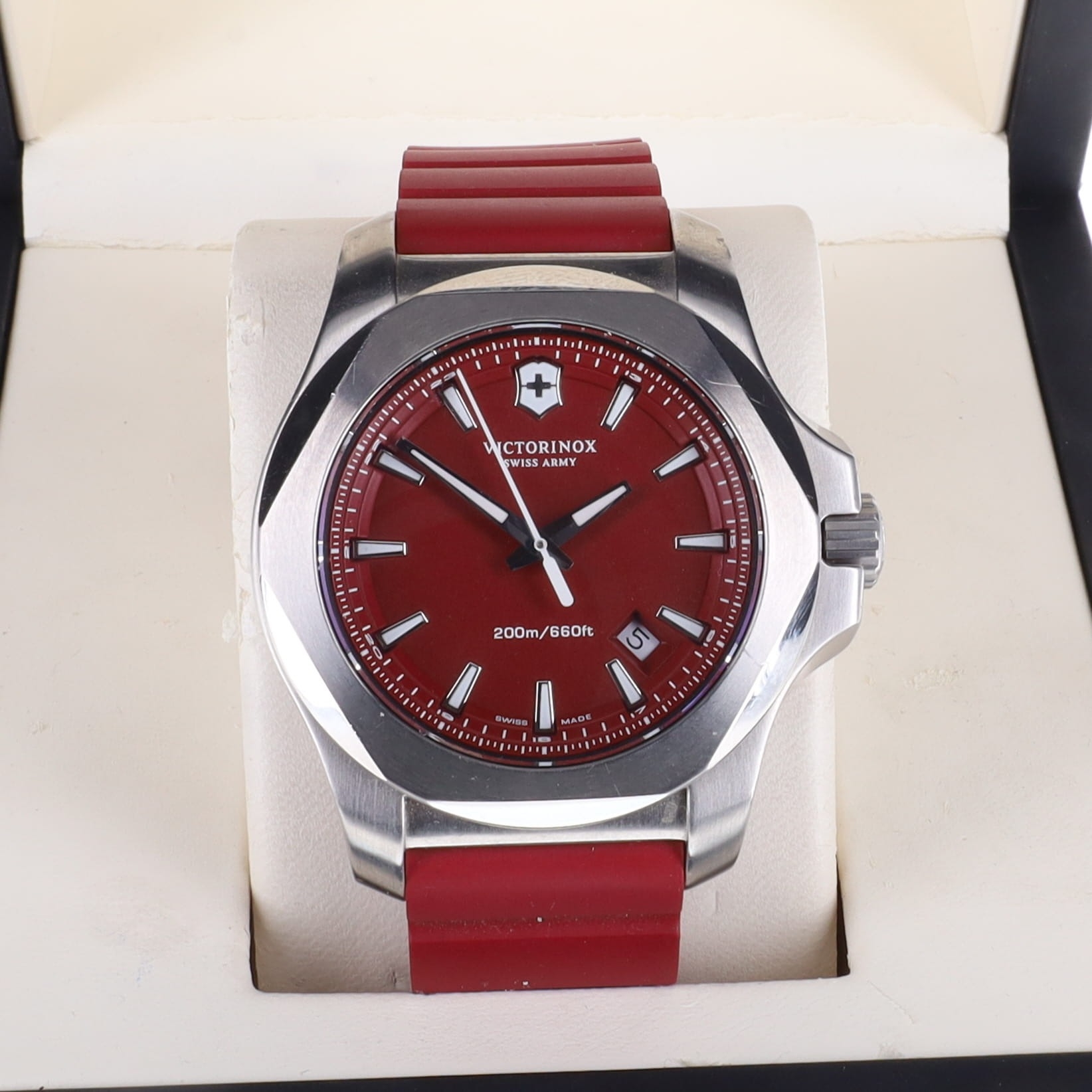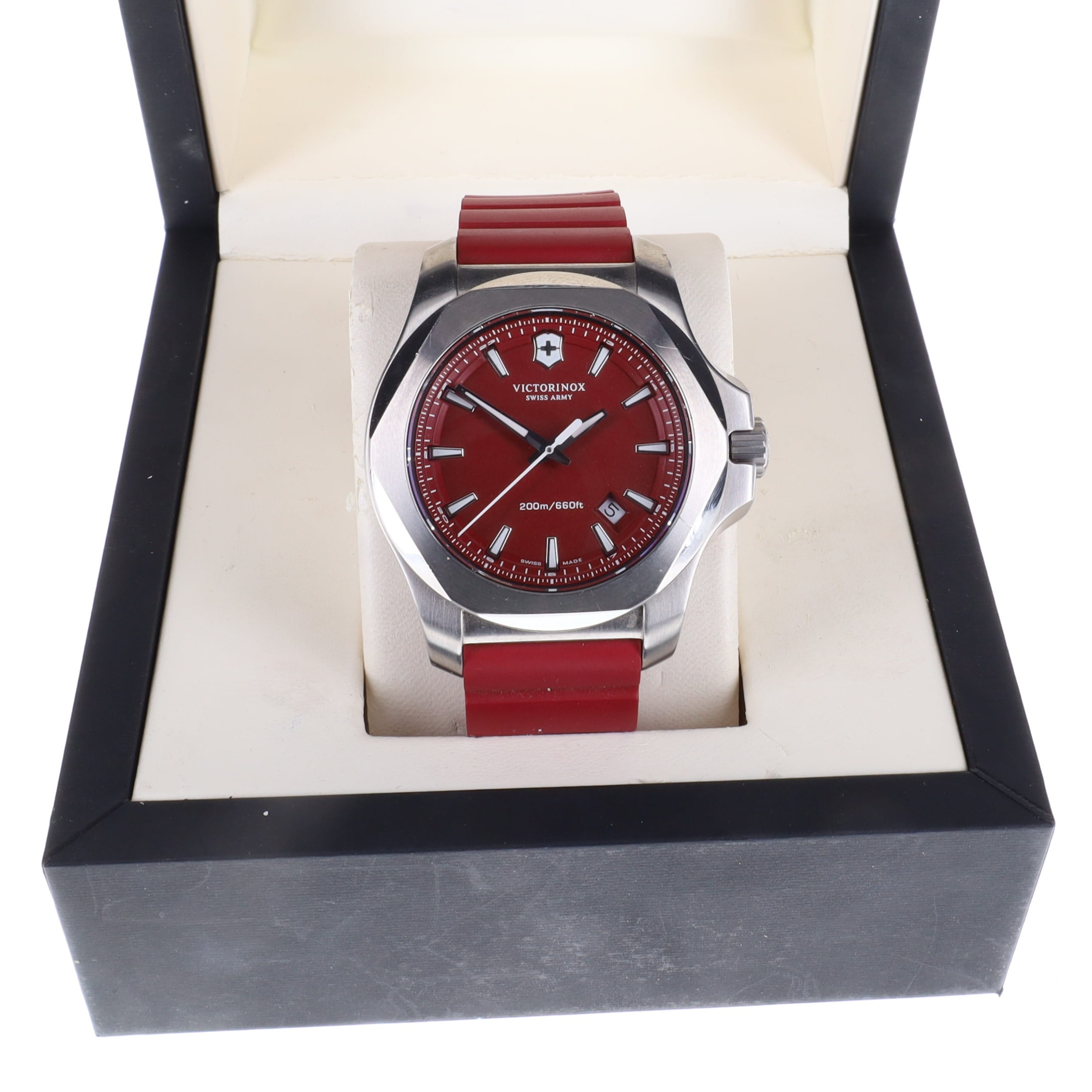Victorinox Swiss Army - Inox 200m Diver's Quartz Watch. Ronda quartz movement. Case made from stainless steel, red rubber strap. Sapphire crystal. Fixed bezel. Red dial with silver lumed hands and hour markers, date window in between 4 and 5 o'clock. Dial signed 'Victorinox Swiss Army 200m/660ft' in white font. Screw down crown and quick set date function. Watch is in full working order. Box and warranty booklet included.